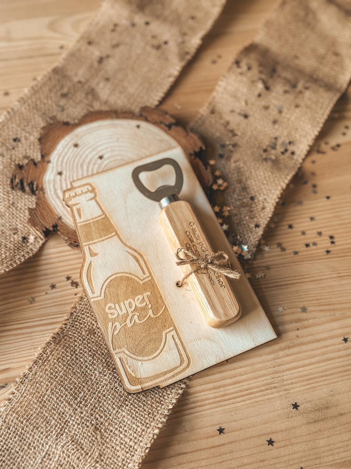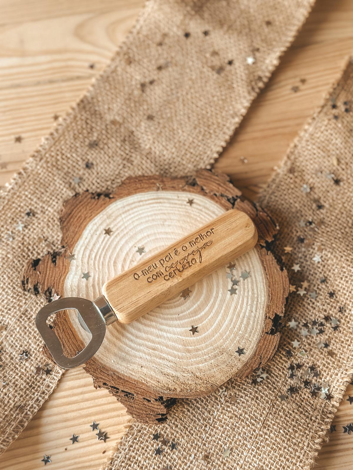 • Abridor de garrafas de madeira com base gravada e decoração rústica