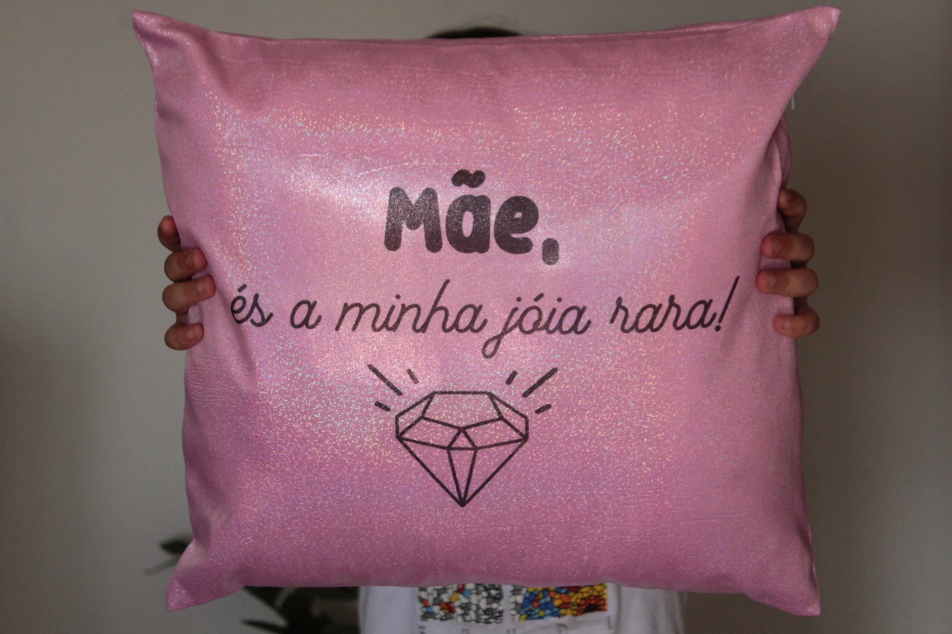 • Almofada rosa com texto em português e desenho de diamante