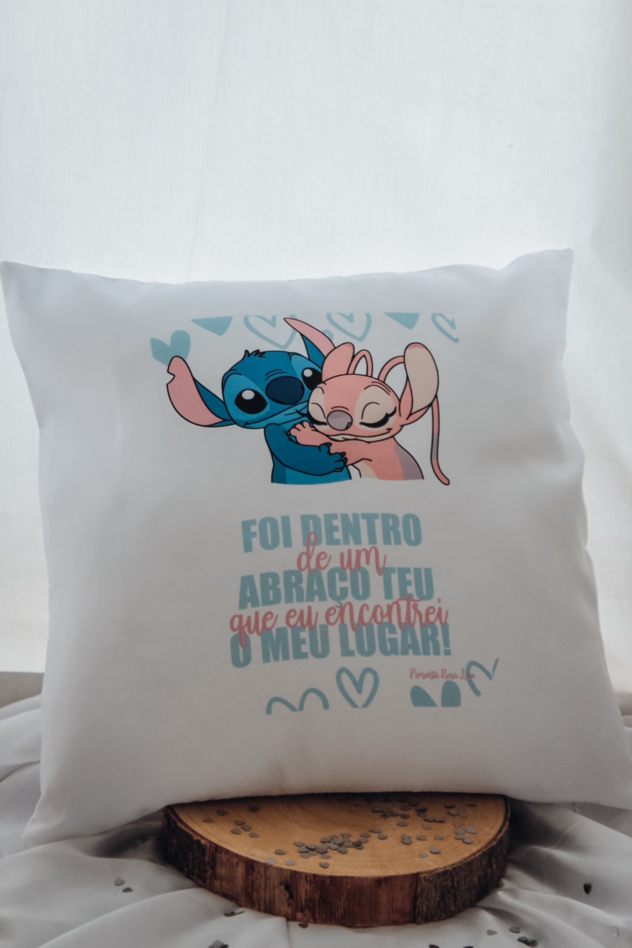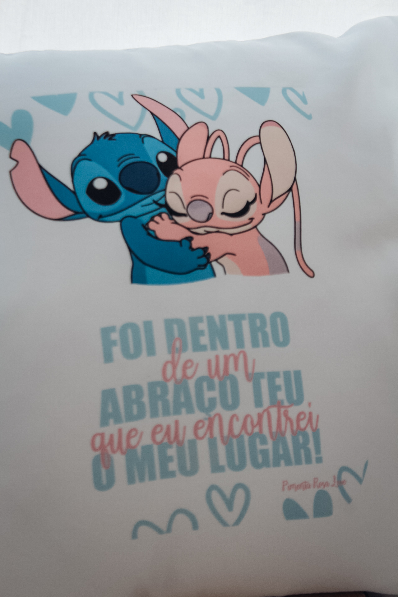 • Almofada branca com personagens cartunescas a abraçarem-se e texto em português.