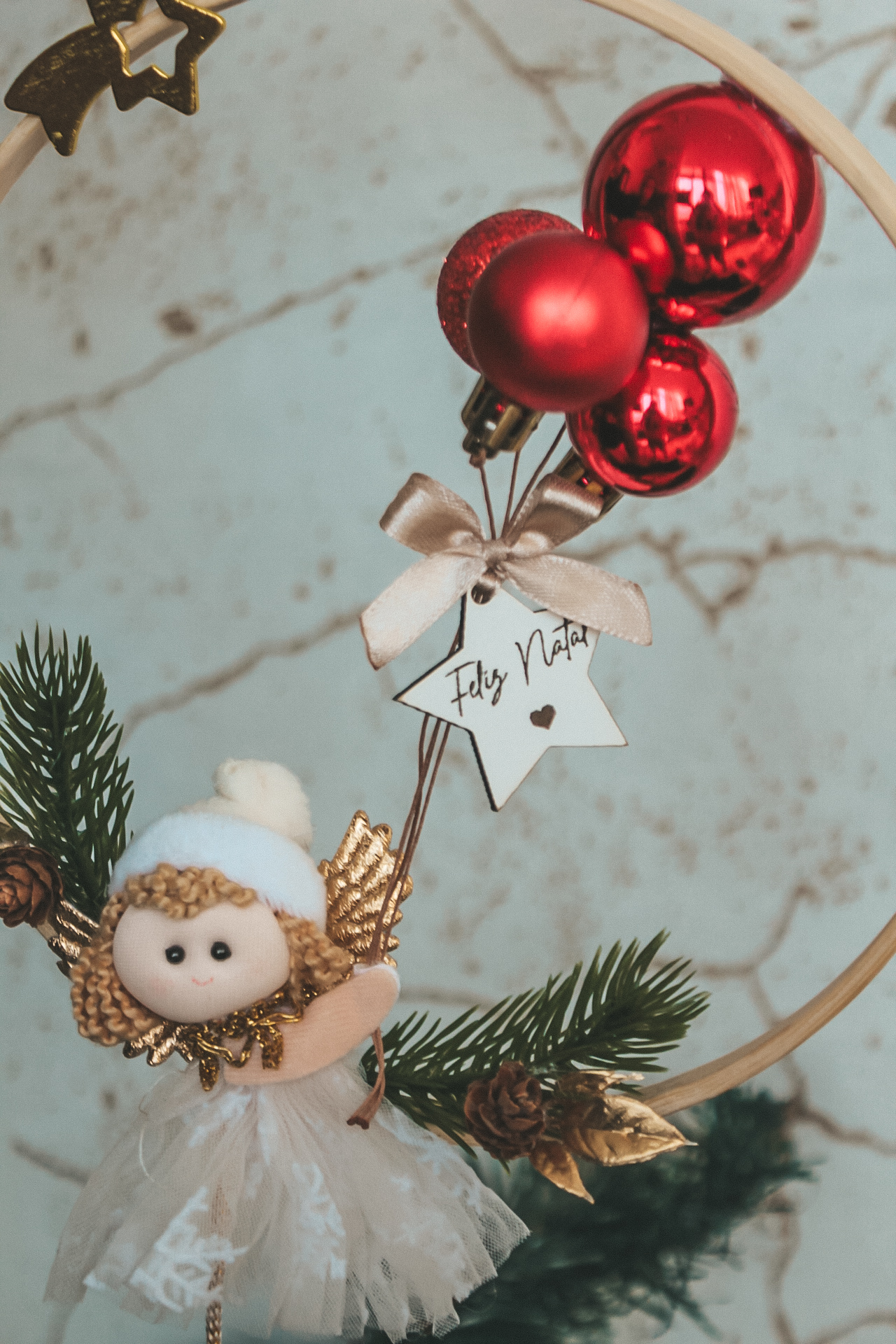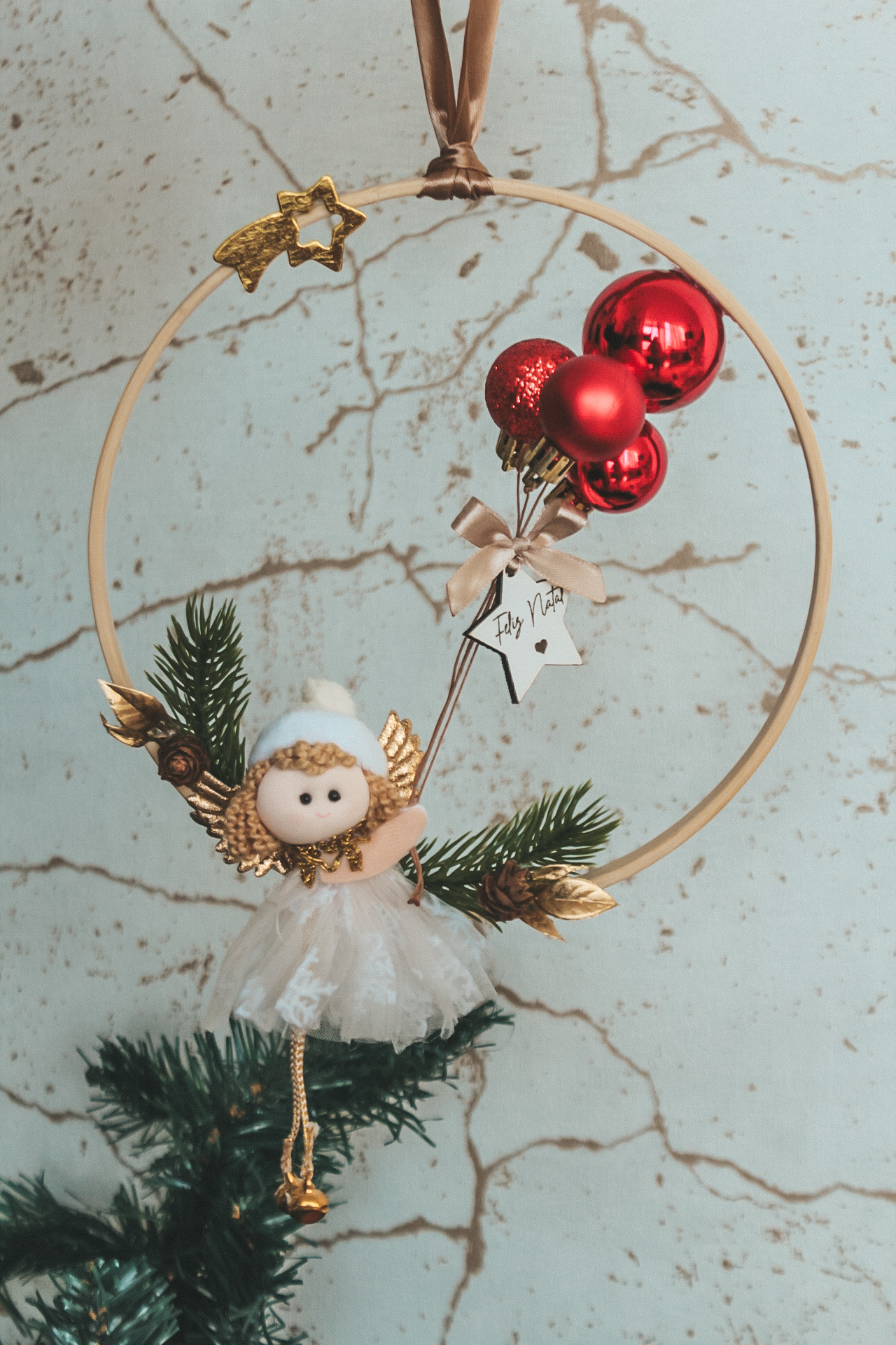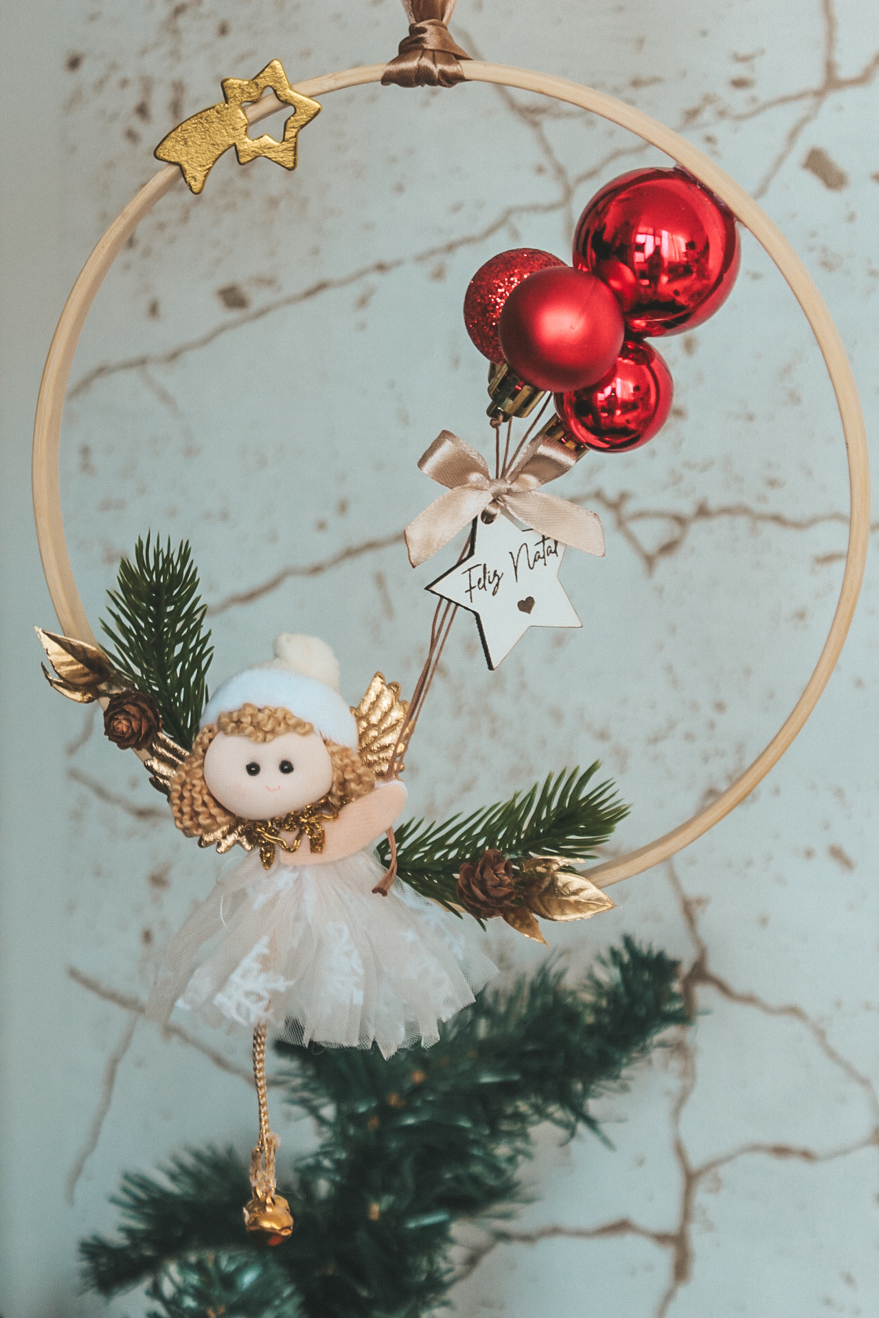 • Enfeite de Natal com anjo tecido, folhas douradas, bolas vermelhas e estrela com mensagem