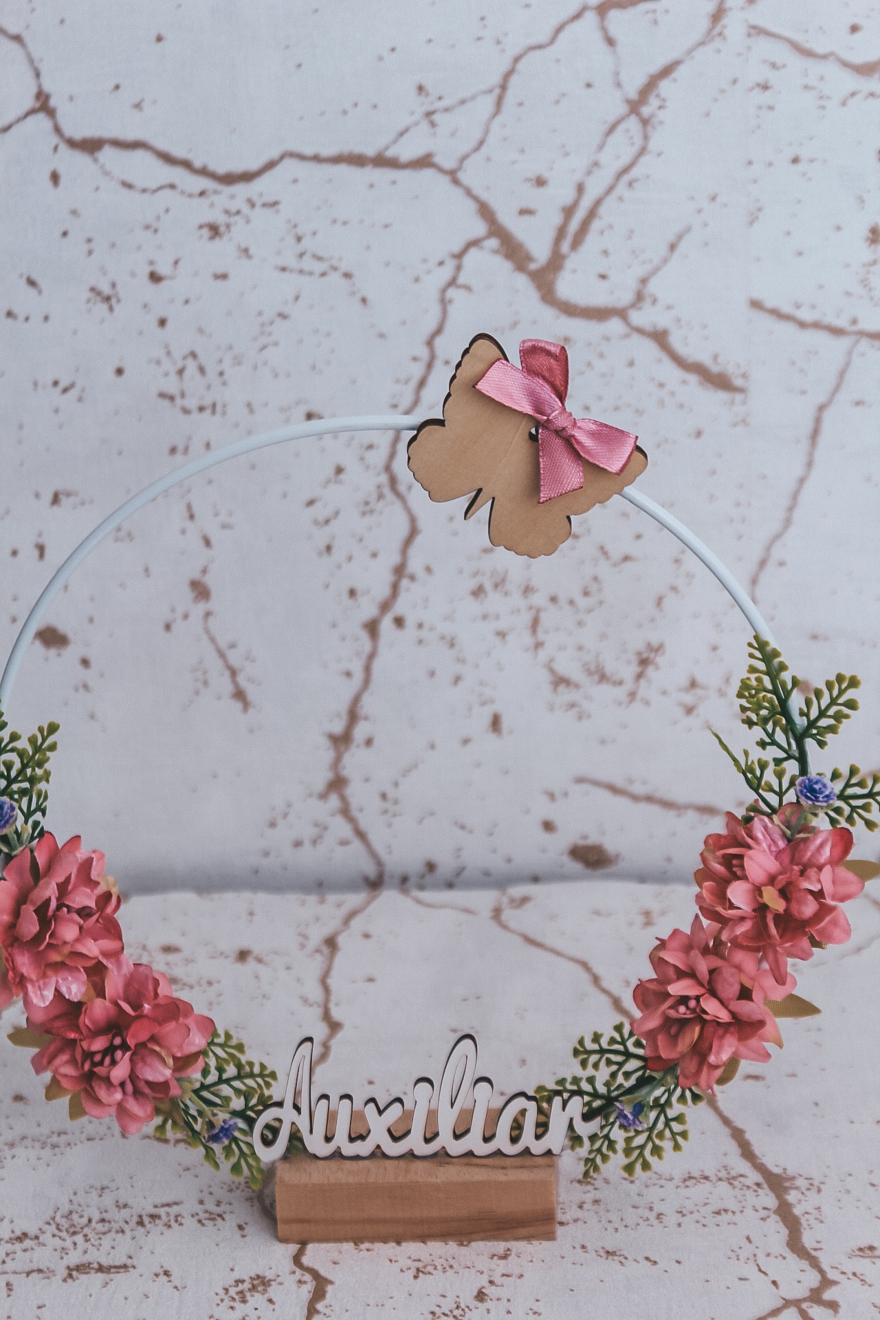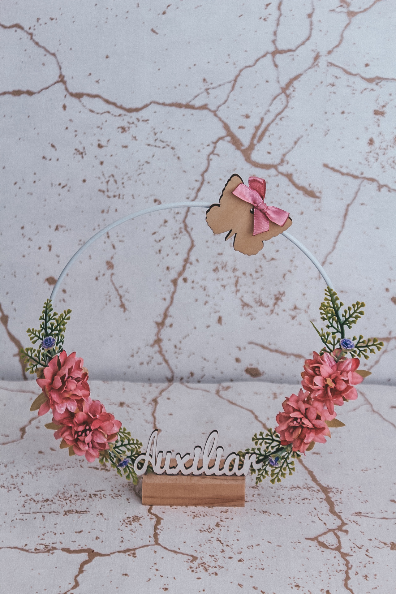 • Aro decorativo com flores, borboleta de madeira e palavra Auxiliar em base de madeira