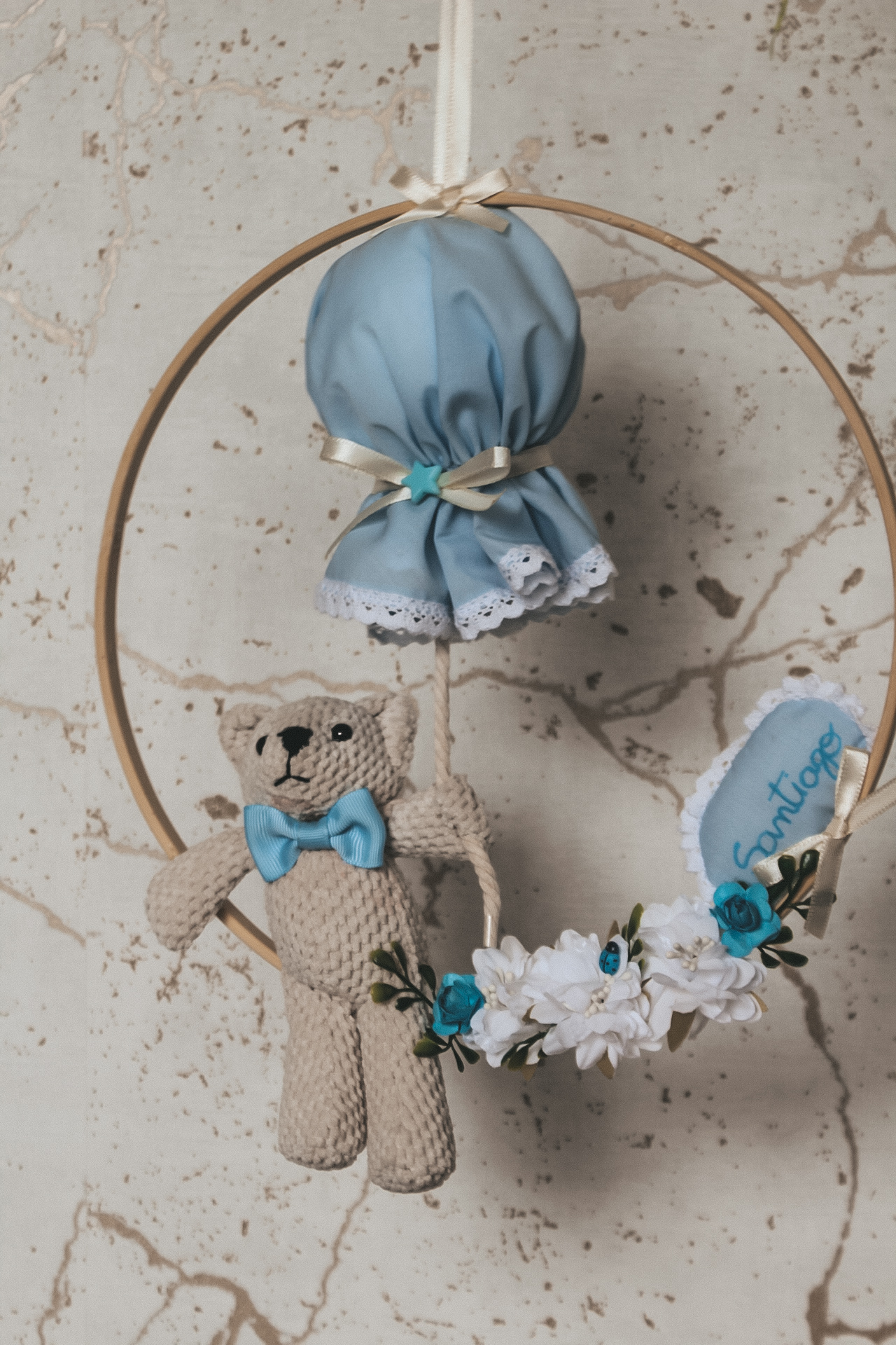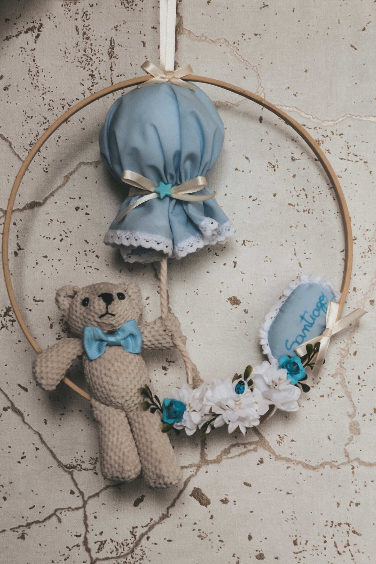 • Ornamento decoração coroa madeira com balão de tecido azul, ursinho de crochê bege e flores brancas e azuis
