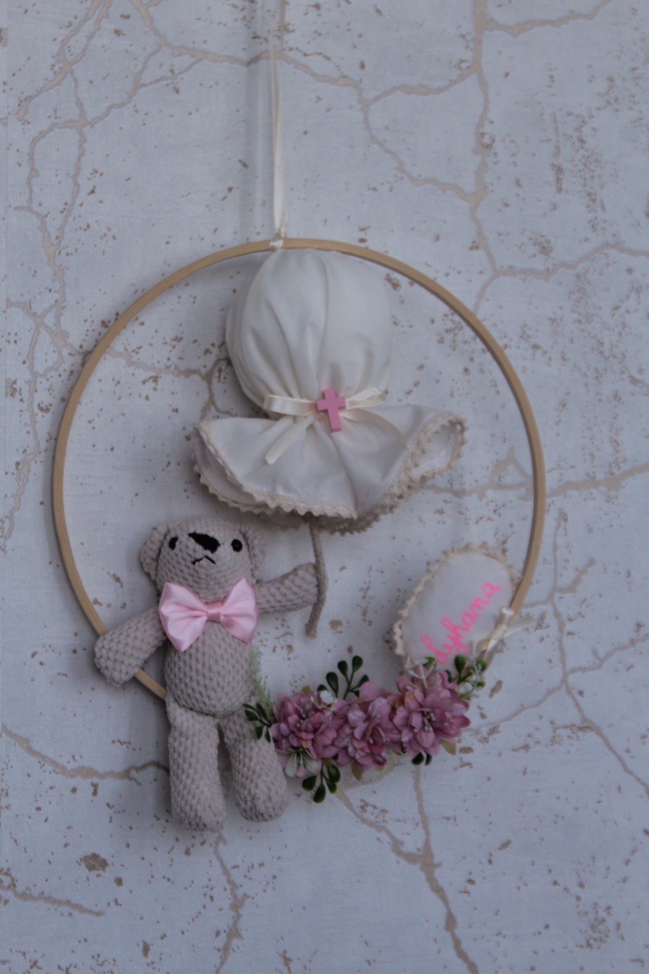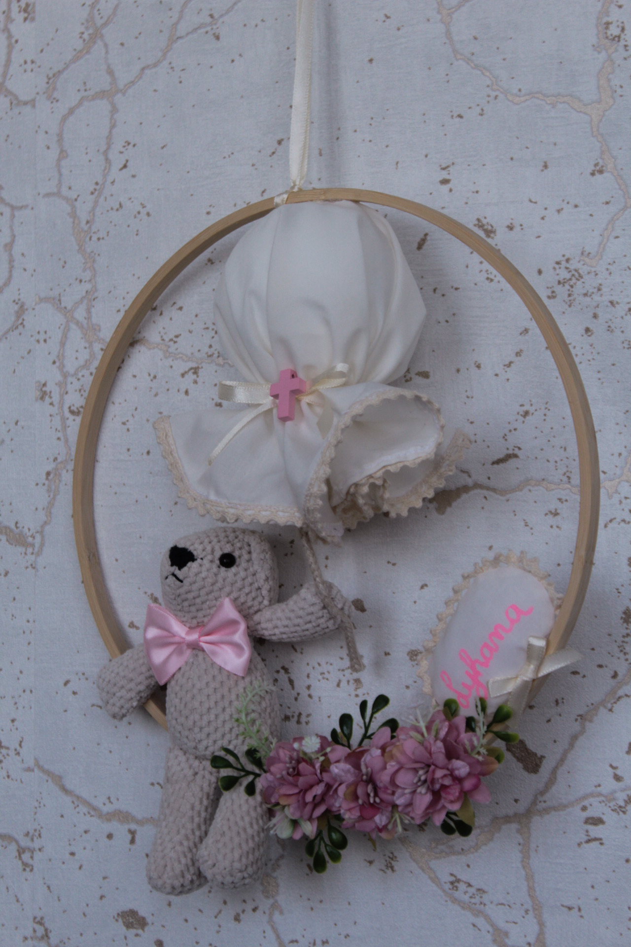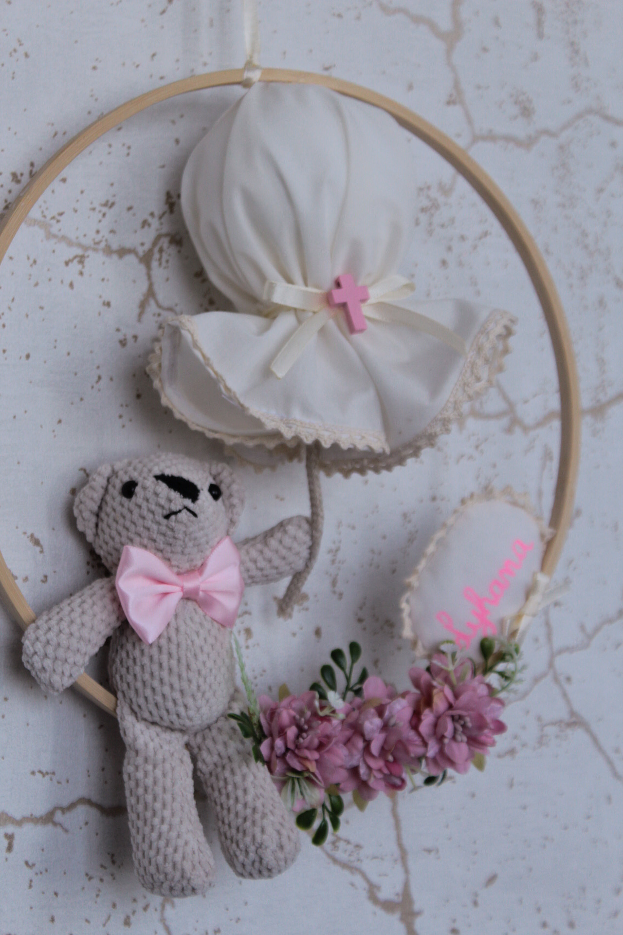 • Coroa decorativa com ursinho de croché, flores cor-de-rosa e manta branca com cruz cor-de-rosa
