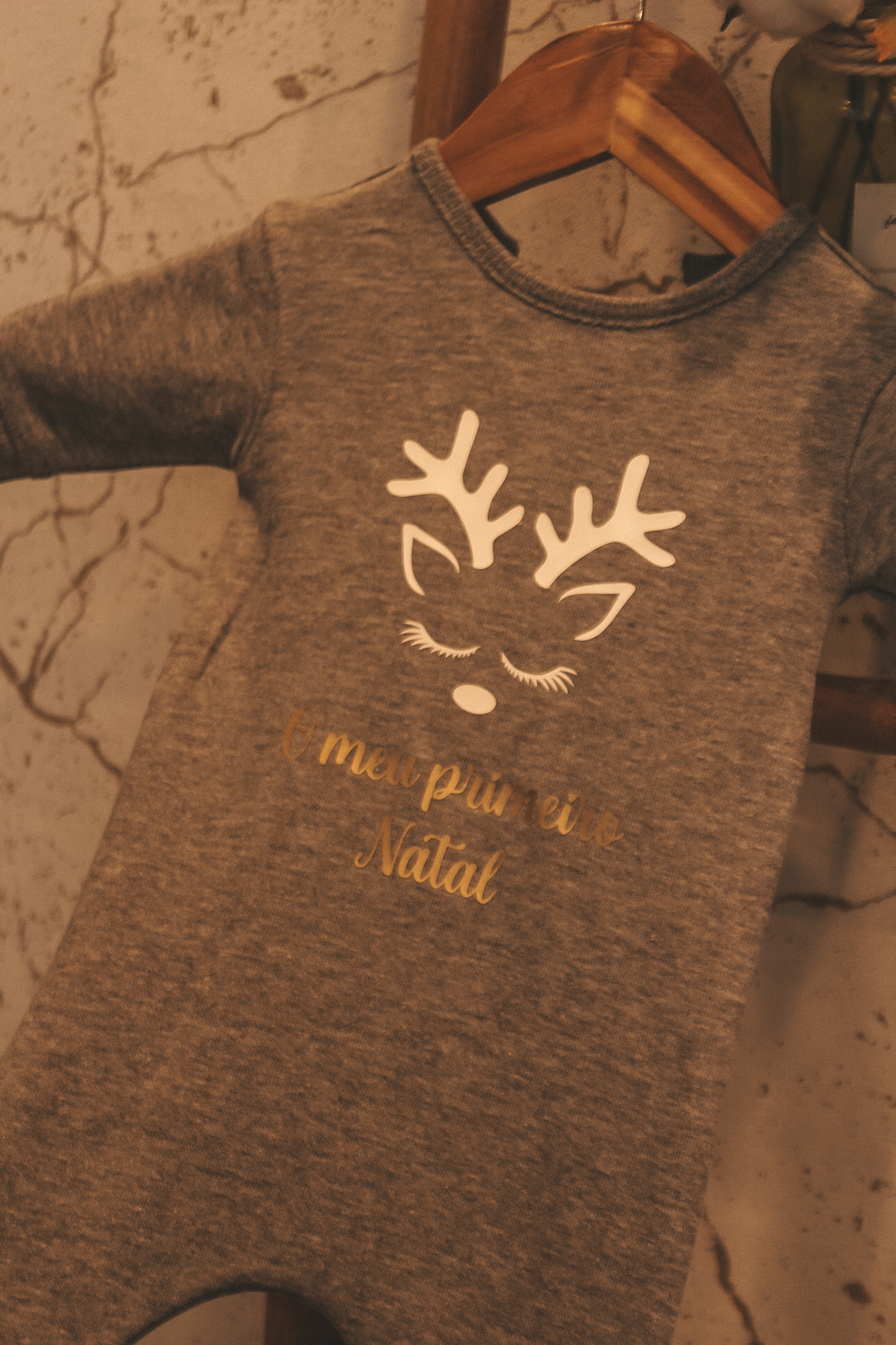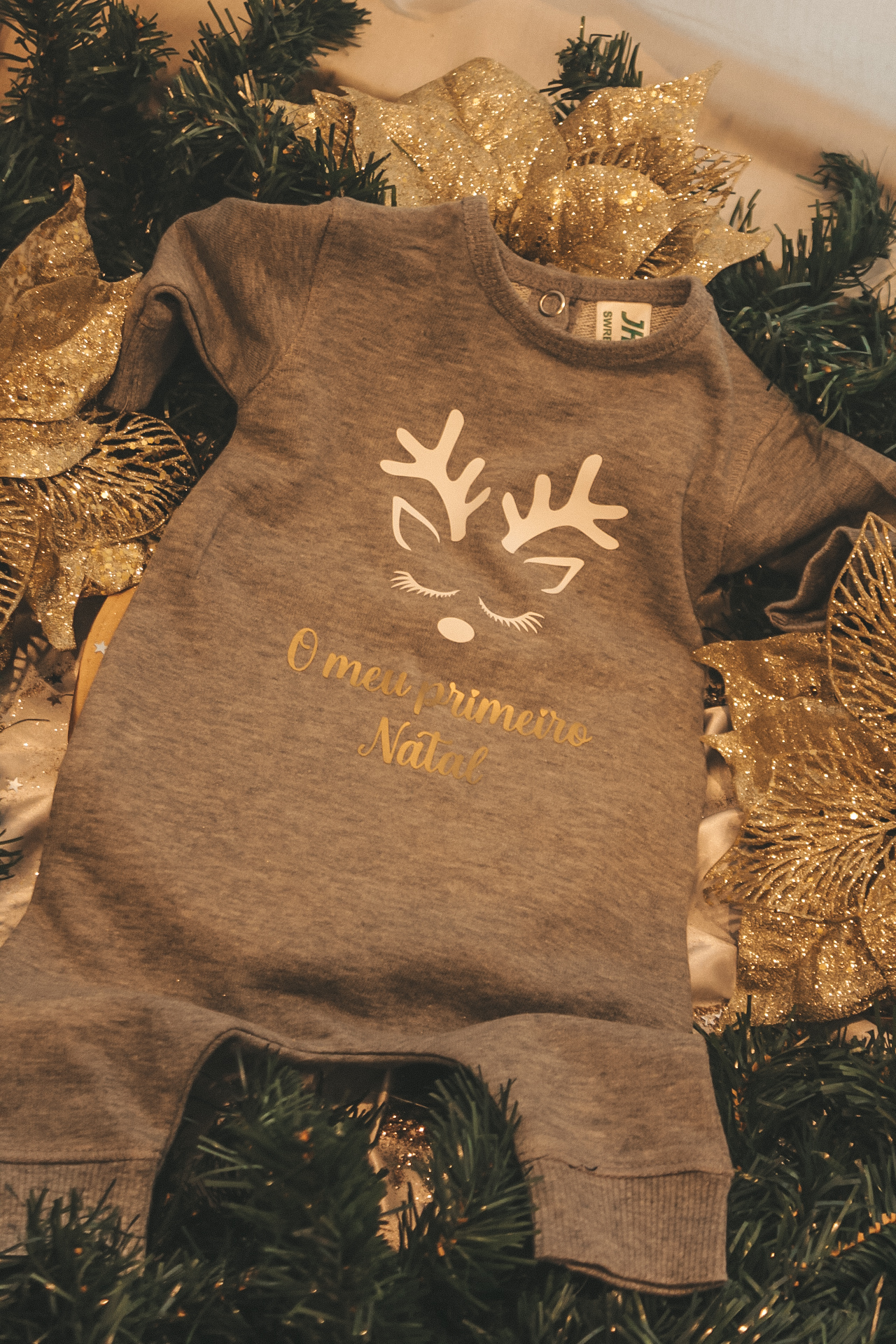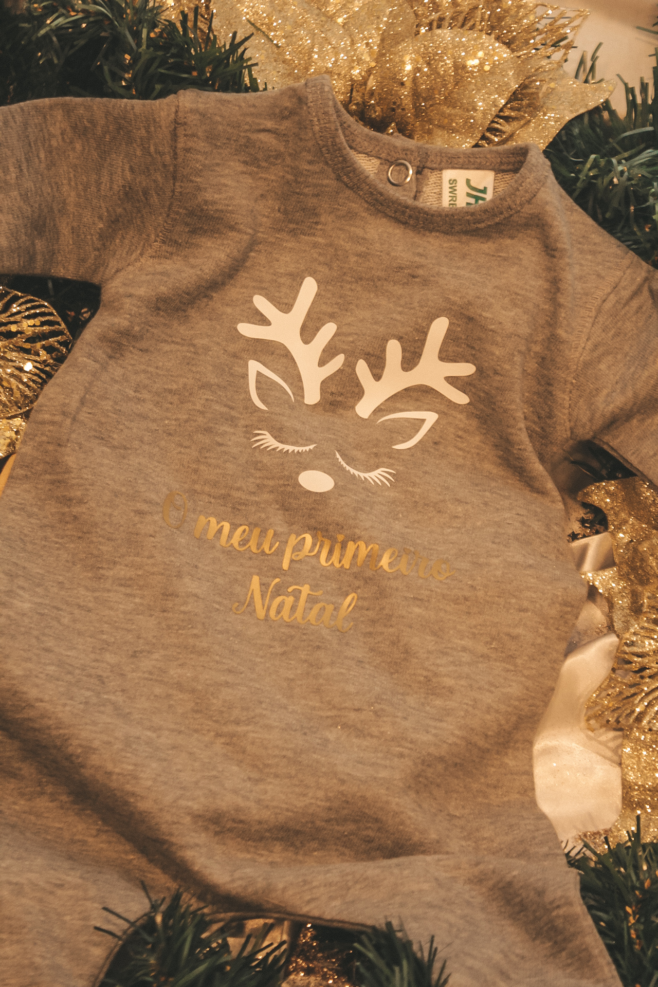 • Macacão cinza de bebé com estampa de rena e texto 'O meu primeiro Natal', decoração natalícia dourada e verde