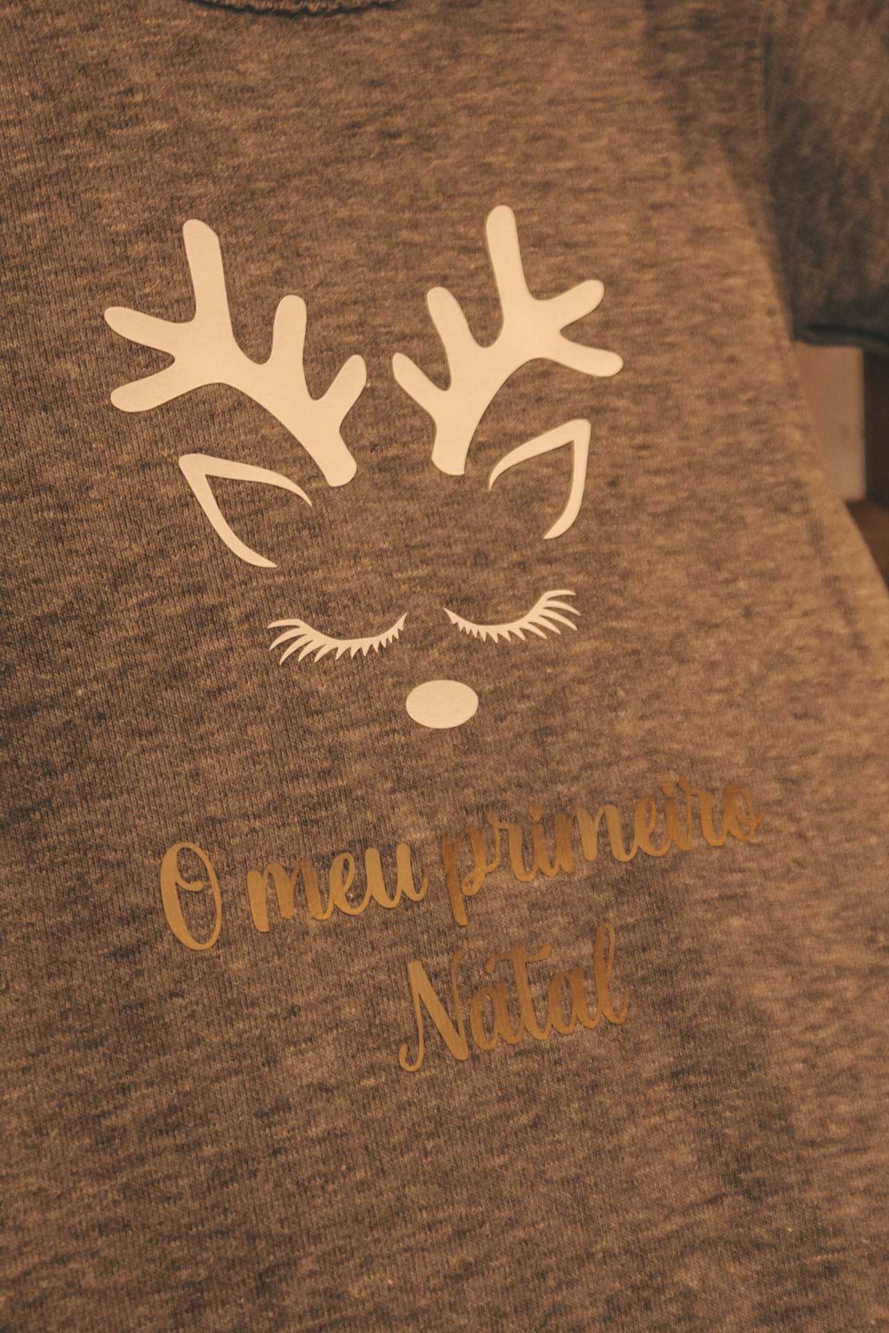 • Camisola cinzenta com estampa de rena branca e texto dourado 'O meu primeiro Natal'.