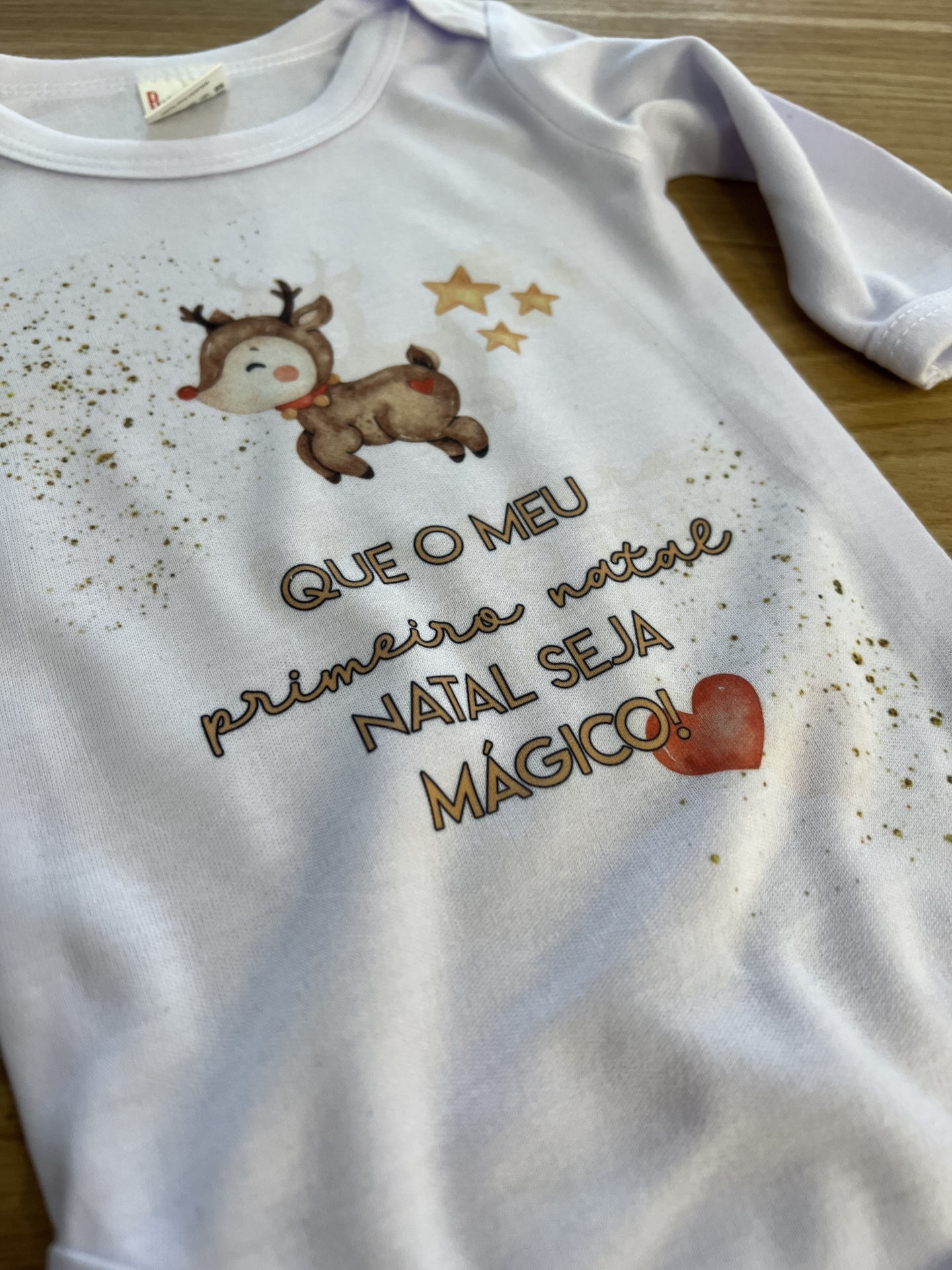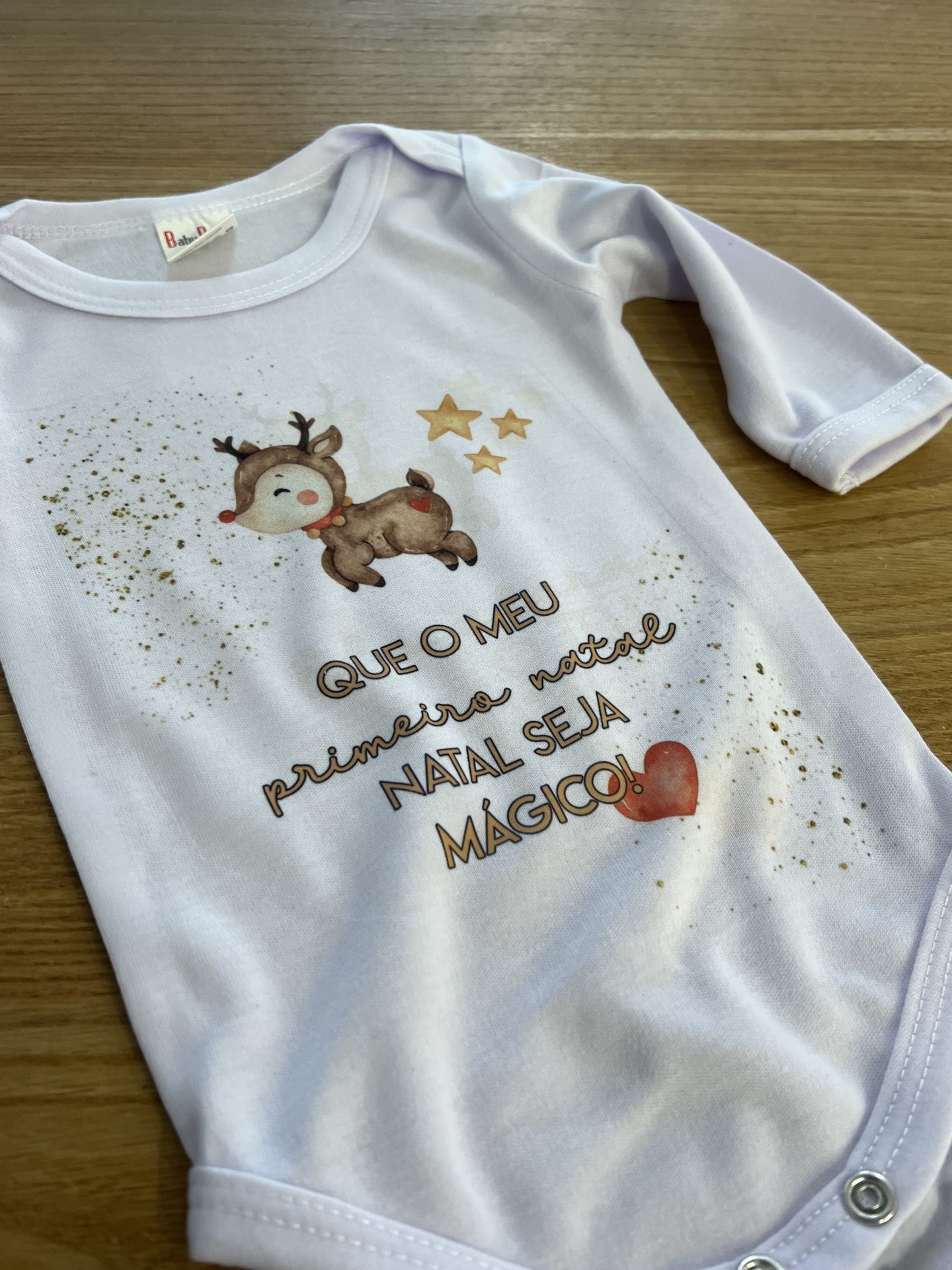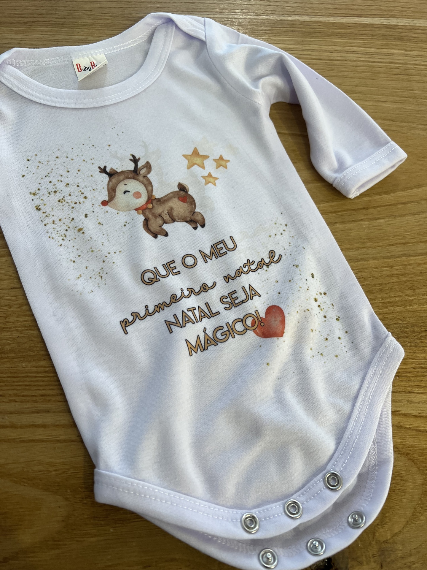 • Body branco de bebé com estampa de veado, estrelas e texto alusivo ao primeiro Natal