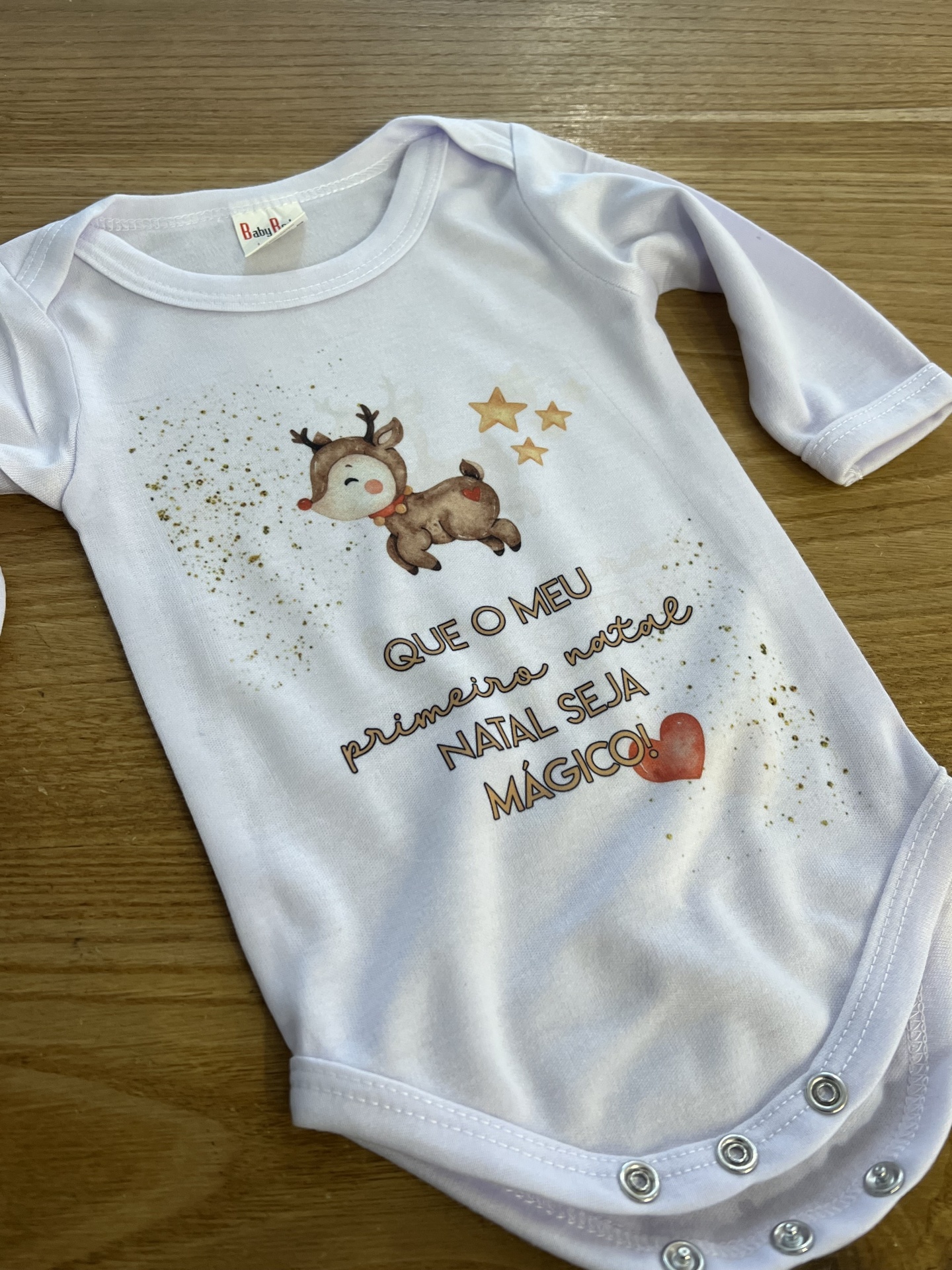 • Body branco de bebé com estampado natalício de veado, estrelas e texto em português
