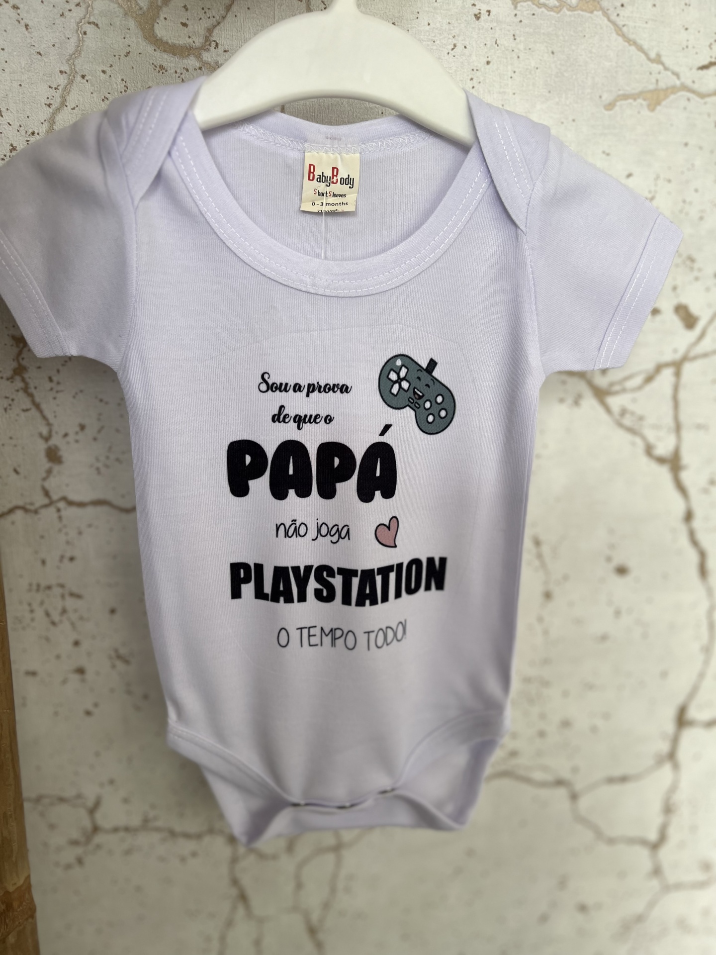 • Body branco para bebé com texto impresso sobre papá e PlayStation