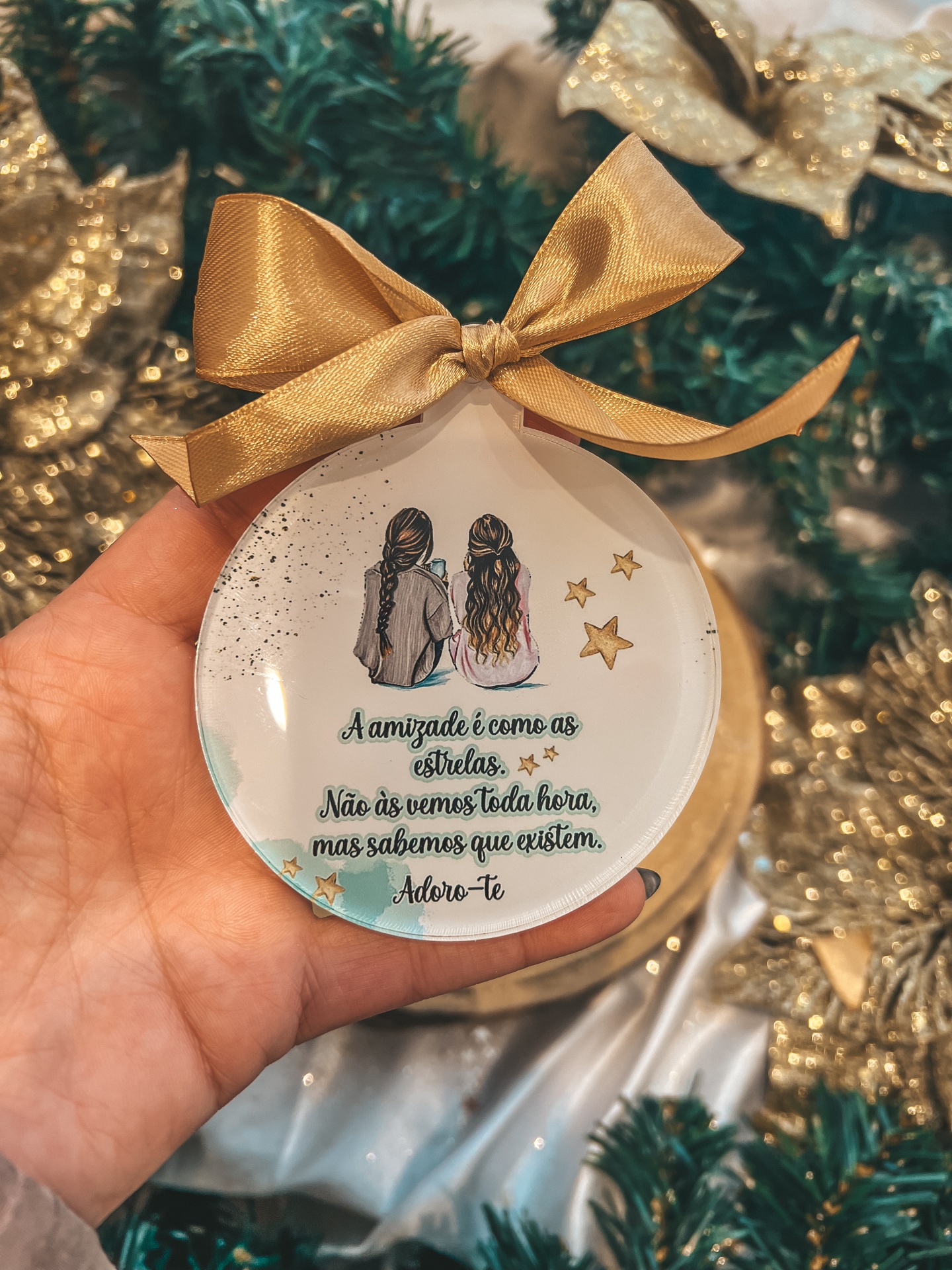 • Ornamento de Natal redondo com laço dourado, figuras femininas e texto em português sobre amizade