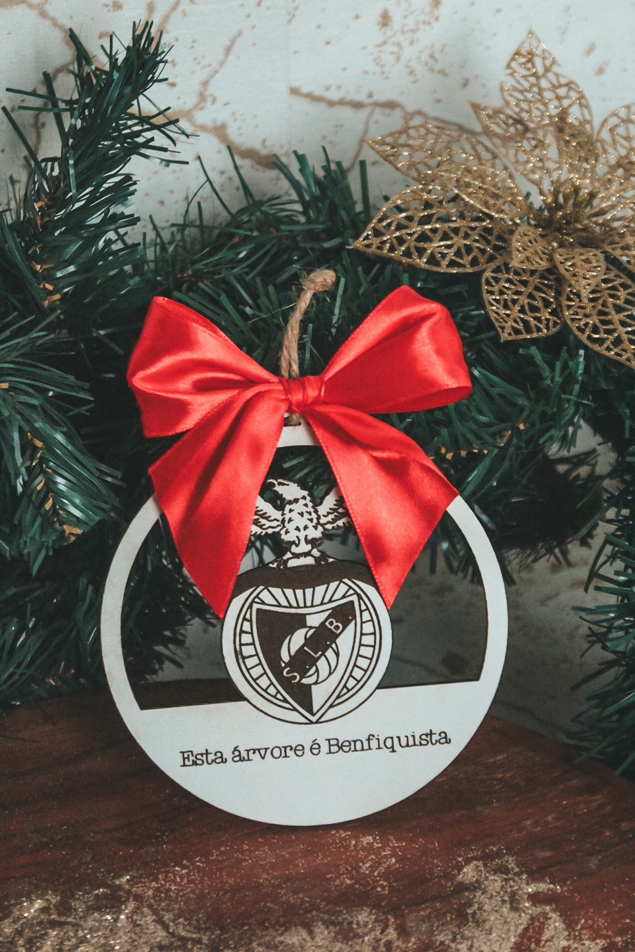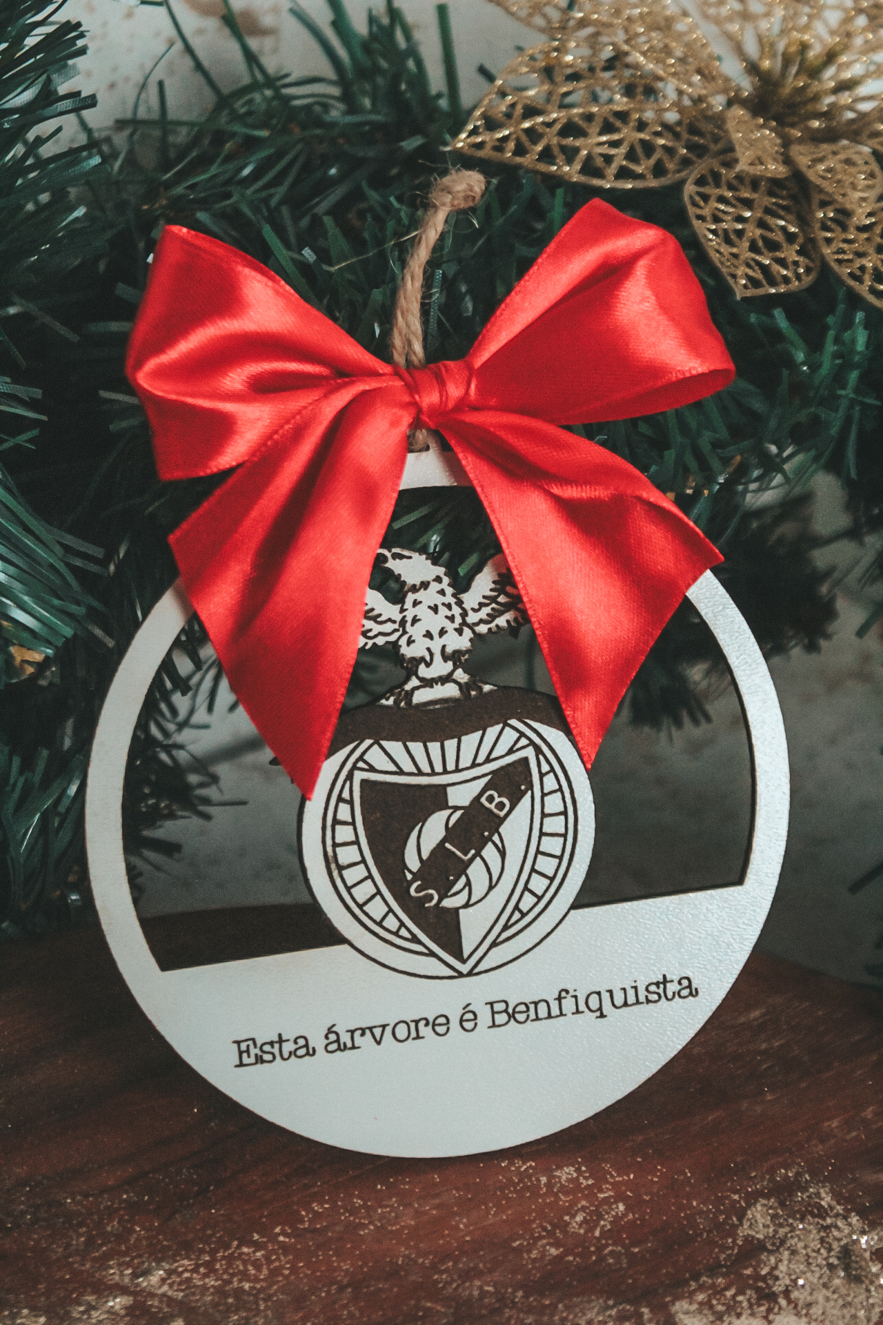 • Enfeite natalício redondo em madeira branca com laço vermelho e brasão Benfiquista