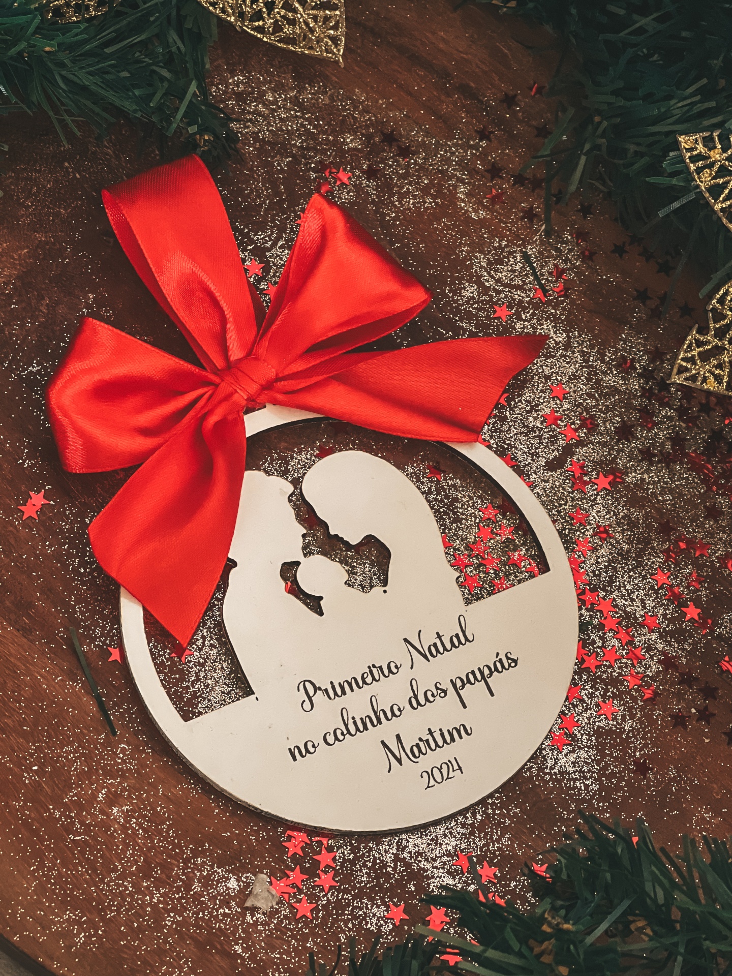 • Decoração natalícia redonda em madeira com laço vermelho e texto personalizado