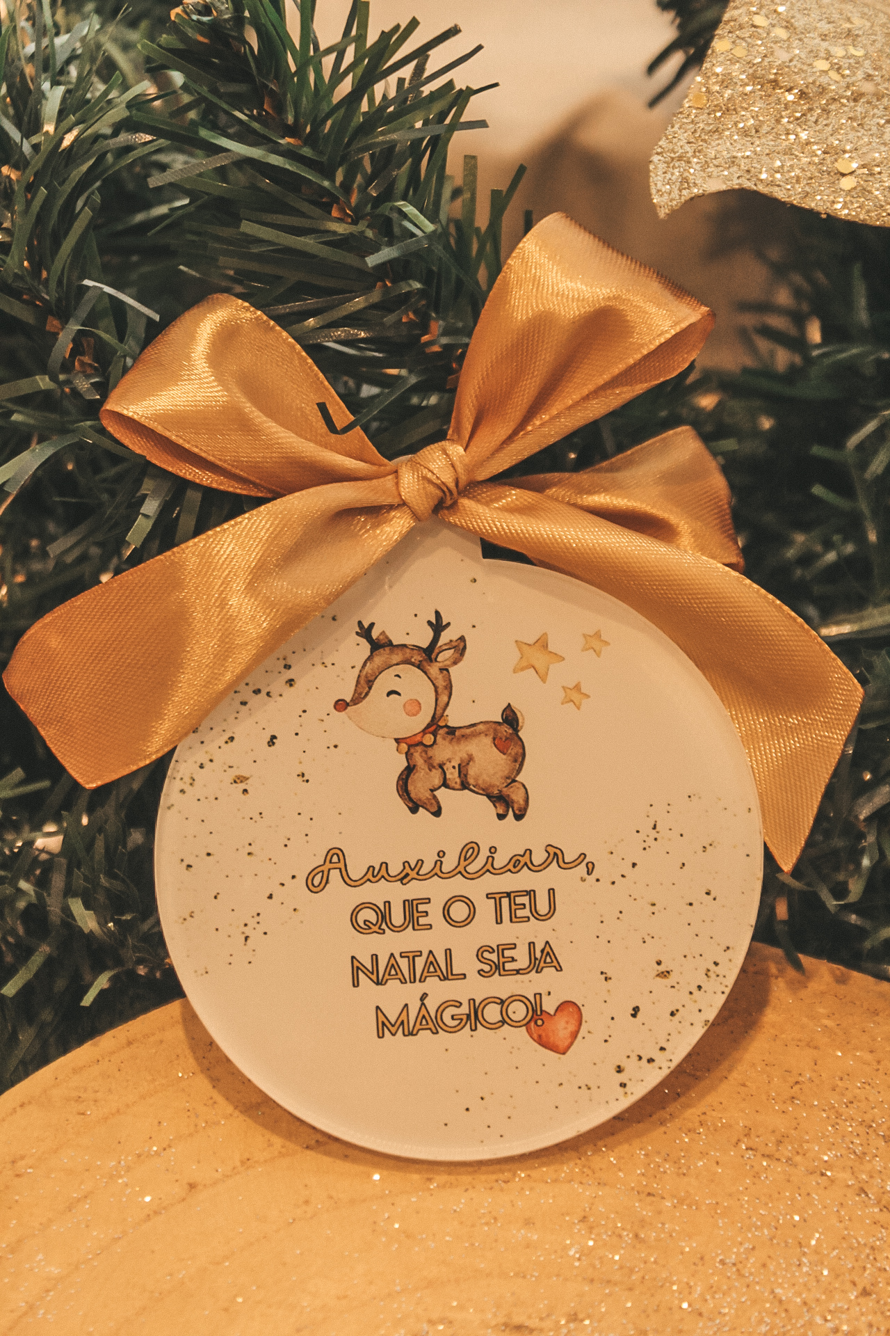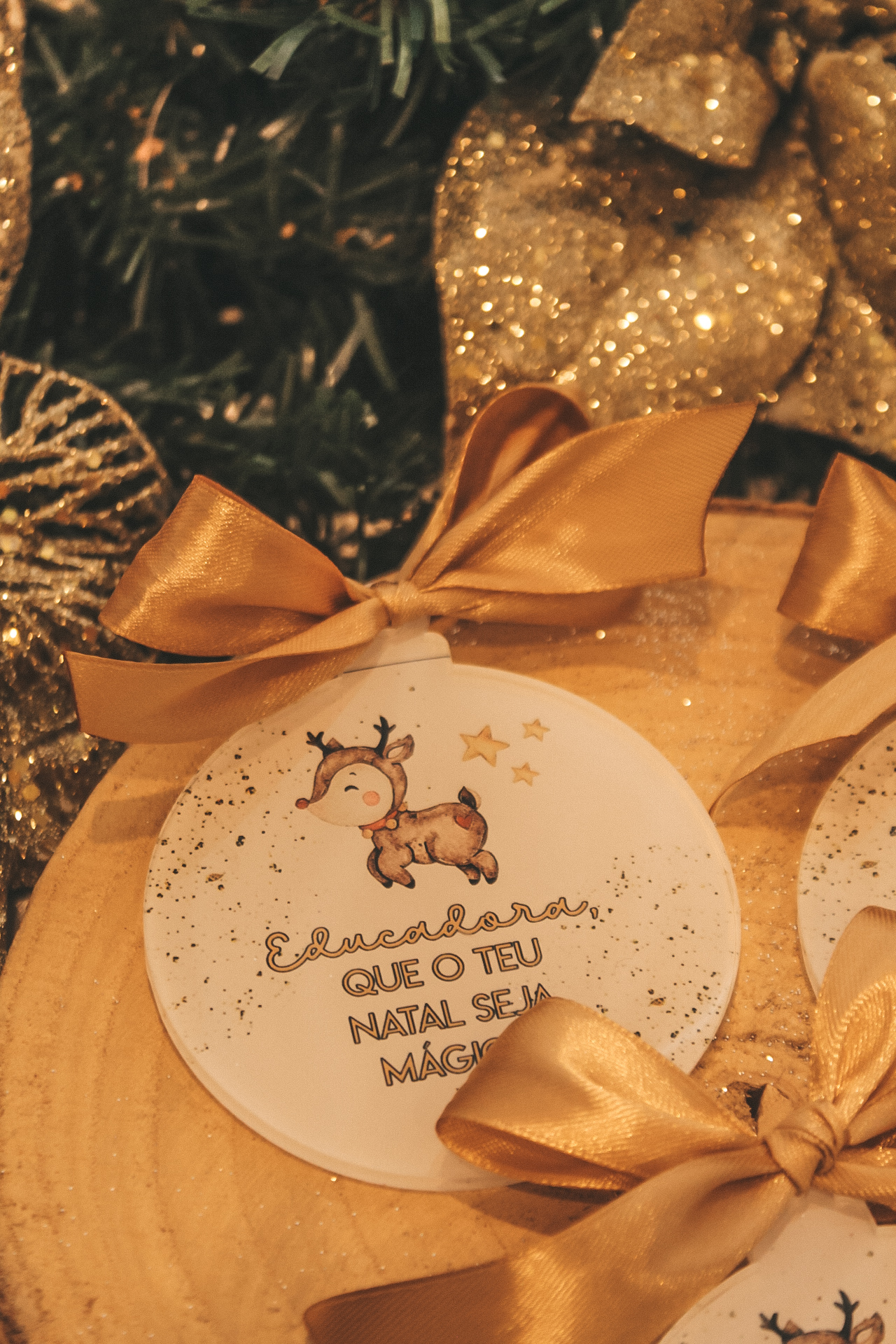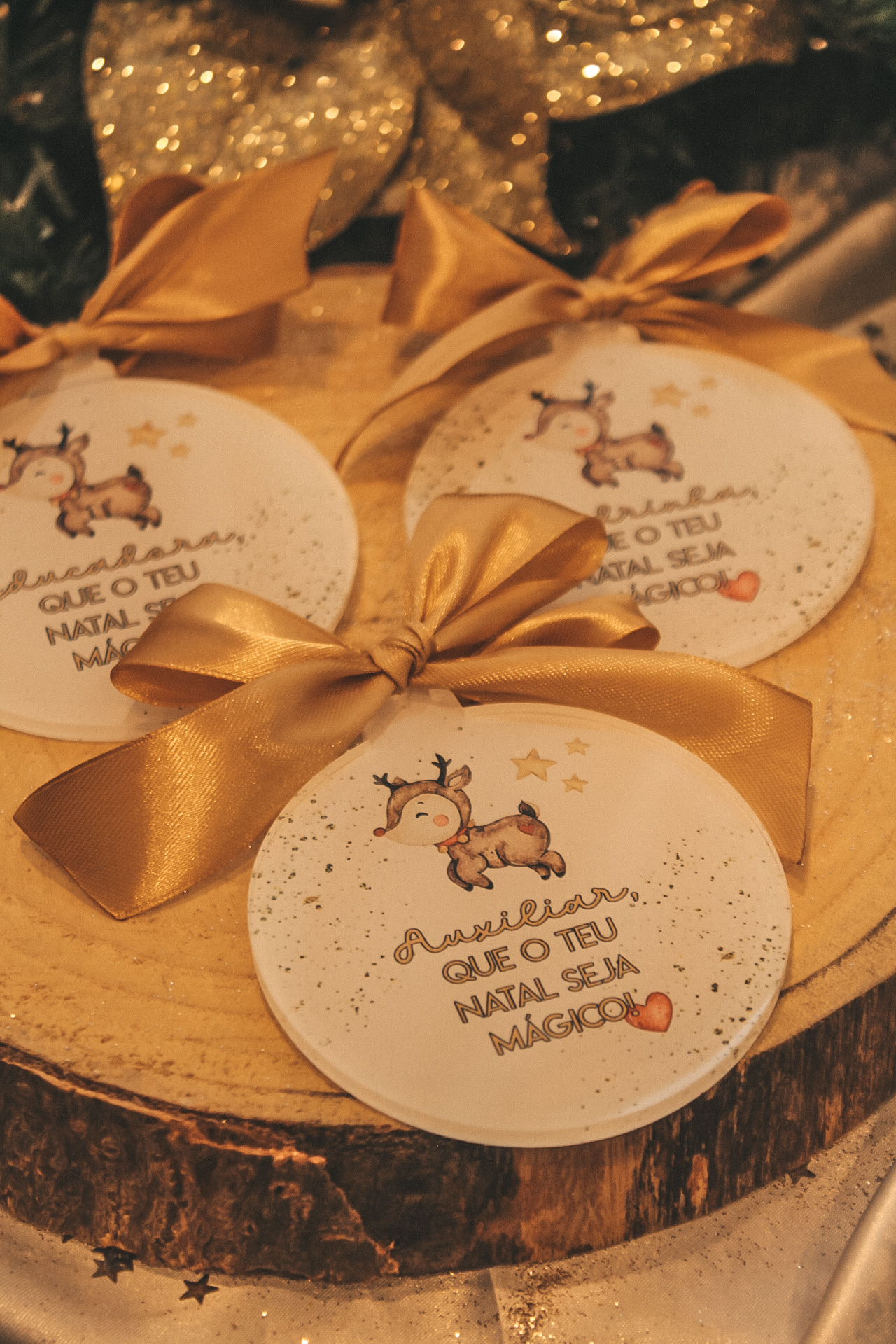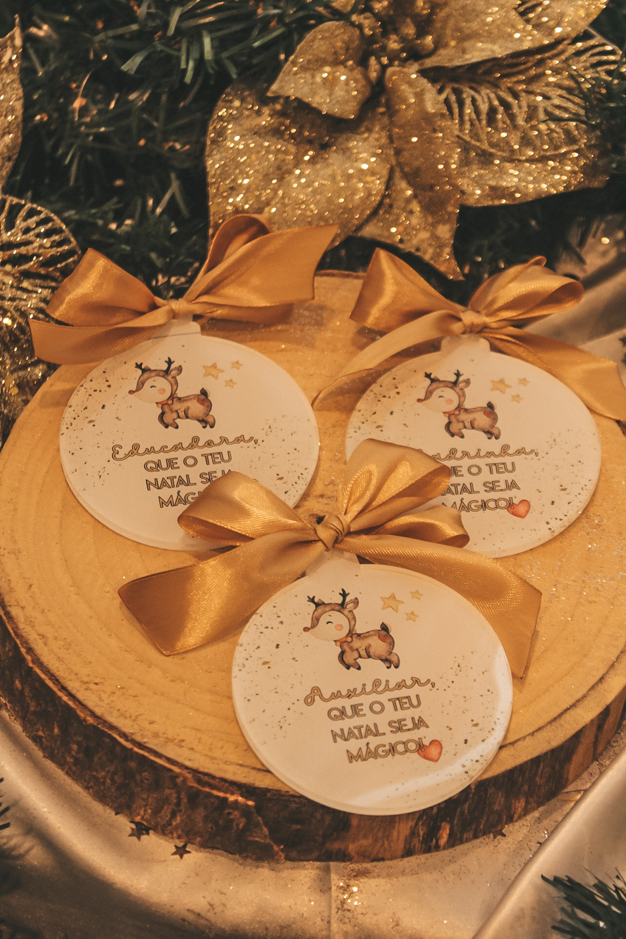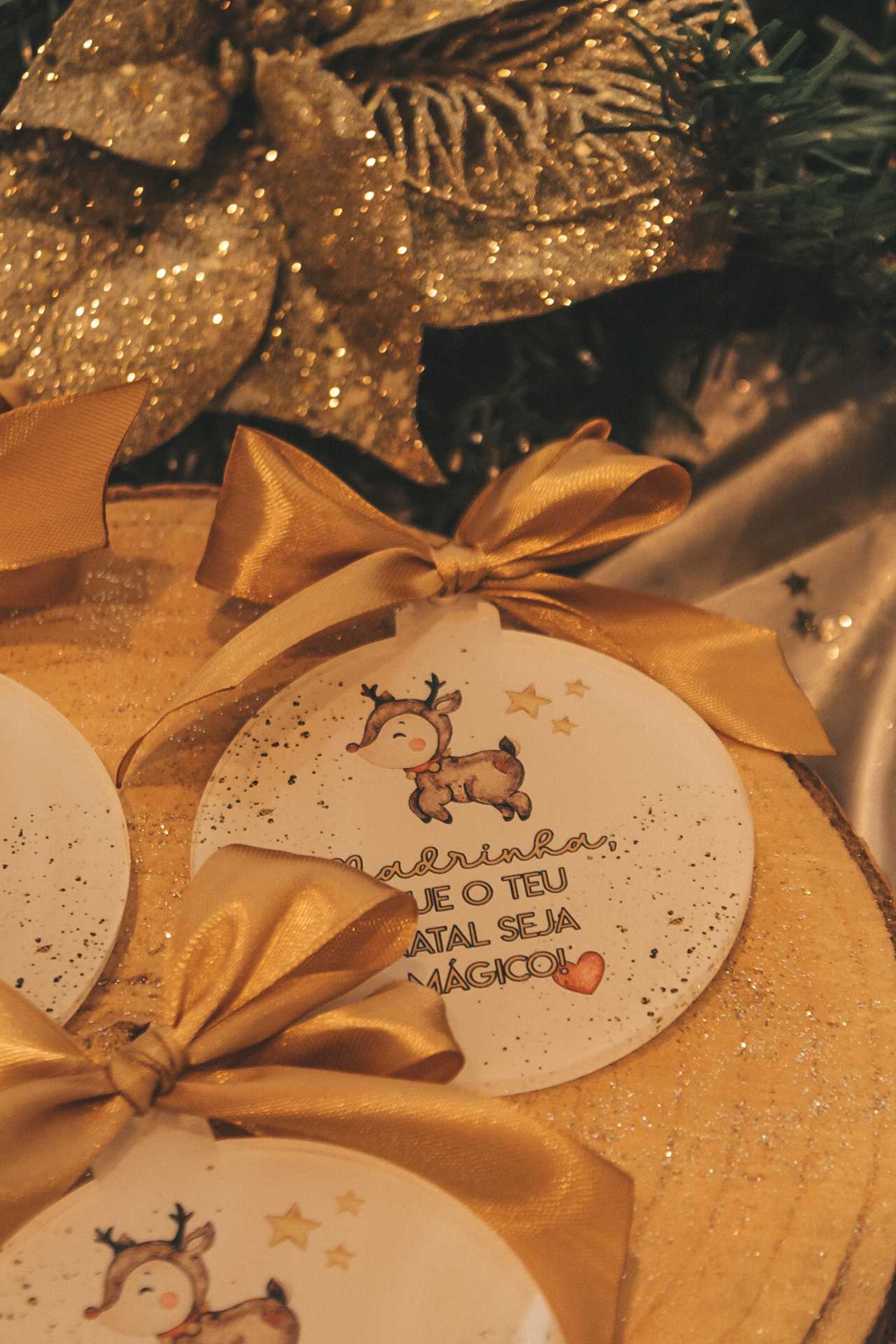 • Enfeites de Natal redondos com laços dourados e ilustração de rena sobre madeira
