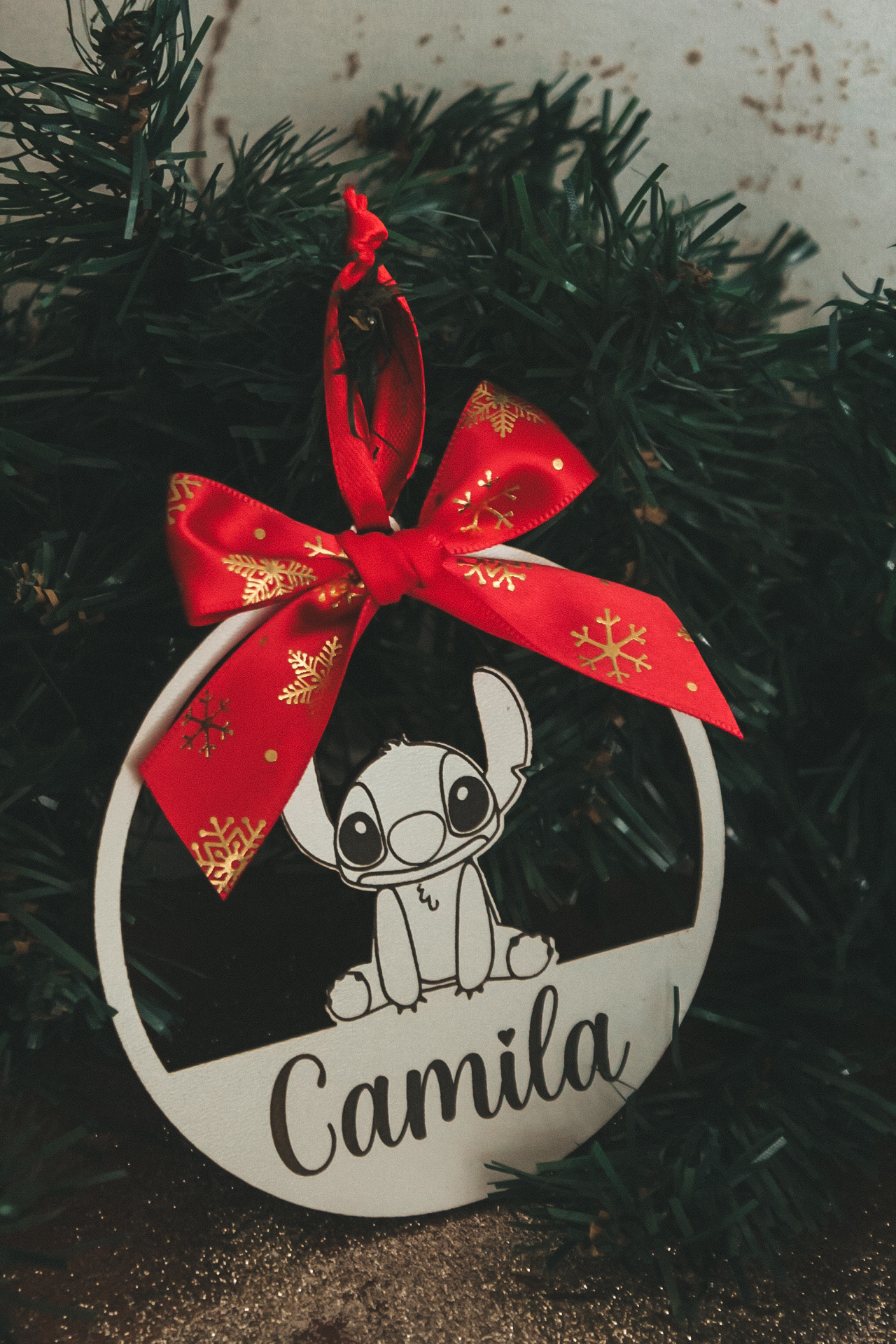 • Enfeite de Natal branco com Stitch, laço vermelho e nome Camila pendurado numa árvore de Natal