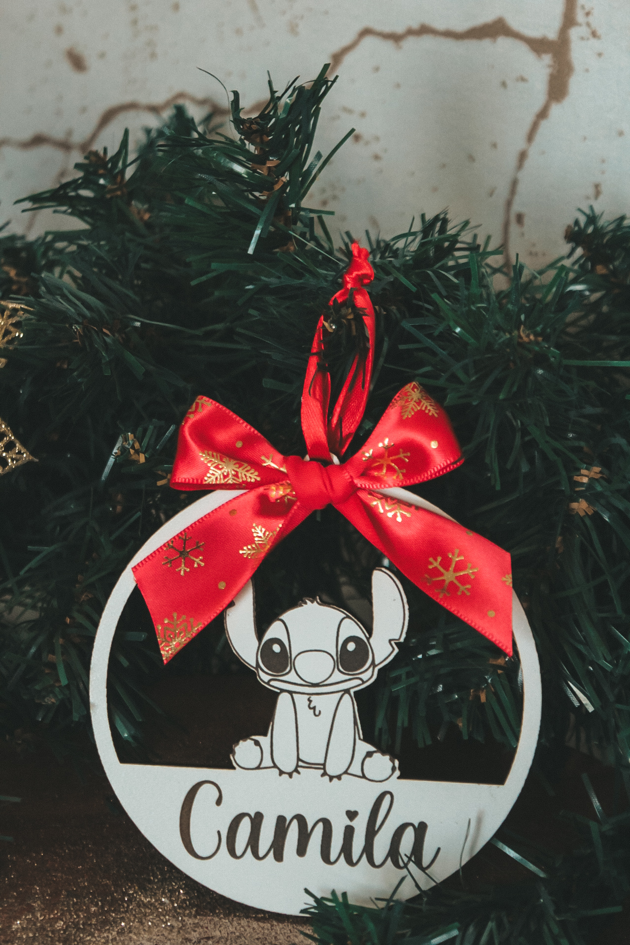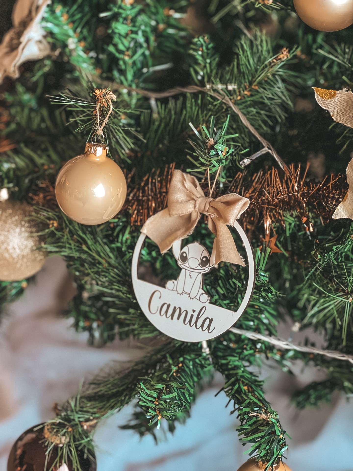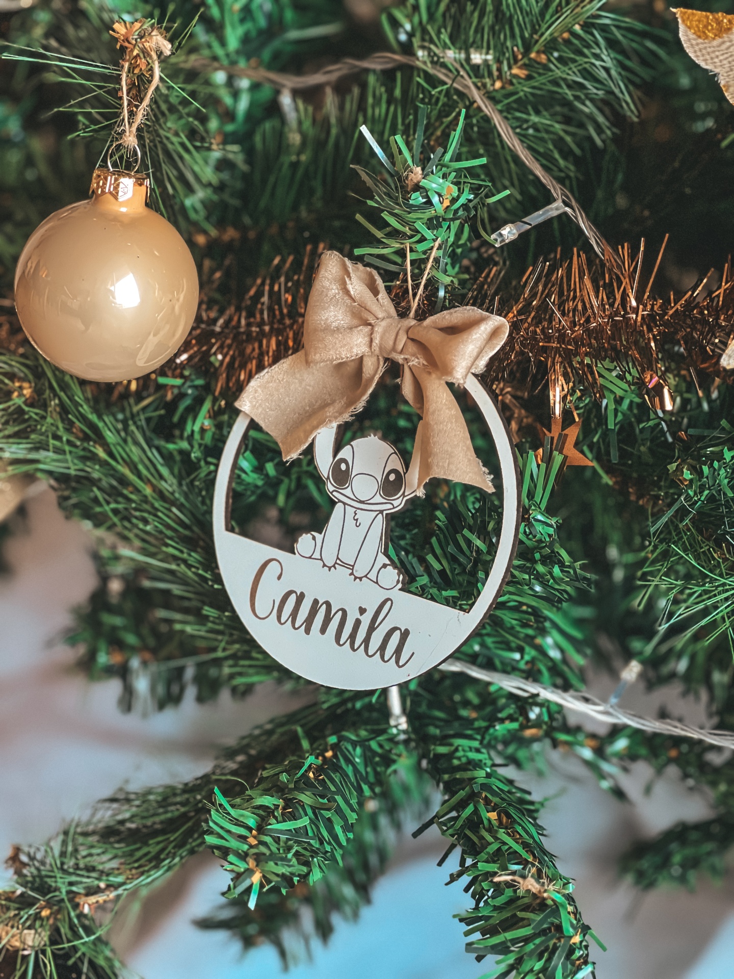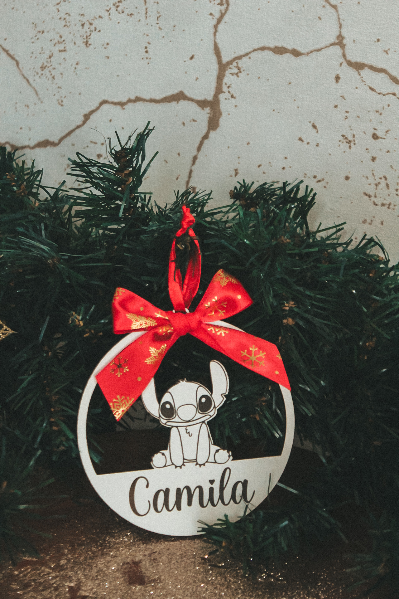 • Ornamento redondo branco com desenho do Stitch e nome Camila pendurado numa árvore de Natal