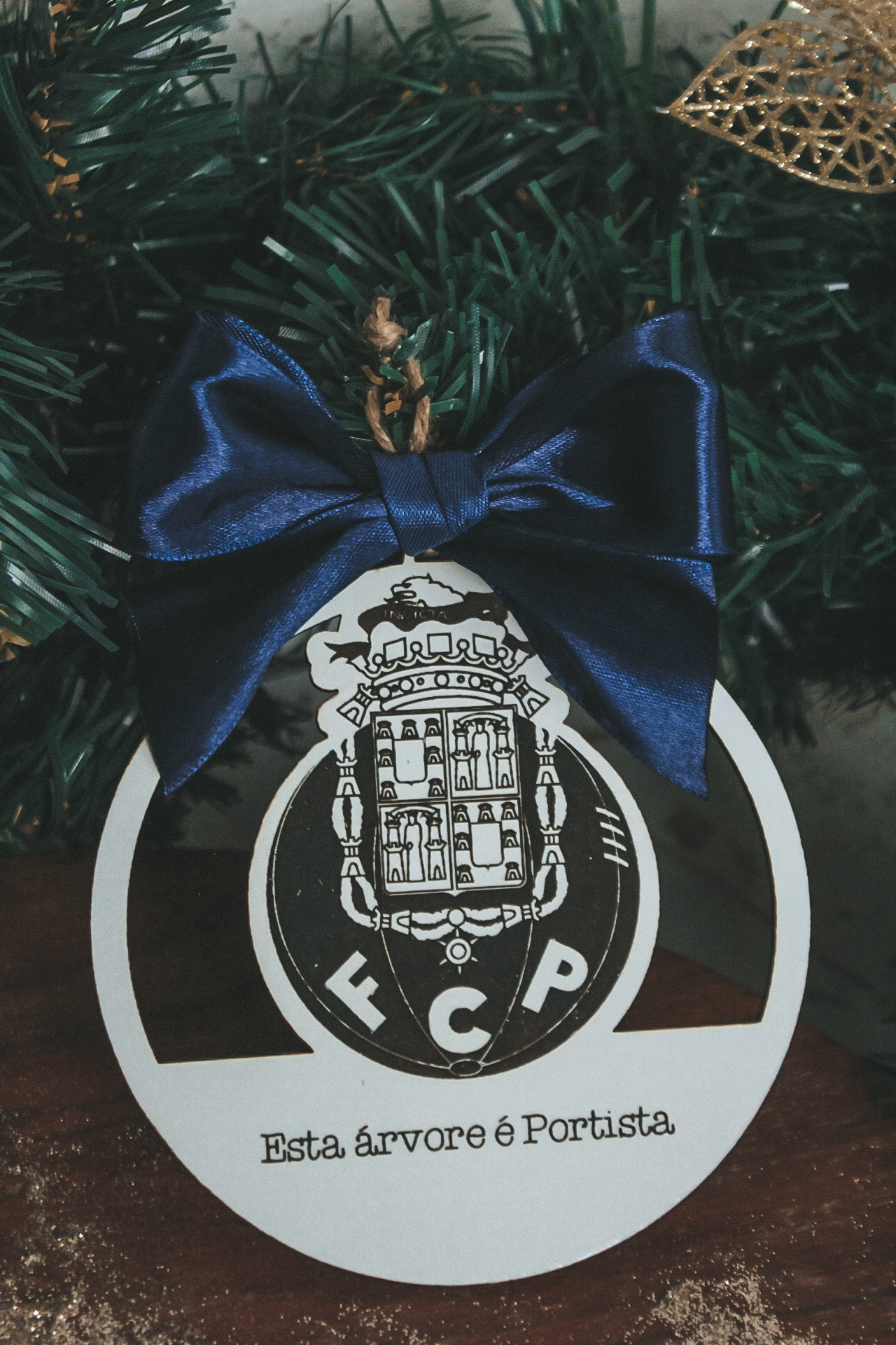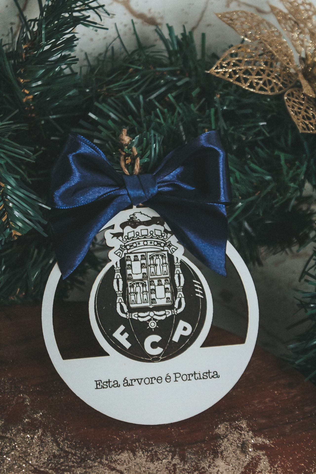 • Enfeite de Natal branco com brasão FCP e laço azul numa árvore de Natal