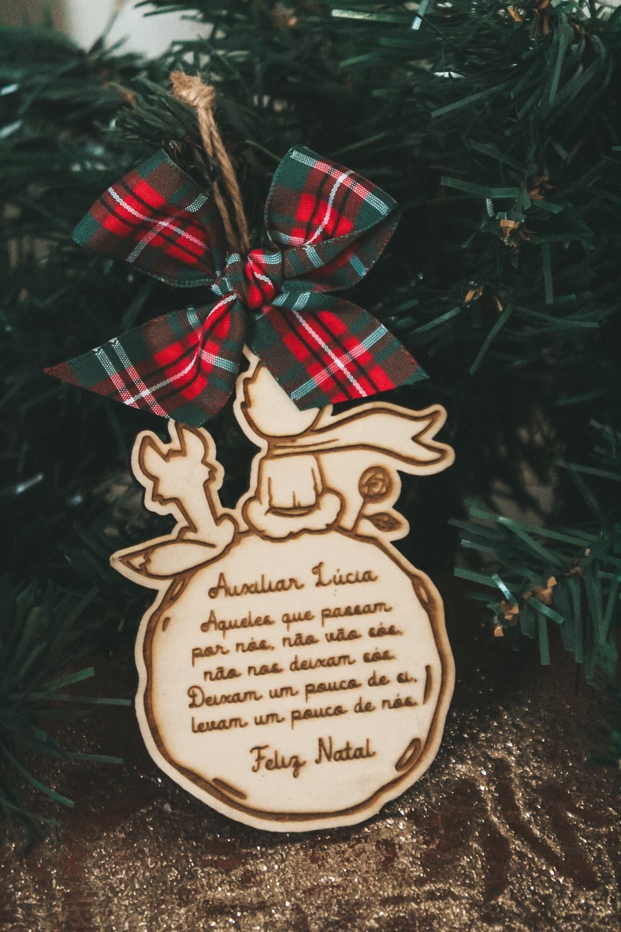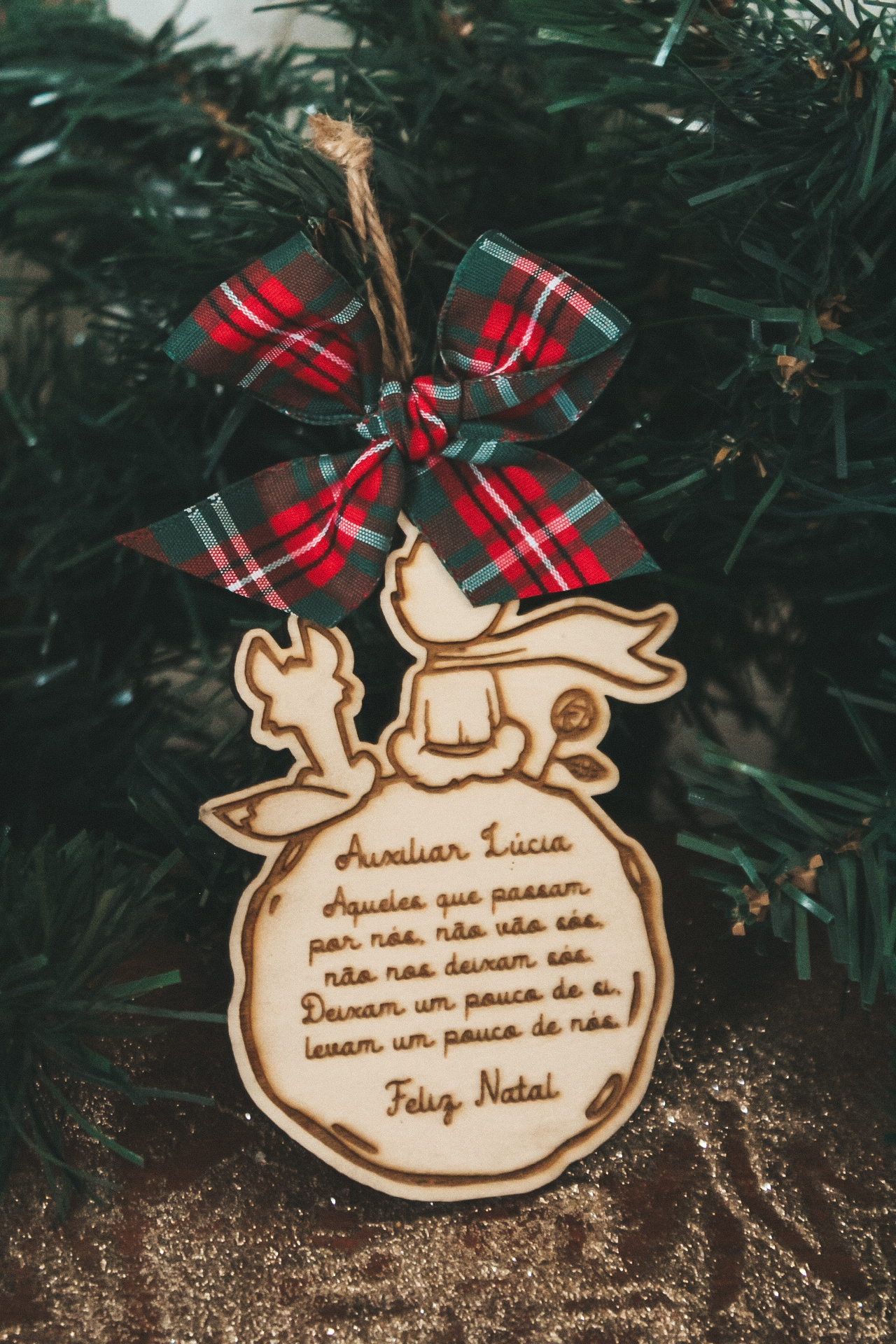 • Enfeite de Natal em madeira com mensagem gravada e laço xadrez vermelho e verde pendurado em árvore de Natal