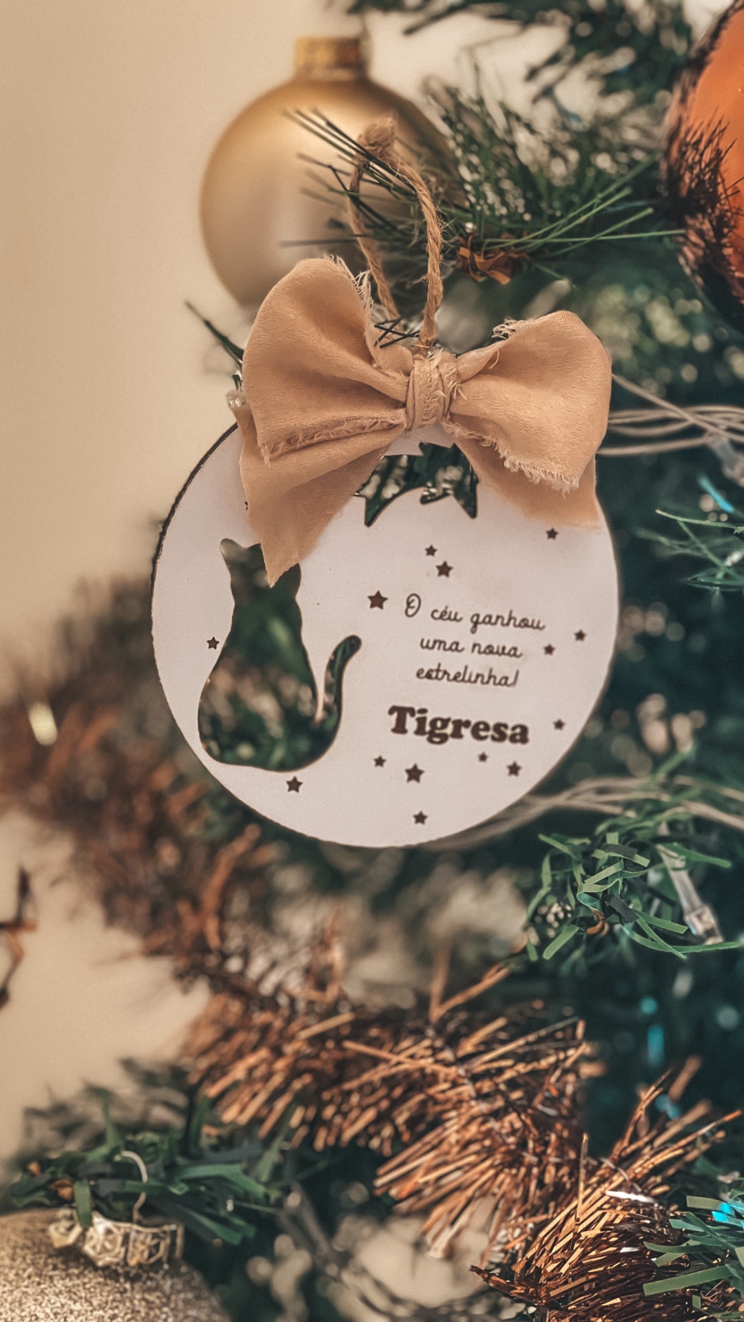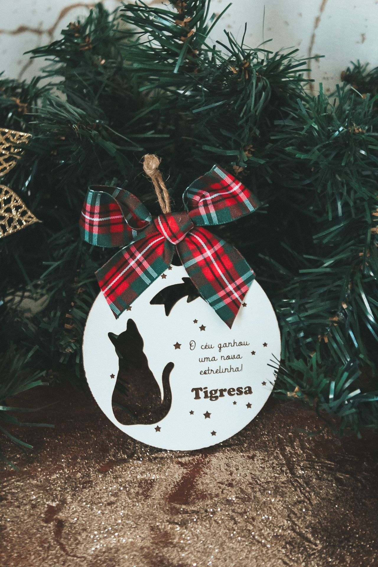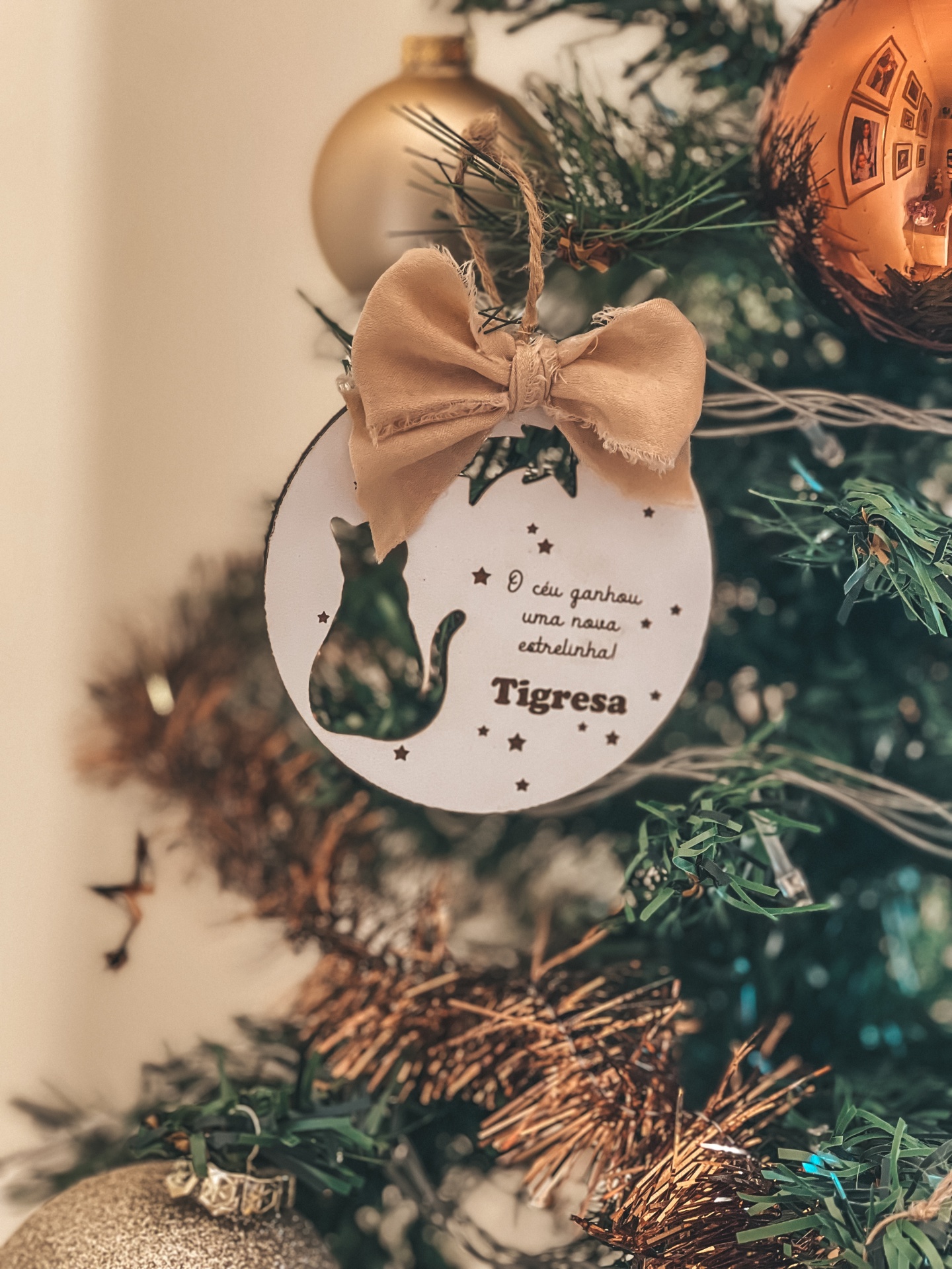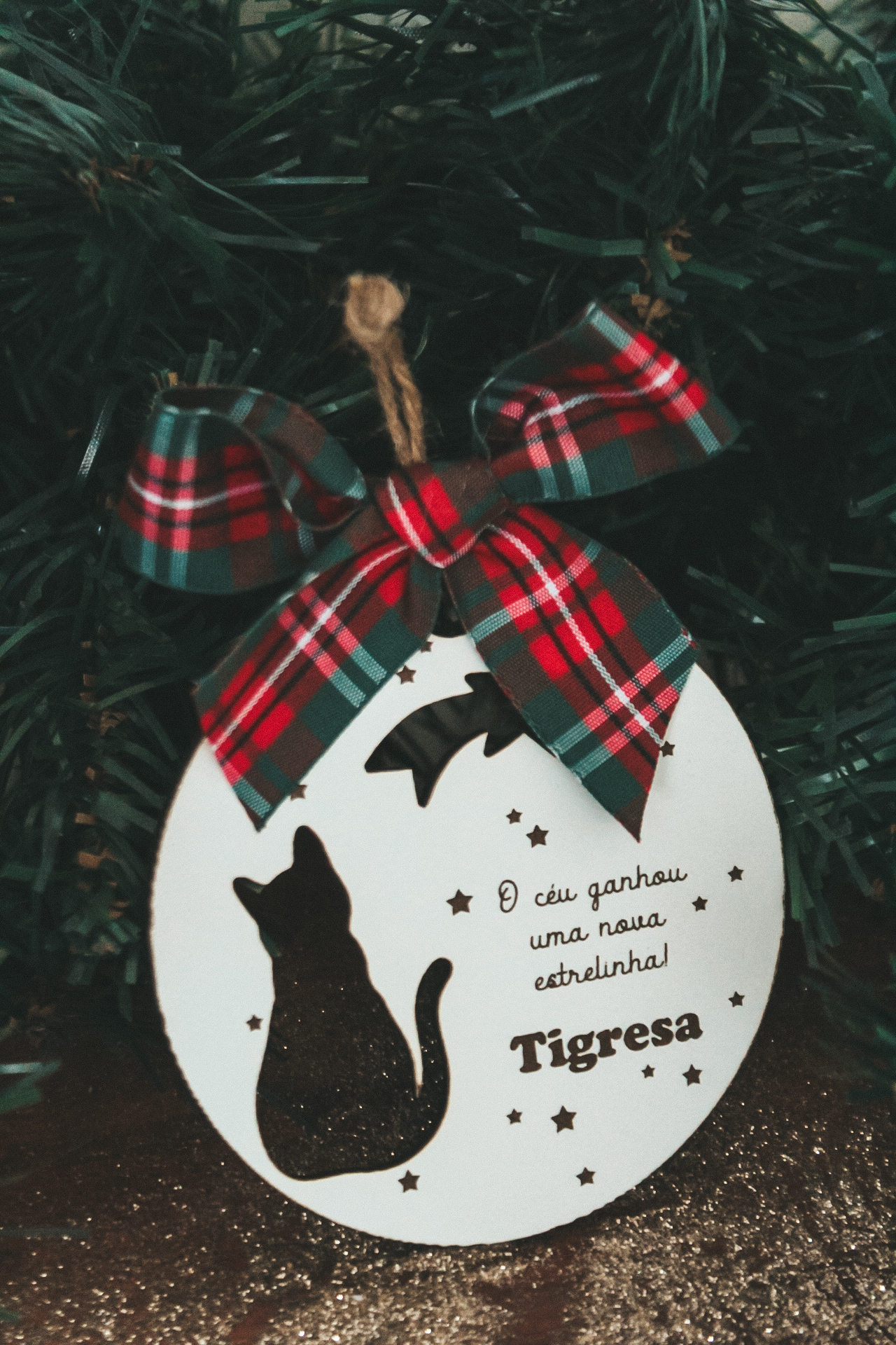 • Ornamento redondo branco com texto e recorte de gato numa árvore de Natal verde.