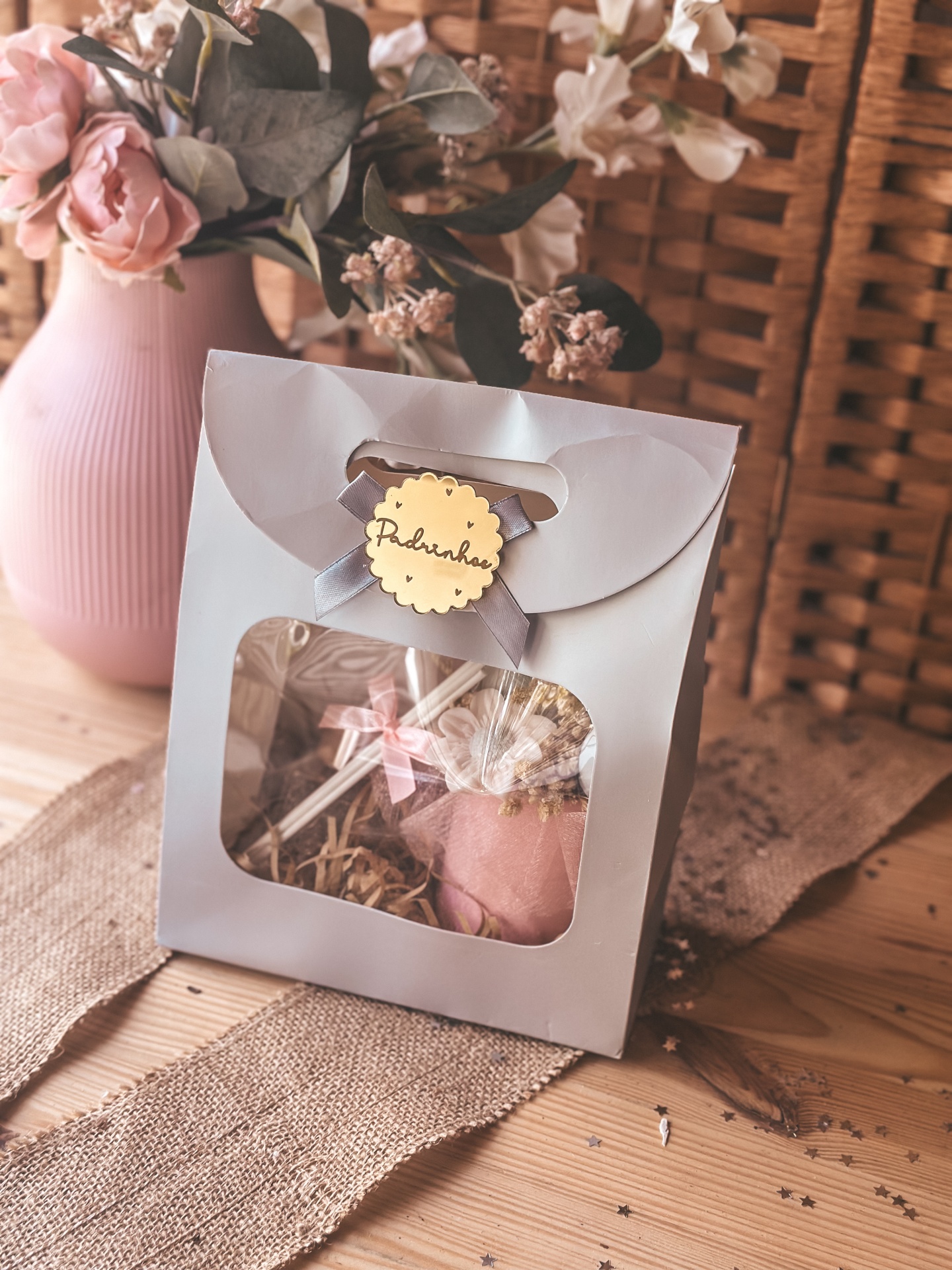 Bolsinha com cesta flores e ambientador padrinhos