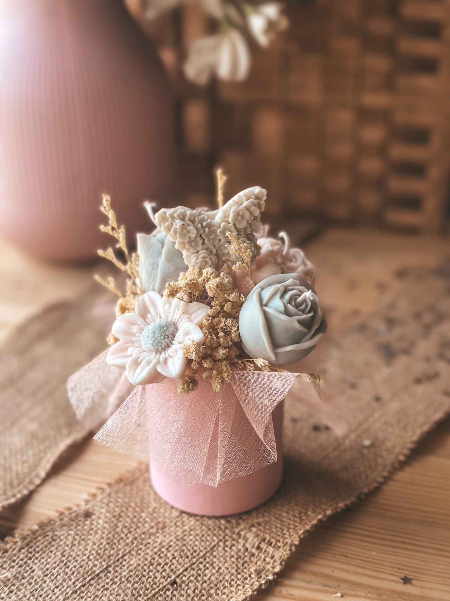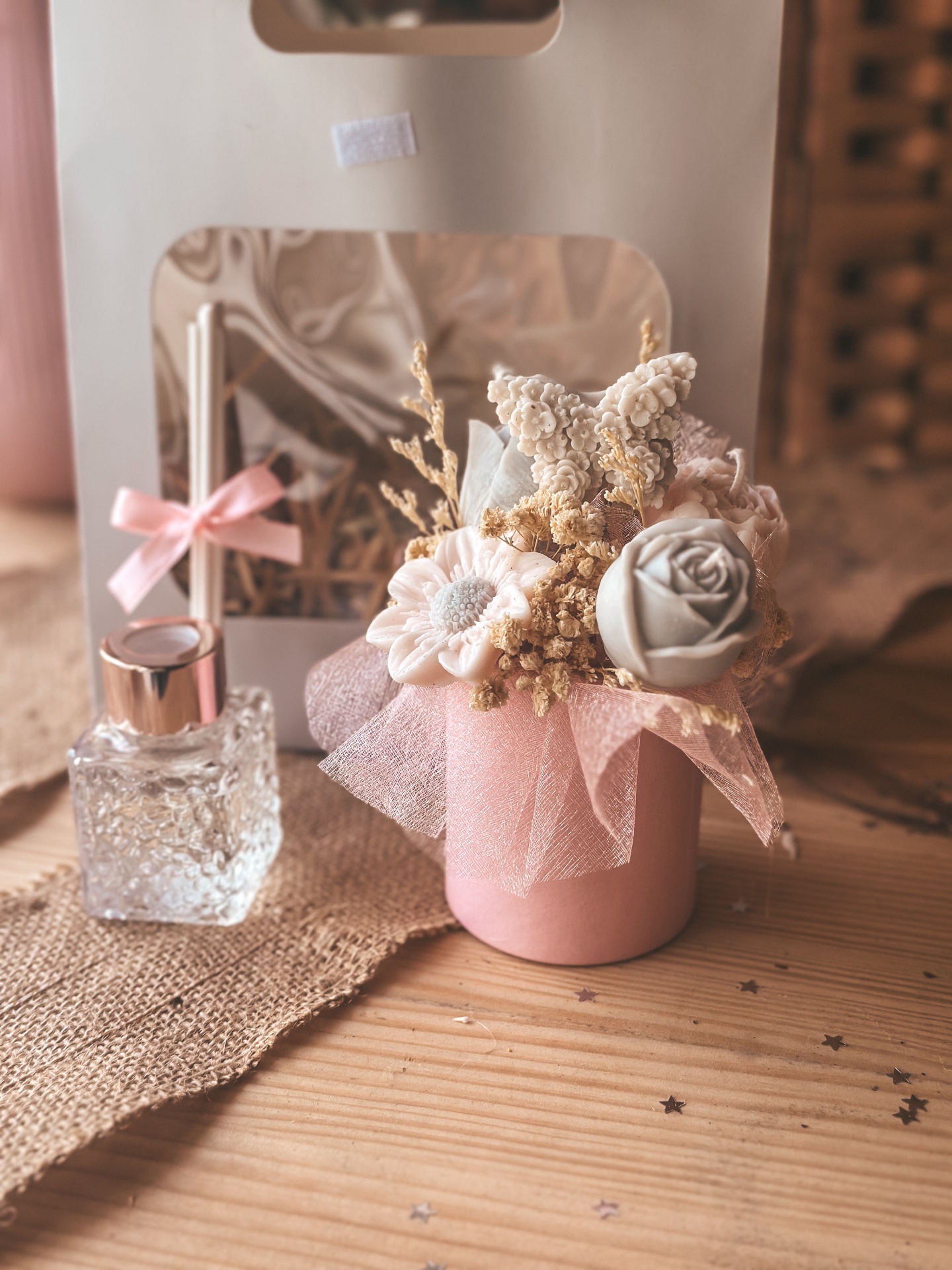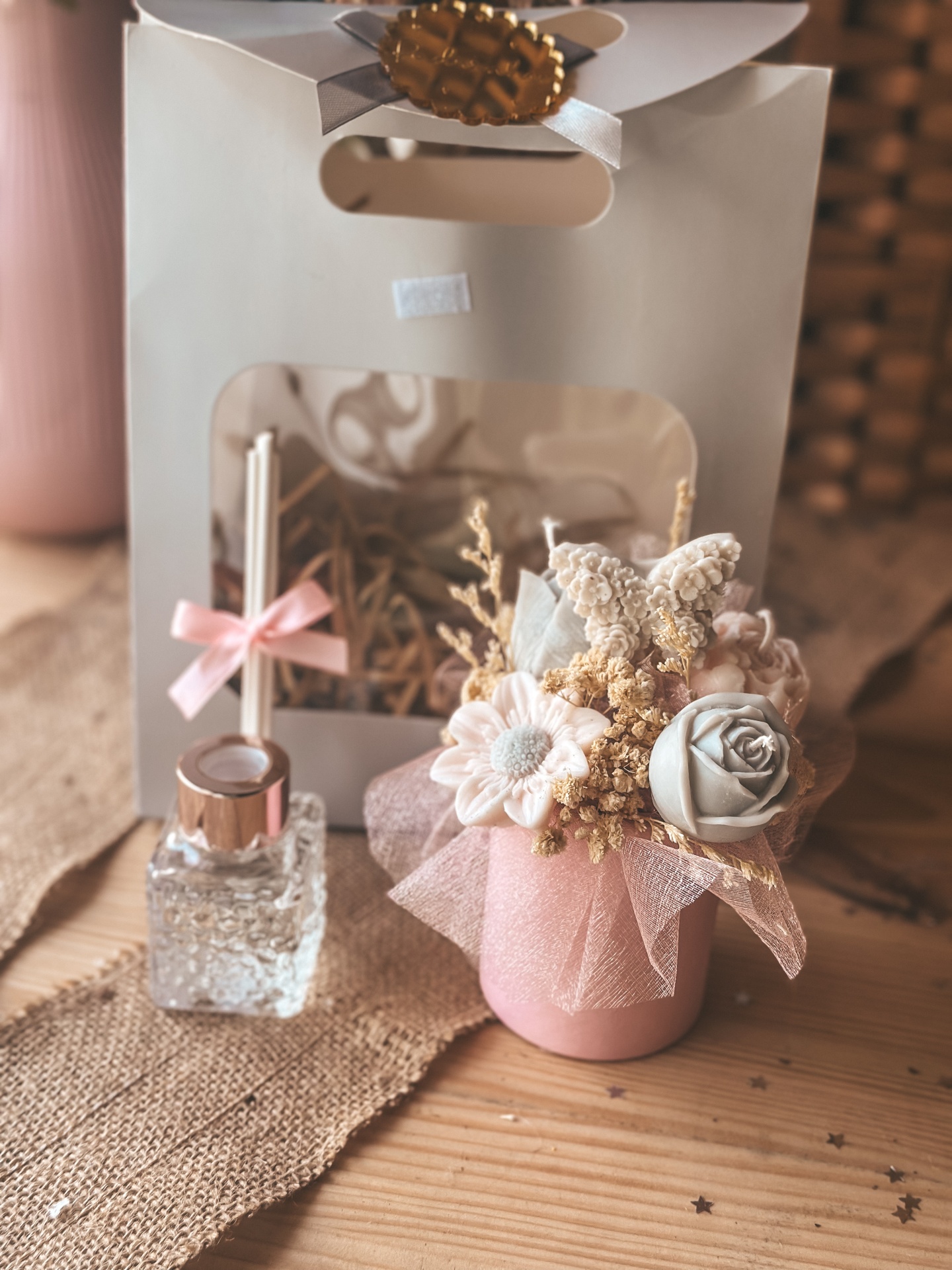 Bolsinha com cestinha de flores e ambientador.