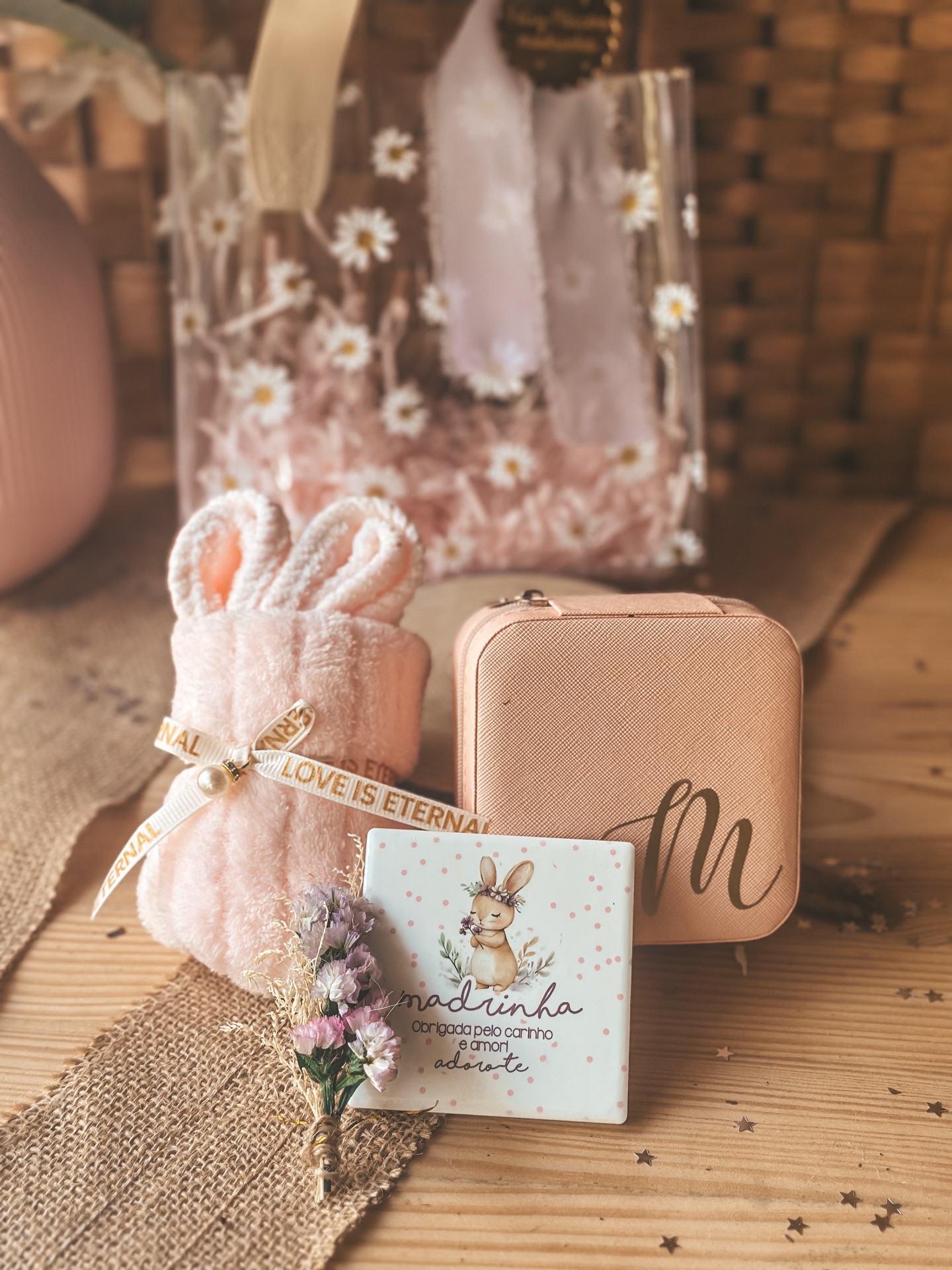 Bolsinha madrinha coelho 17,99 € Desconto de %. IVA incluído. contem: 1 porta joias, 1 iman, 1 toalha em formato coelho Ler mais O produto encontra-se sem stock.