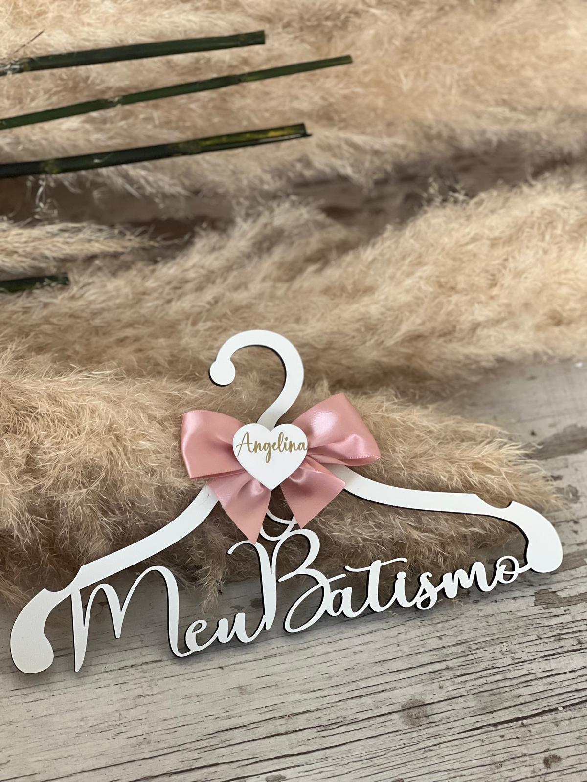 • Cabide branco para roupa com texto Meu Batismo e laço rosa