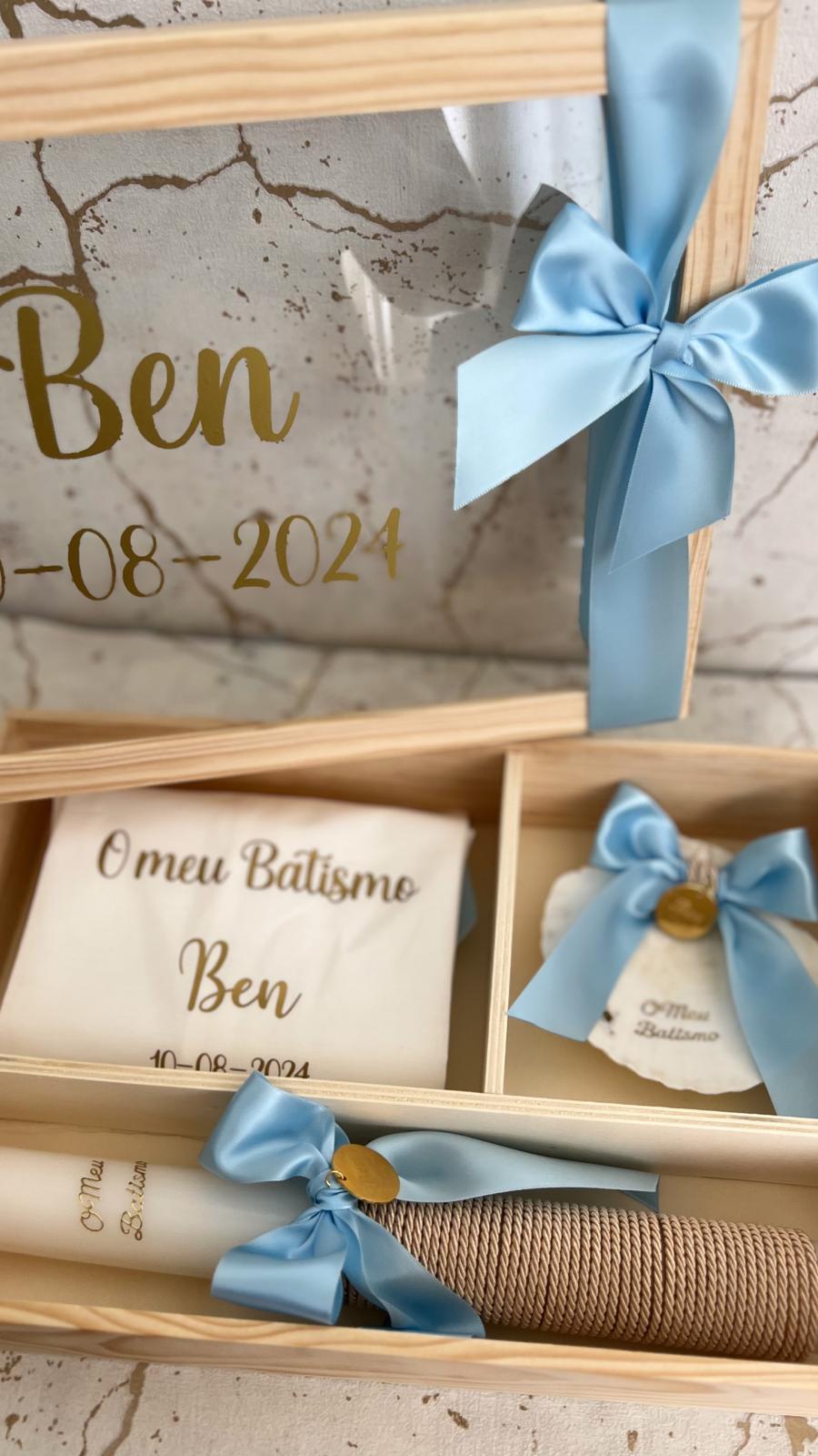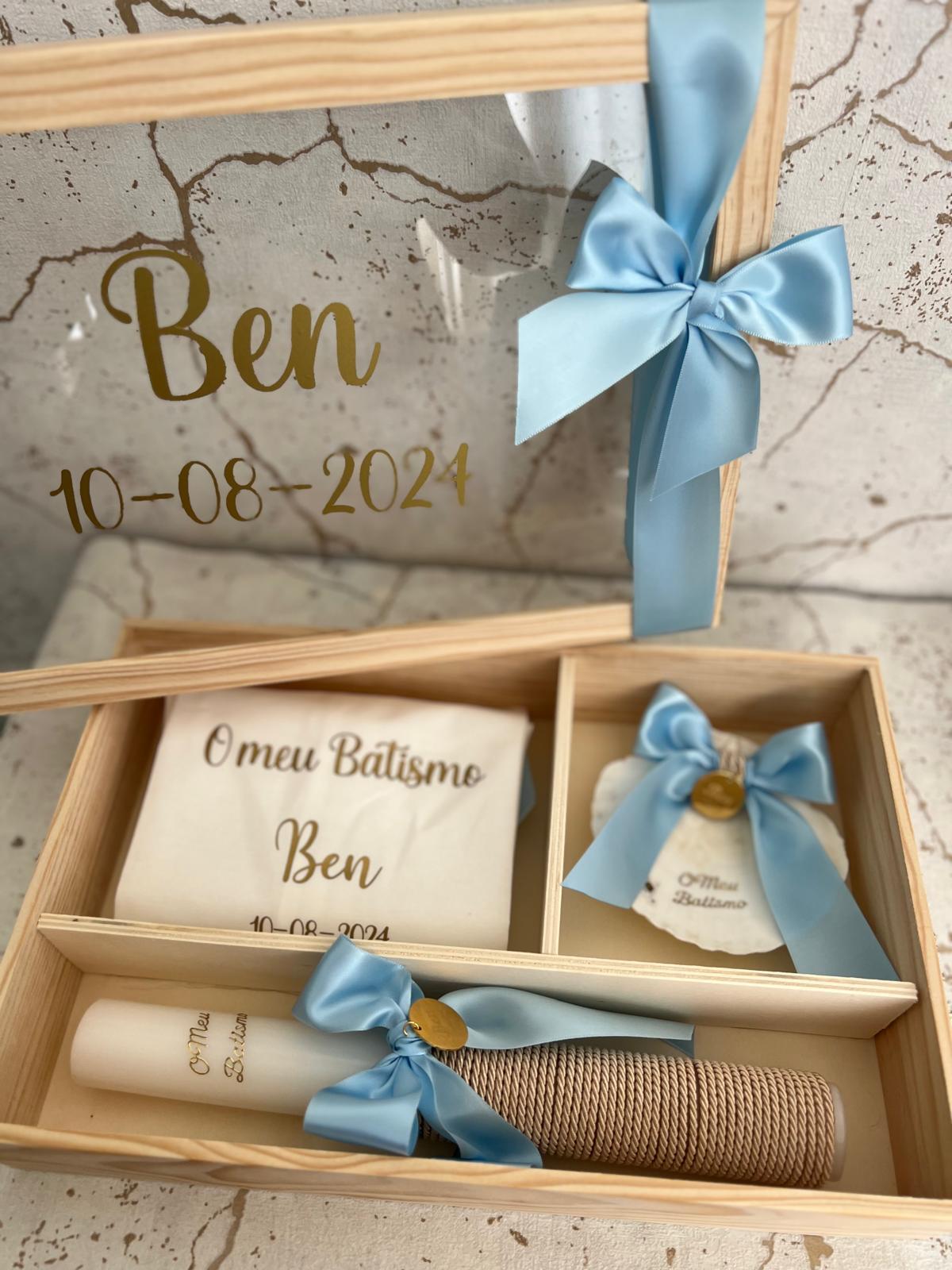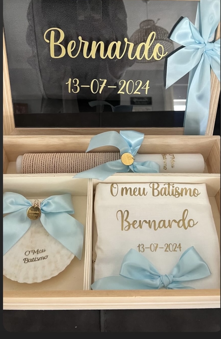 • Conjunto de batismo com caixa, toalha, vela e concha decorados