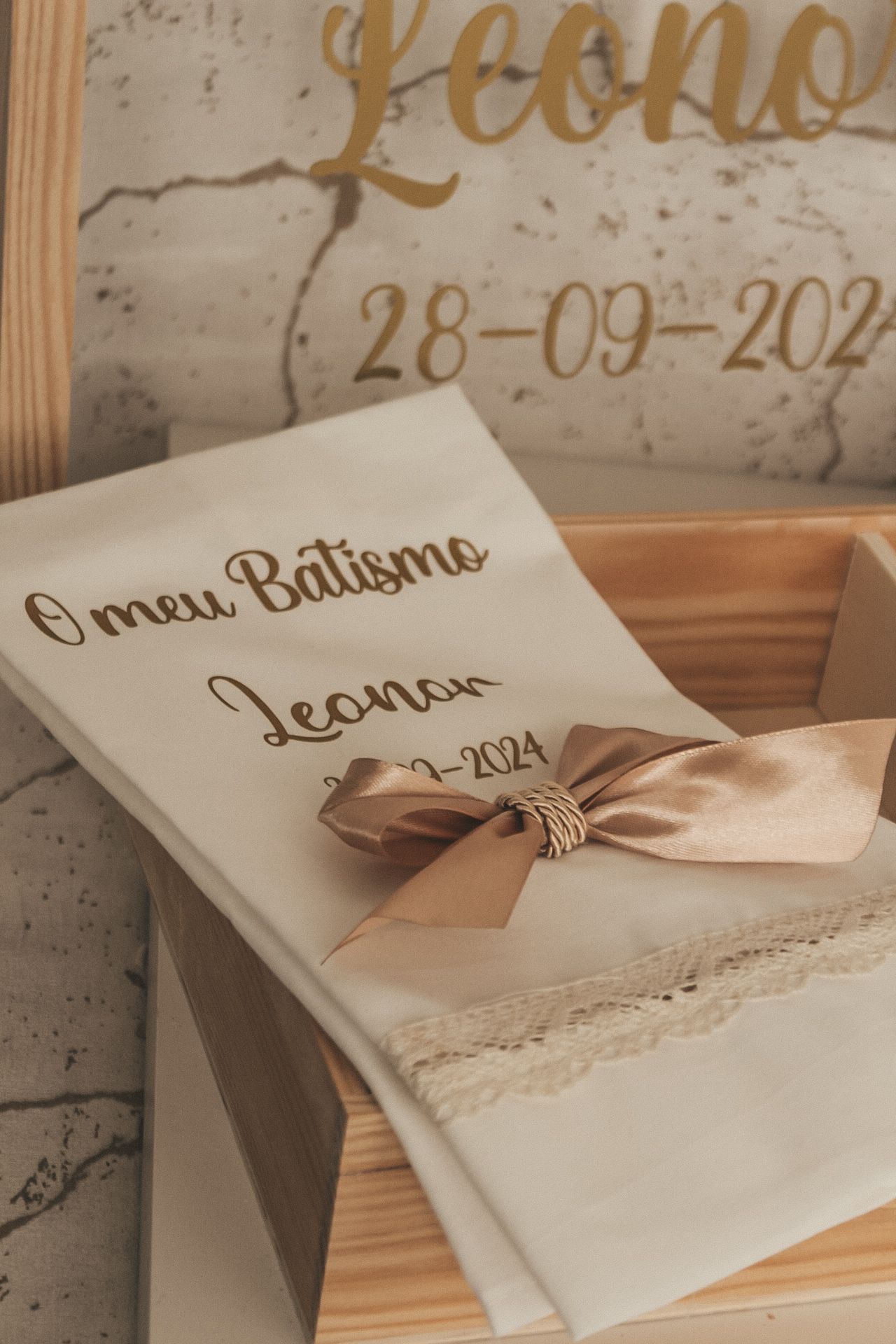 • Conjunto para batismo com vela, toalha bordada e caixa de madeira decorativa em castanho e bege