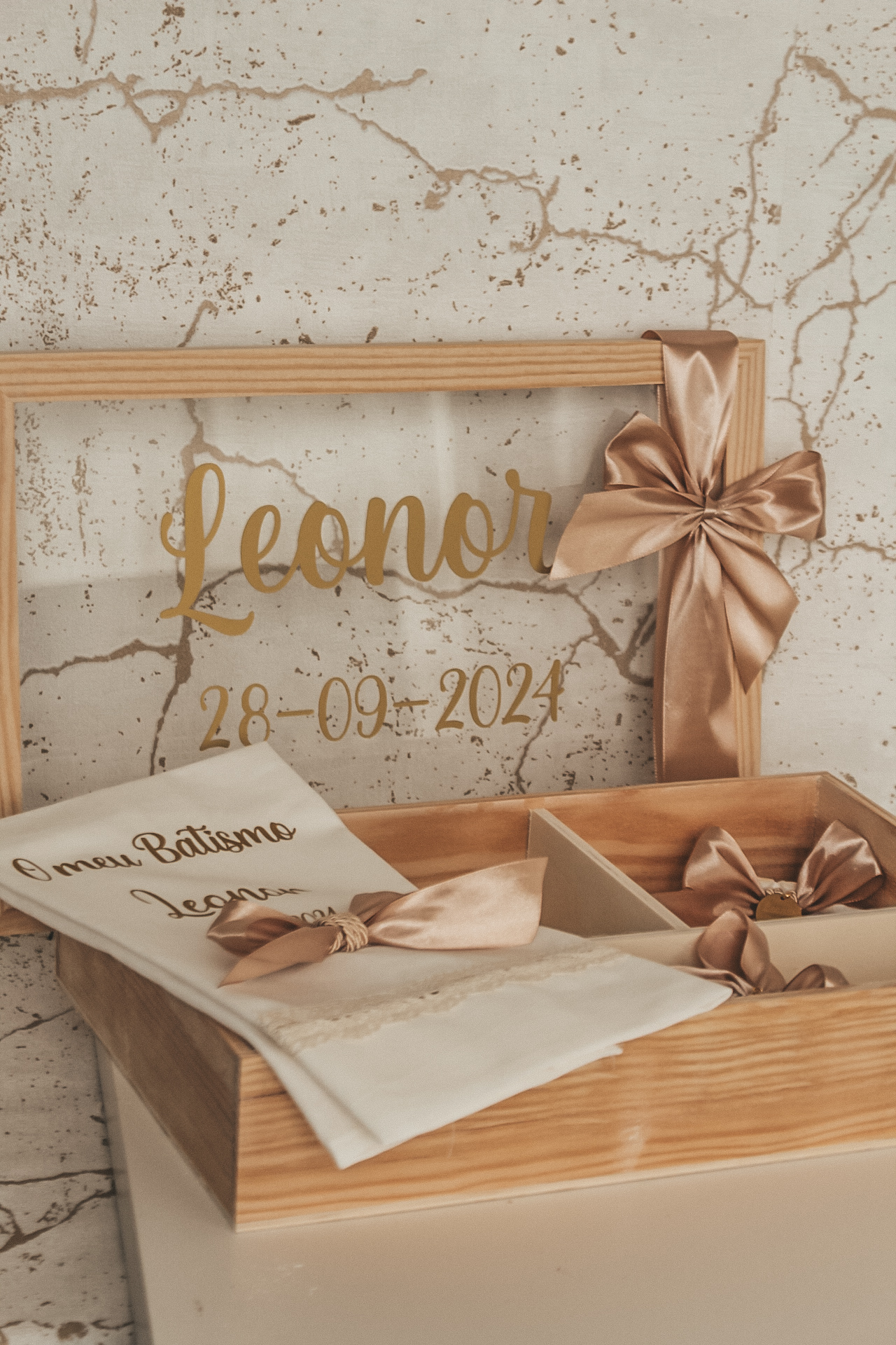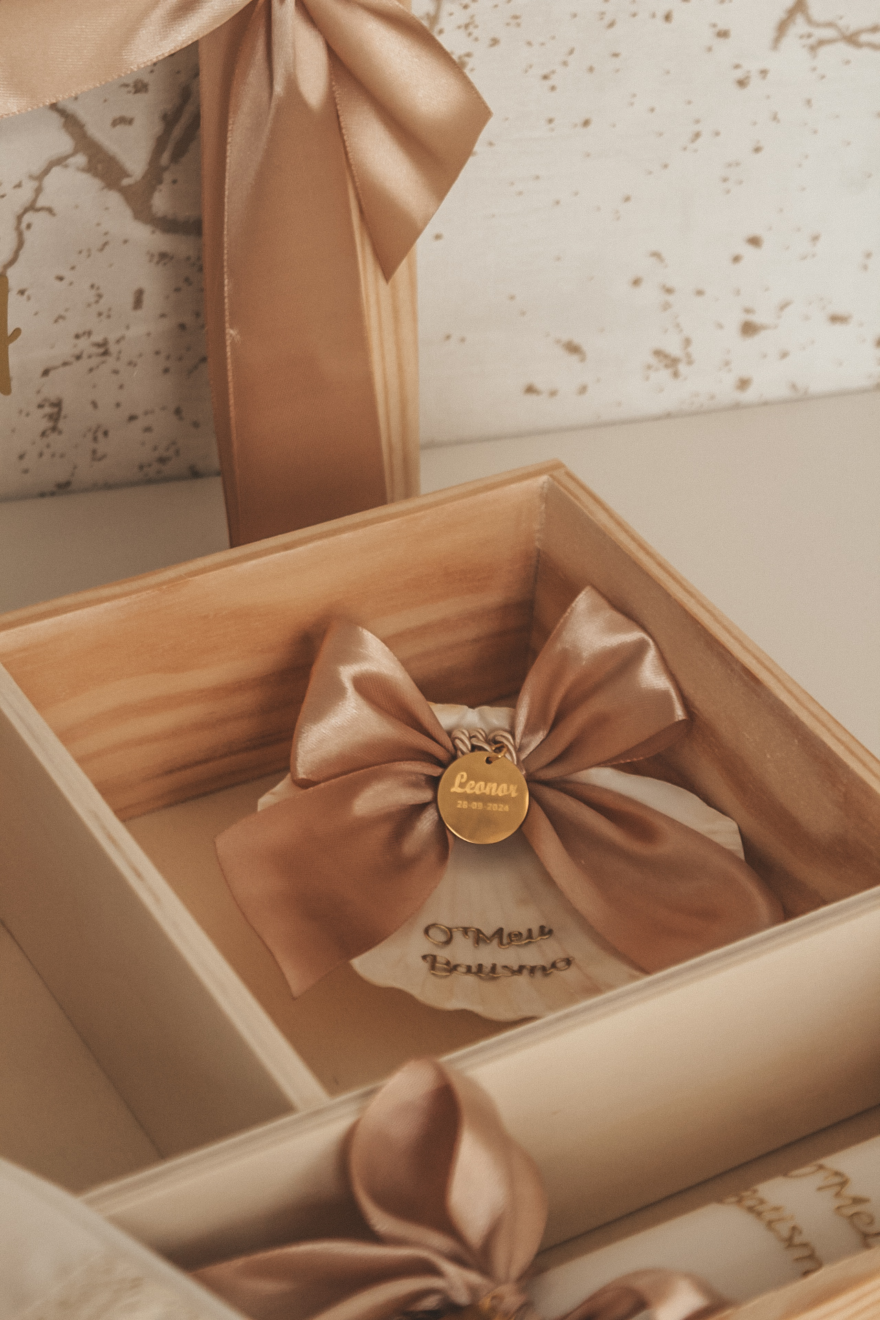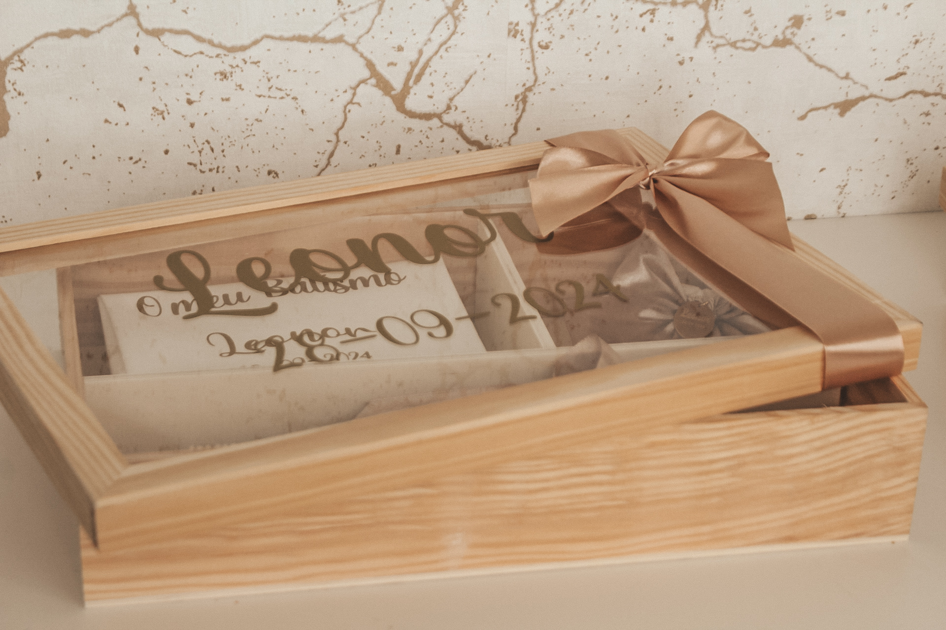 • Caixa de batismo decorada com laços e inscrição personalizável em vidro