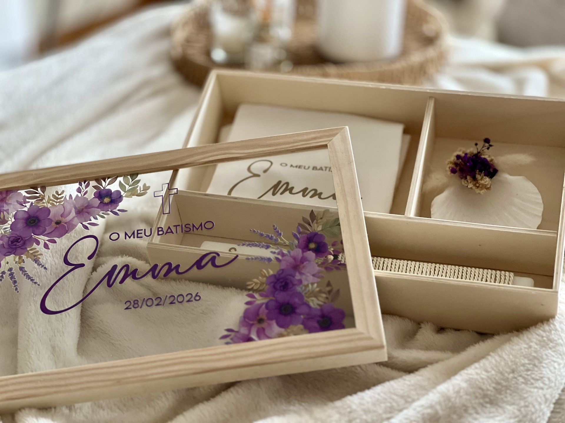 • Caixa de batismo em madeira clara com tampa de vidro decorada e flores secas no interior