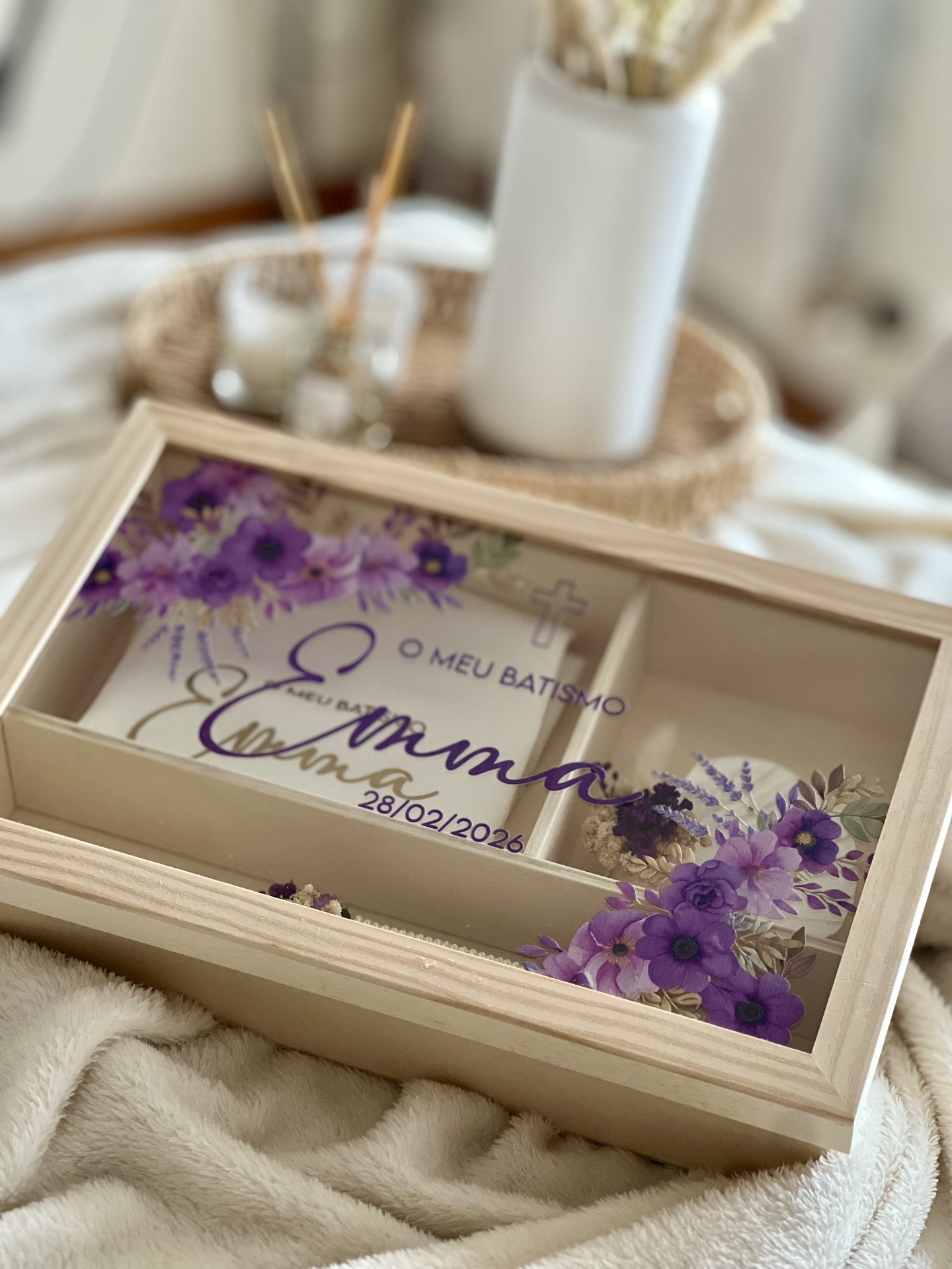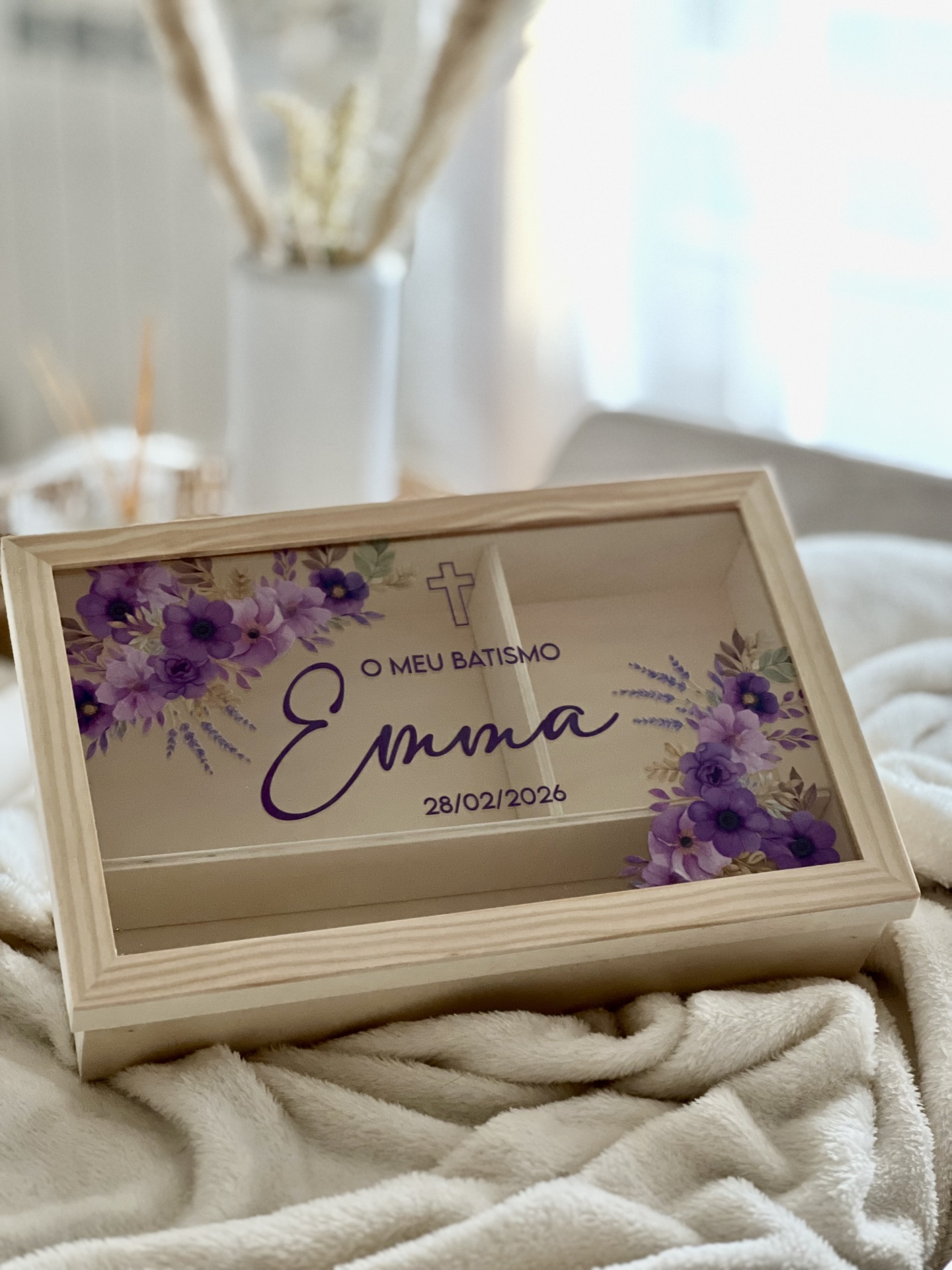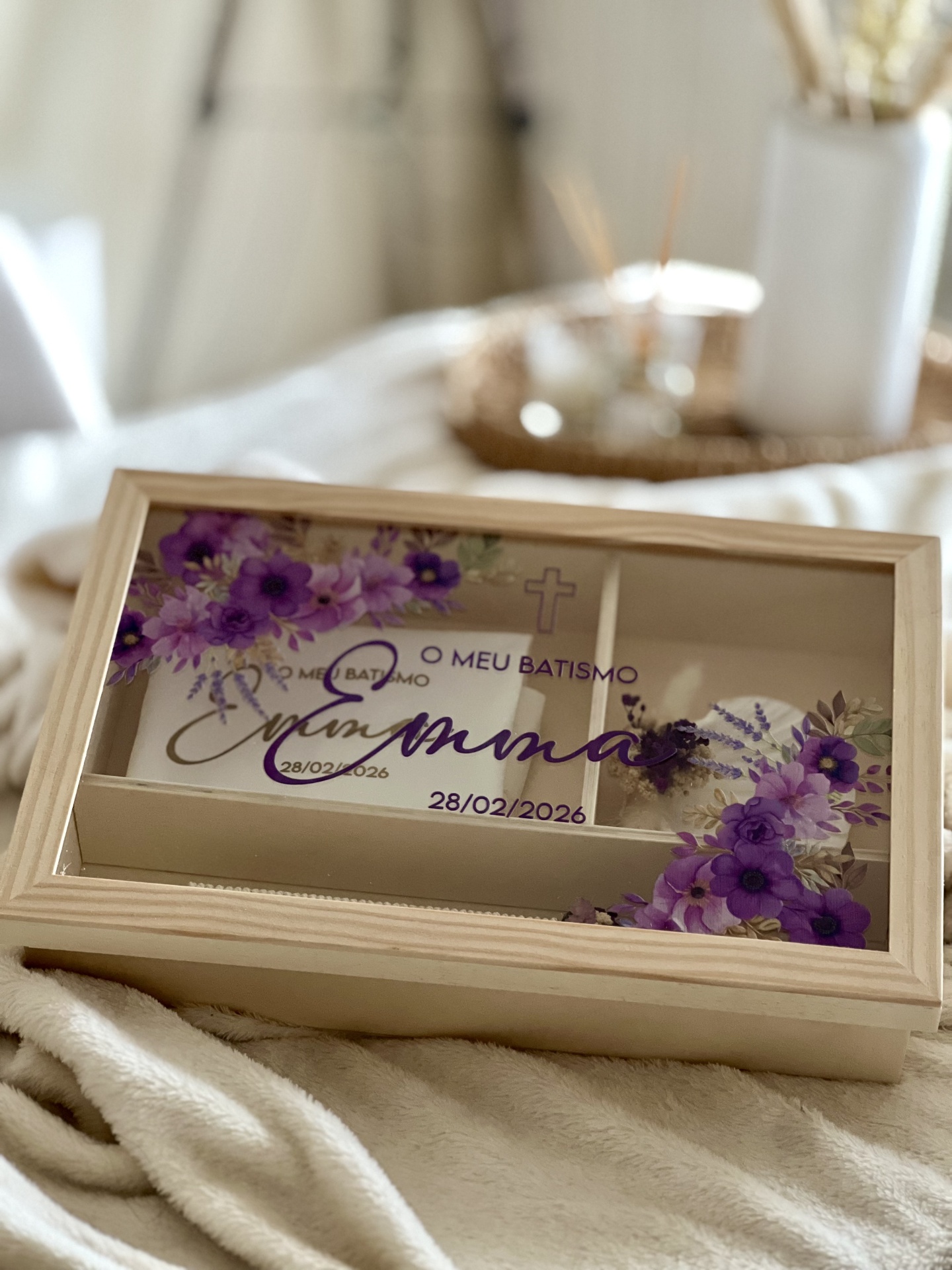 • Caixa de batismo com decoração floral roxa e texto personalizado no vidro.