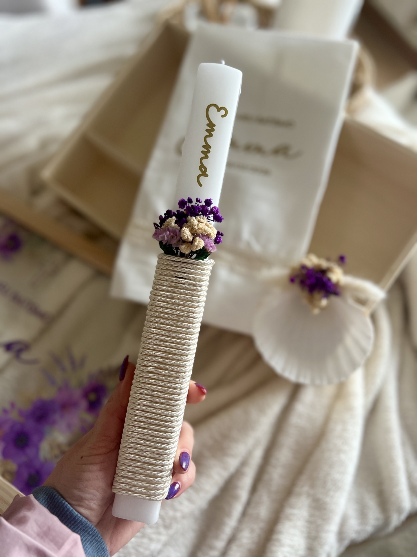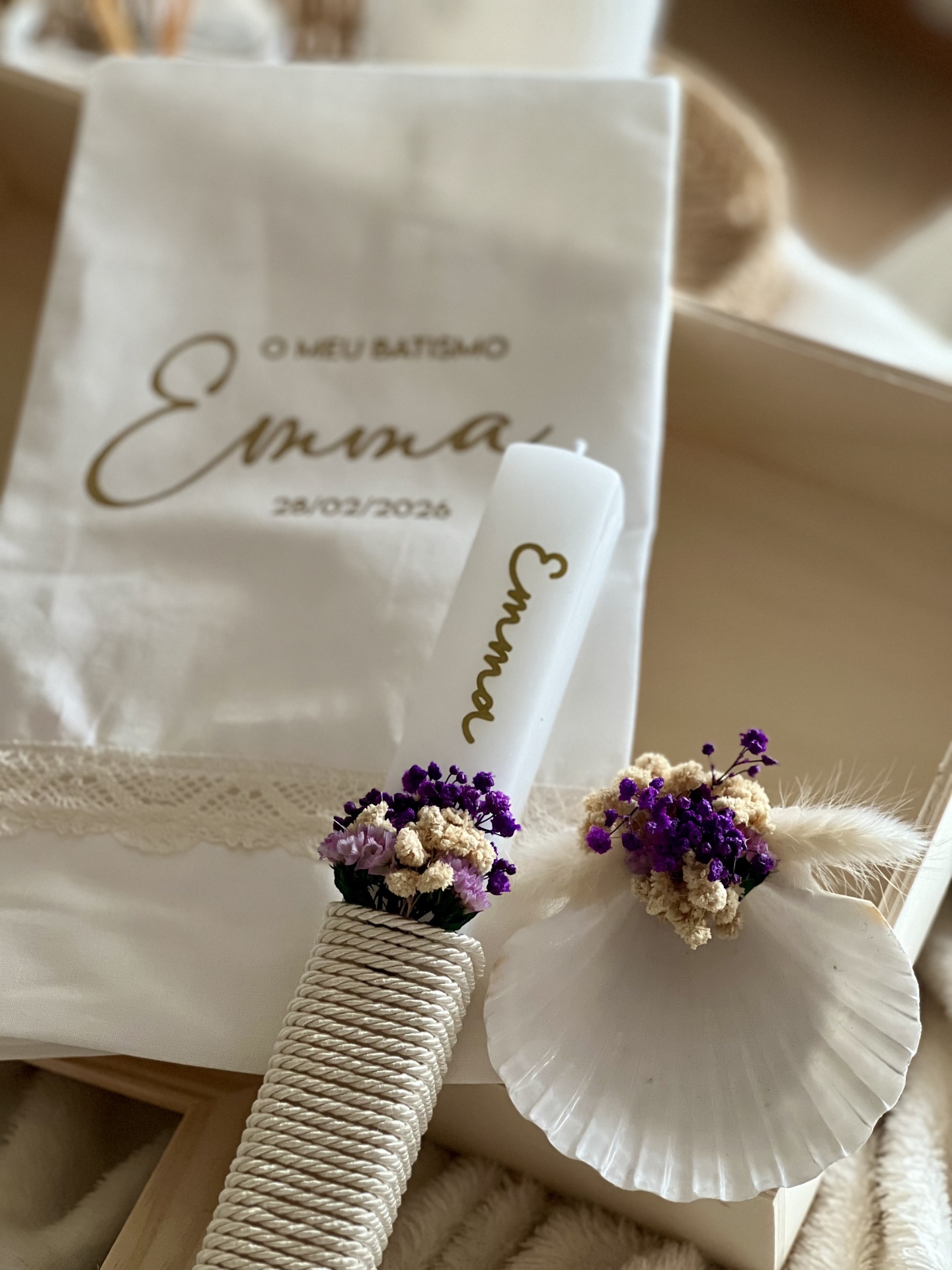• Conjunto de batismo com vela personalizada, flores secas, concha e pano decorativo branco
