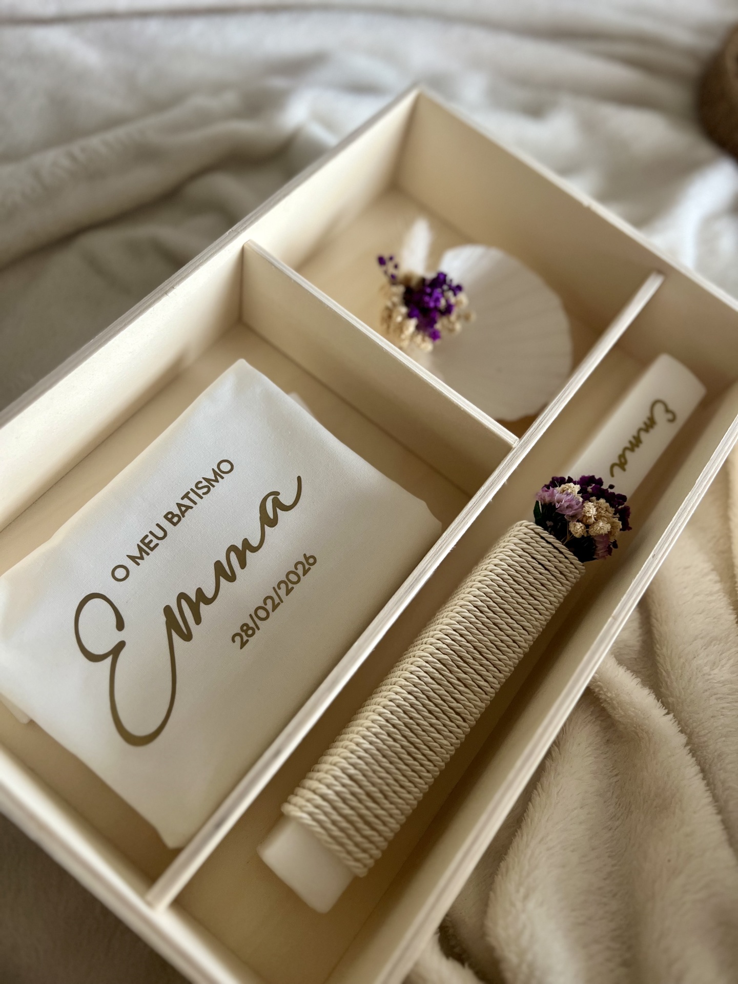 • Caixa bege com vela, toalha personalizada de batismo e concha decorativa com flores
