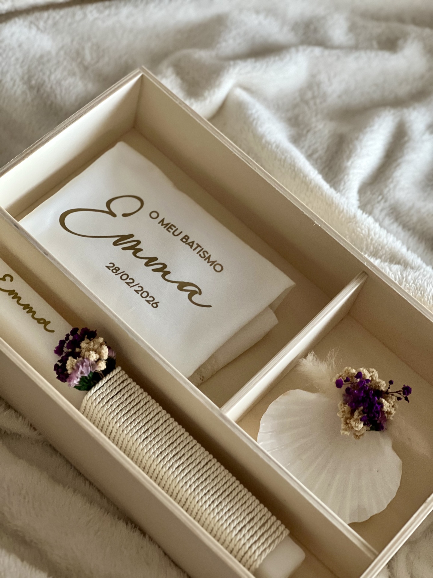 • Kit batismo com vela decorada, toalha branca com texto e concha com flores secas em caixa de madeira.