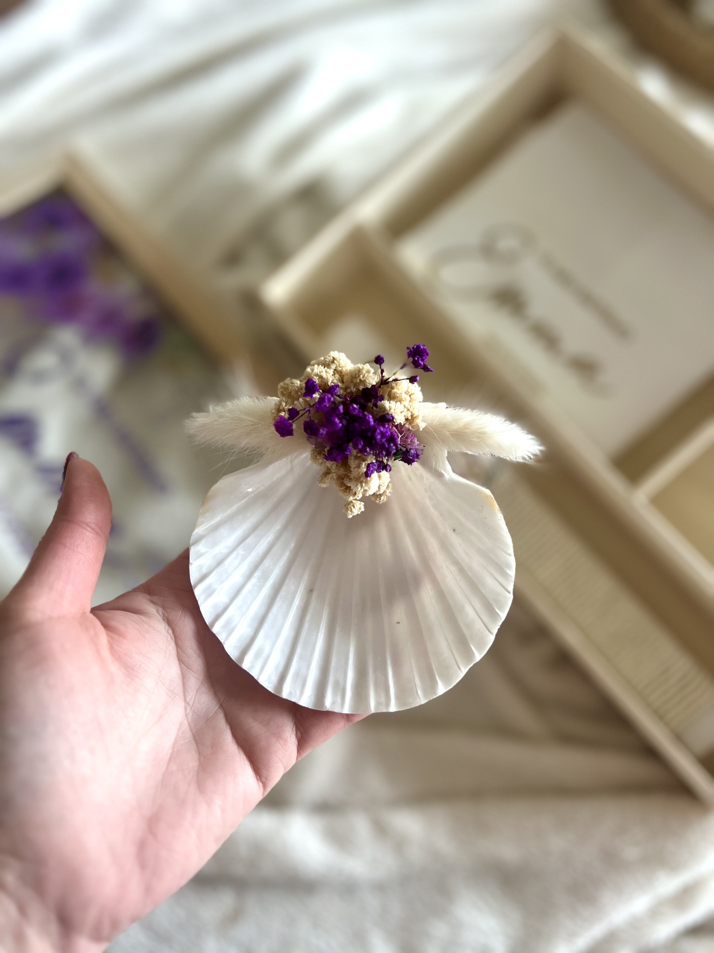 • Concha decorativa com flores secas roxas e creme