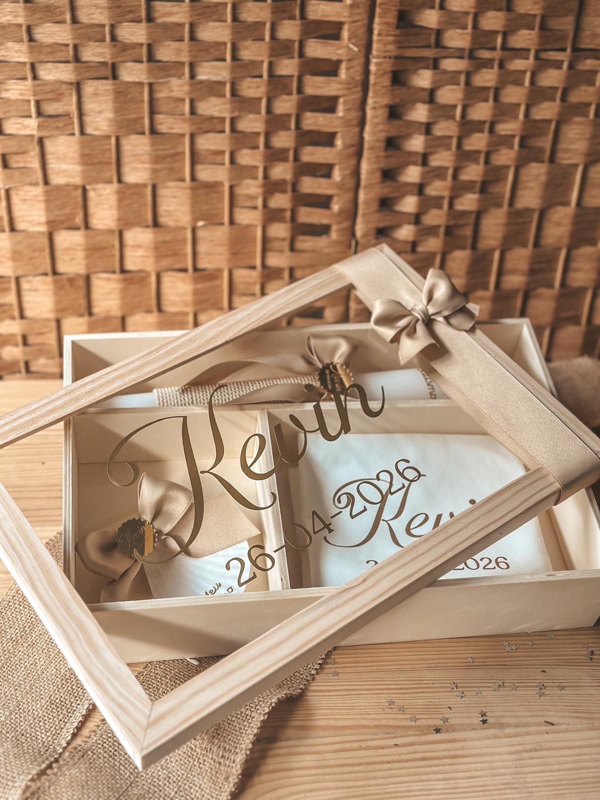 • Caixa de madeira com tampa de vidro e nome Kevin dourado, com tecido branco e laços dentro, decoração em juta e fundo rústico.