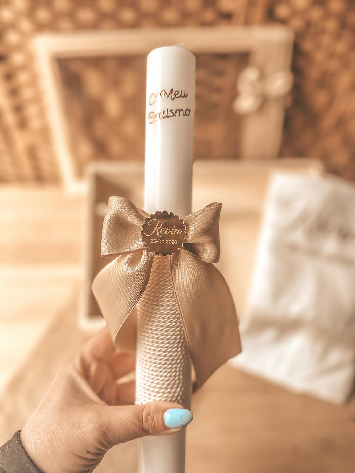 • Vela de batismo branca decorada com laço castanho e corda natural