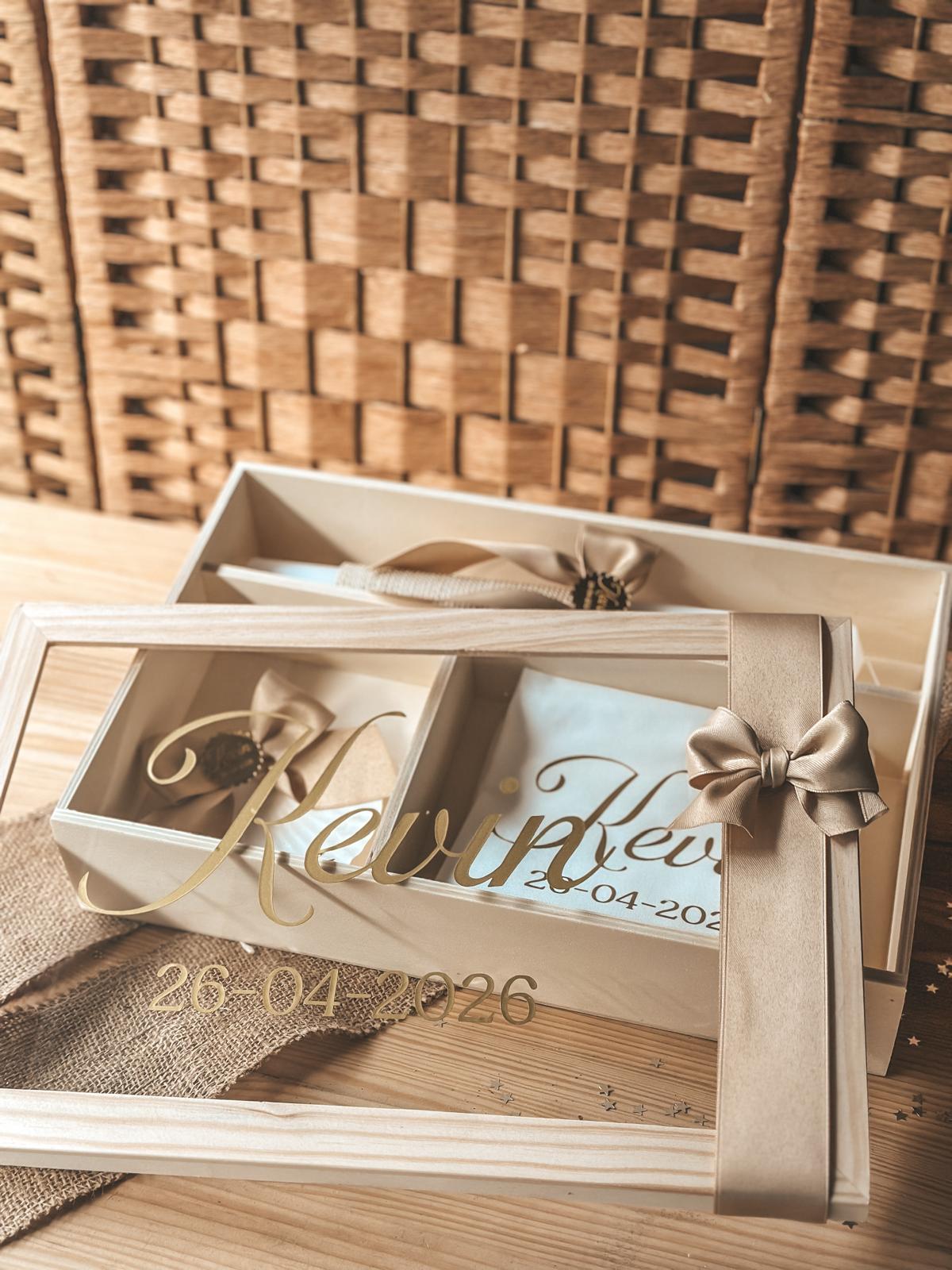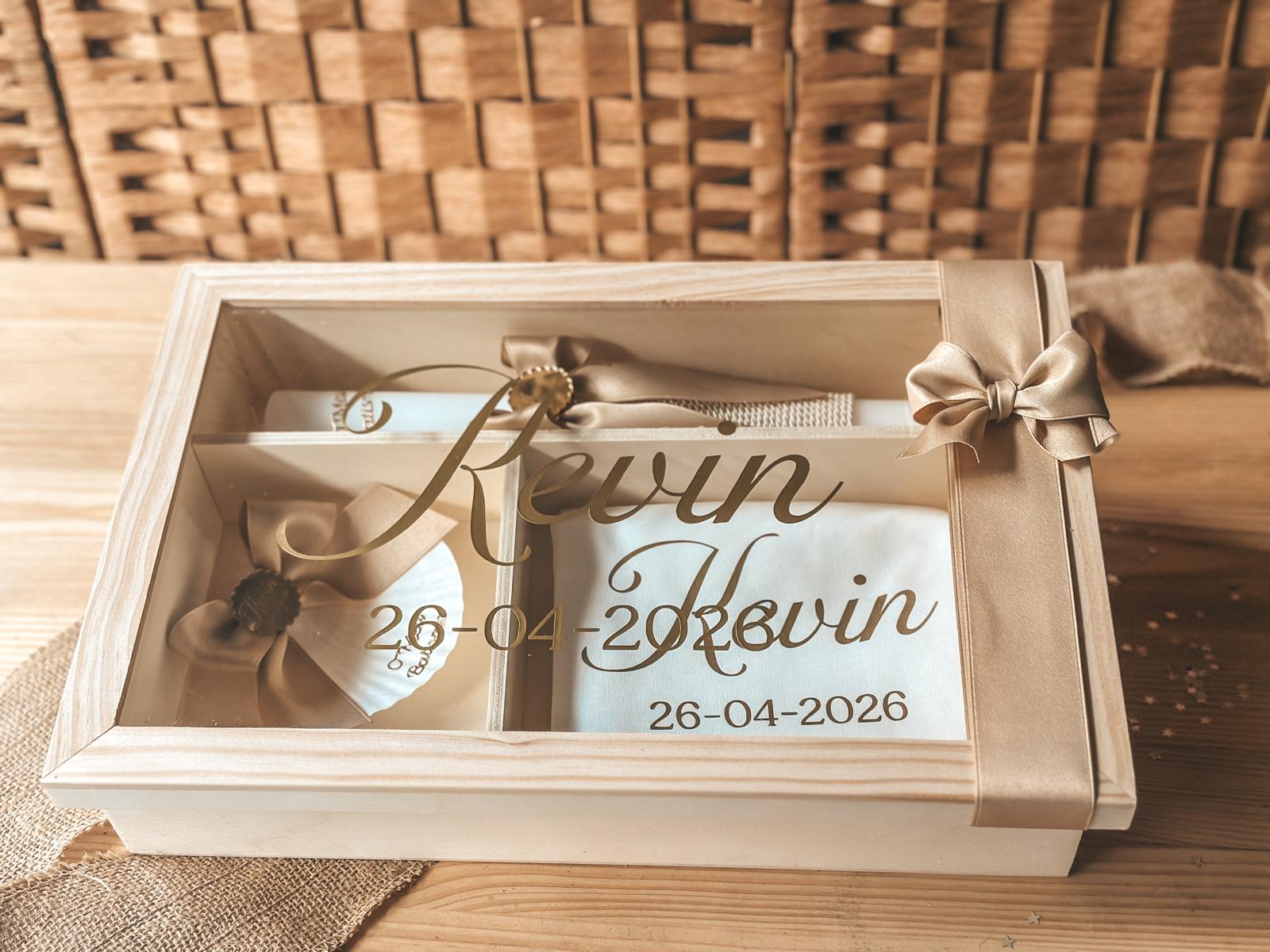 • Caixa de lembrança com tampa de vidro, fita bege e texto Kevin 26-04-2026