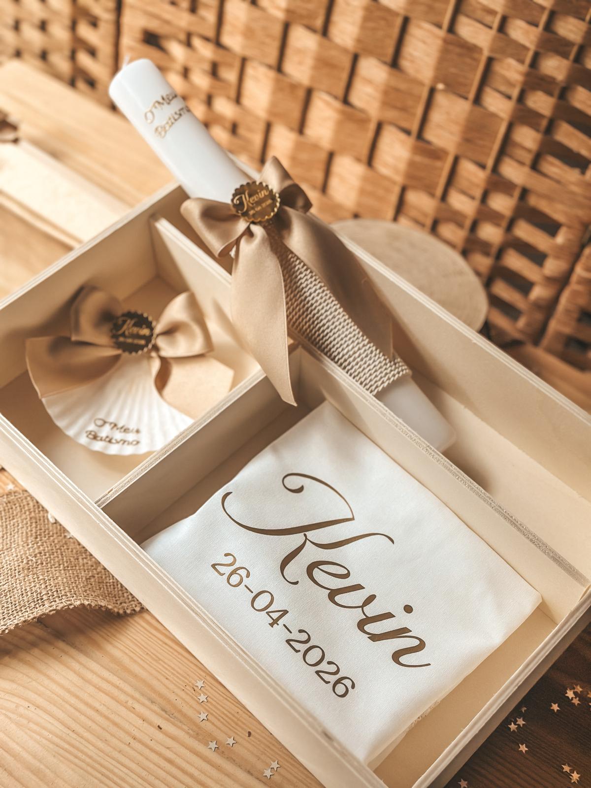 • Conjunto de batismo com vela decorada, pente e pano personalizado numa caixa de madeira.