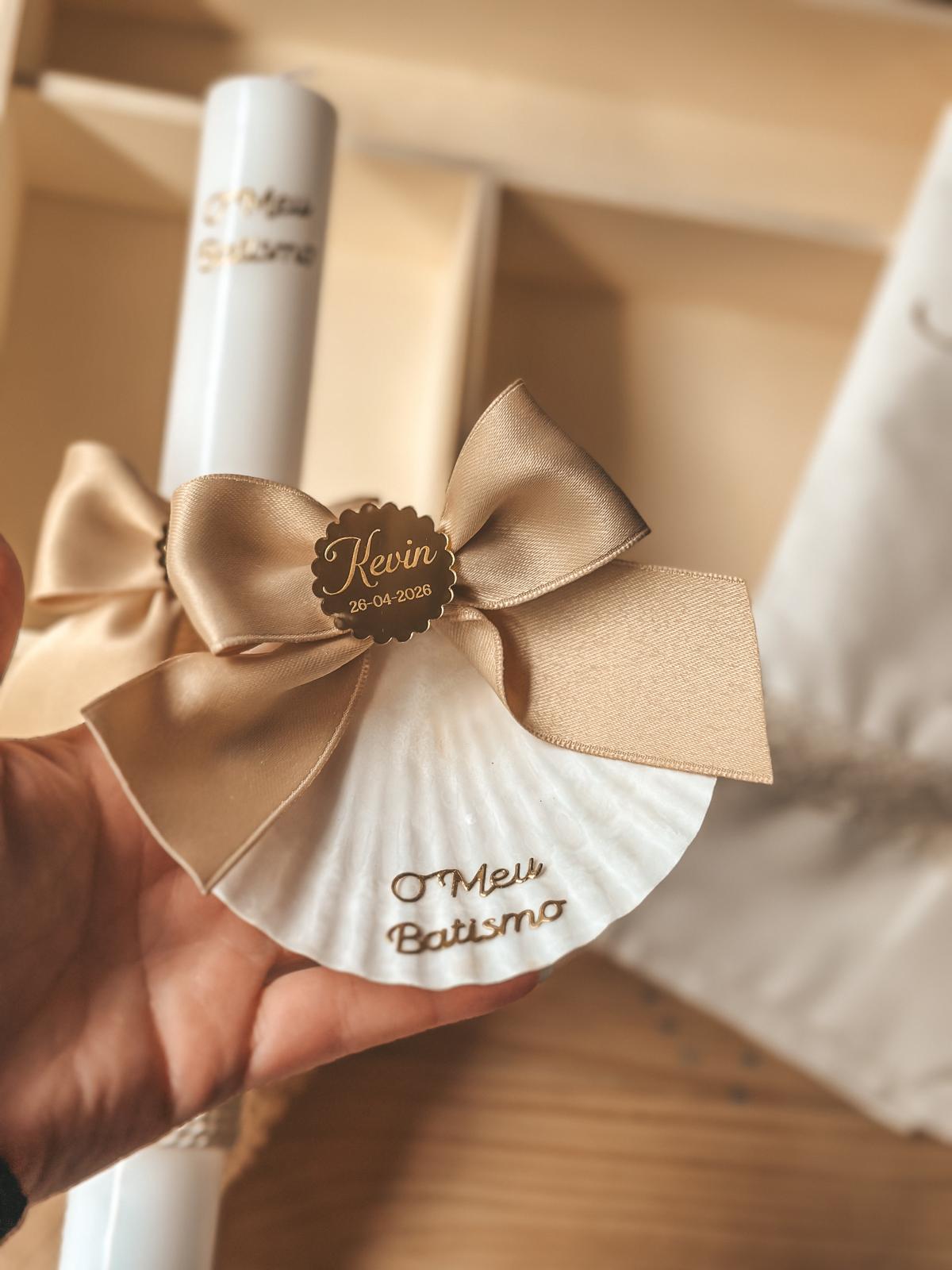 • Concha decorativa branca com laço castanho claro e etiqueta dourada personalizada com nome e data