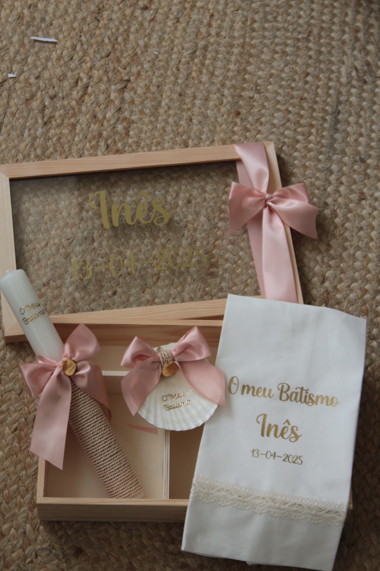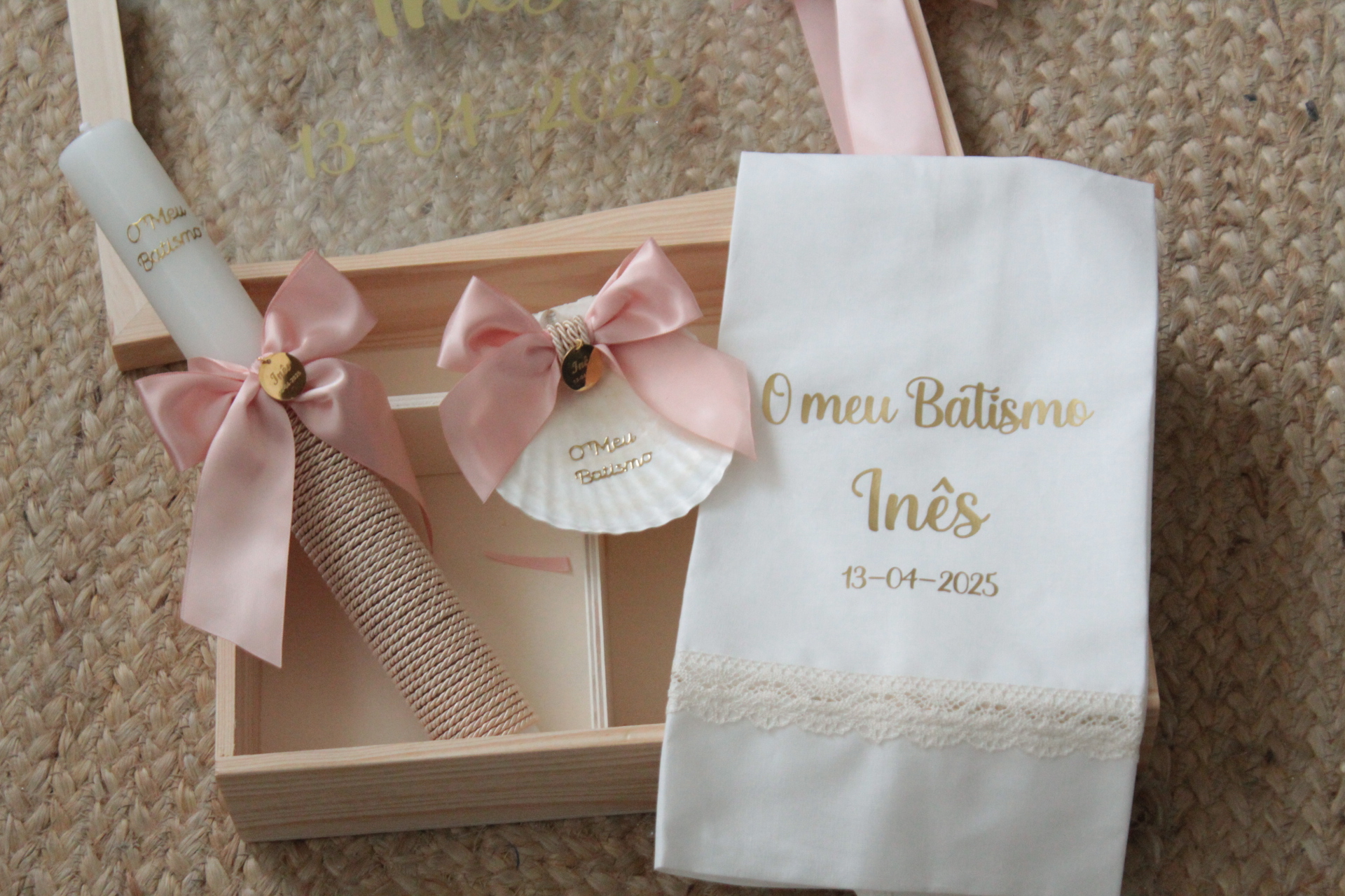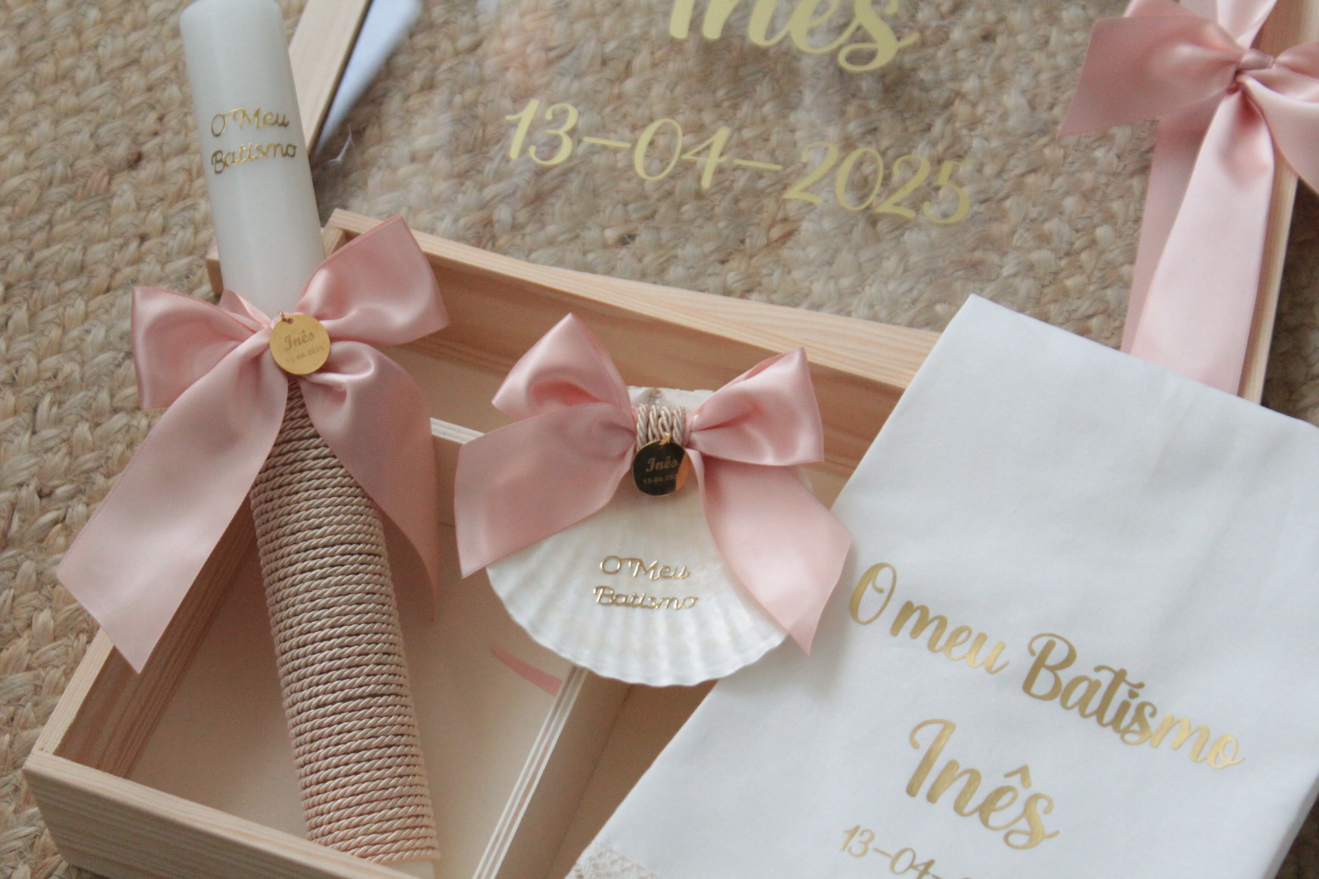 • Conjunto para batizado com vela, concha e caixa de madeira, decorados com laços rosa e bordados dourados