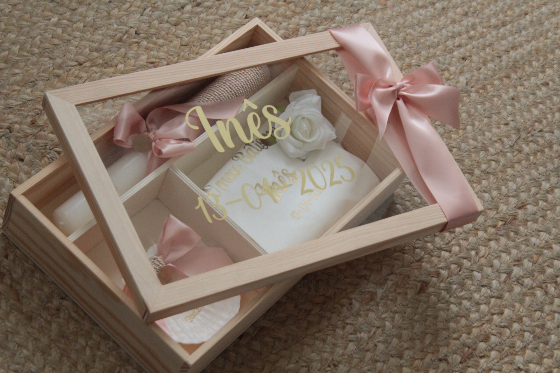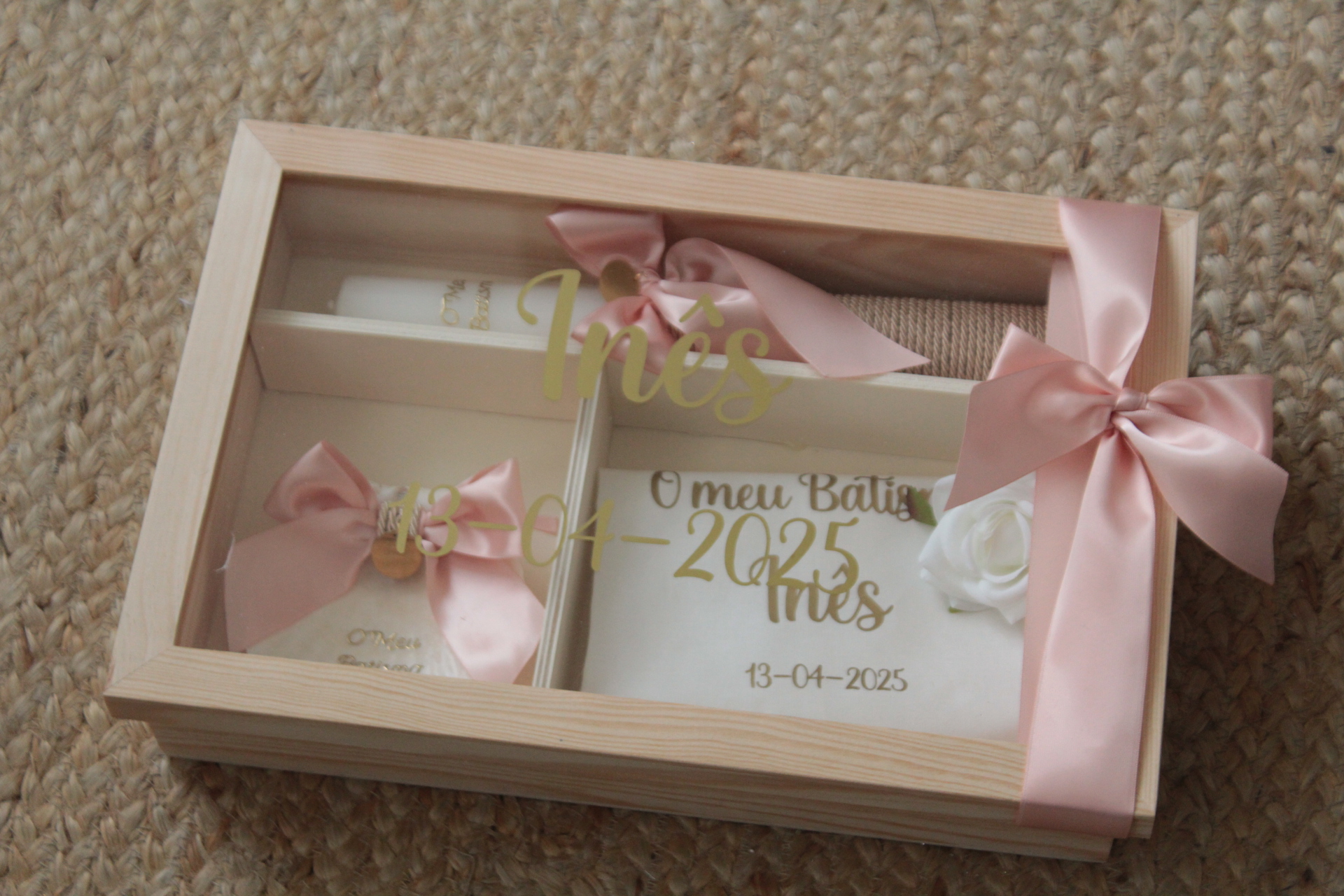 • Caixa de madeira com tampa de vidro e laço rosa contendo um objeto branco com inscrição dourada e flor branca