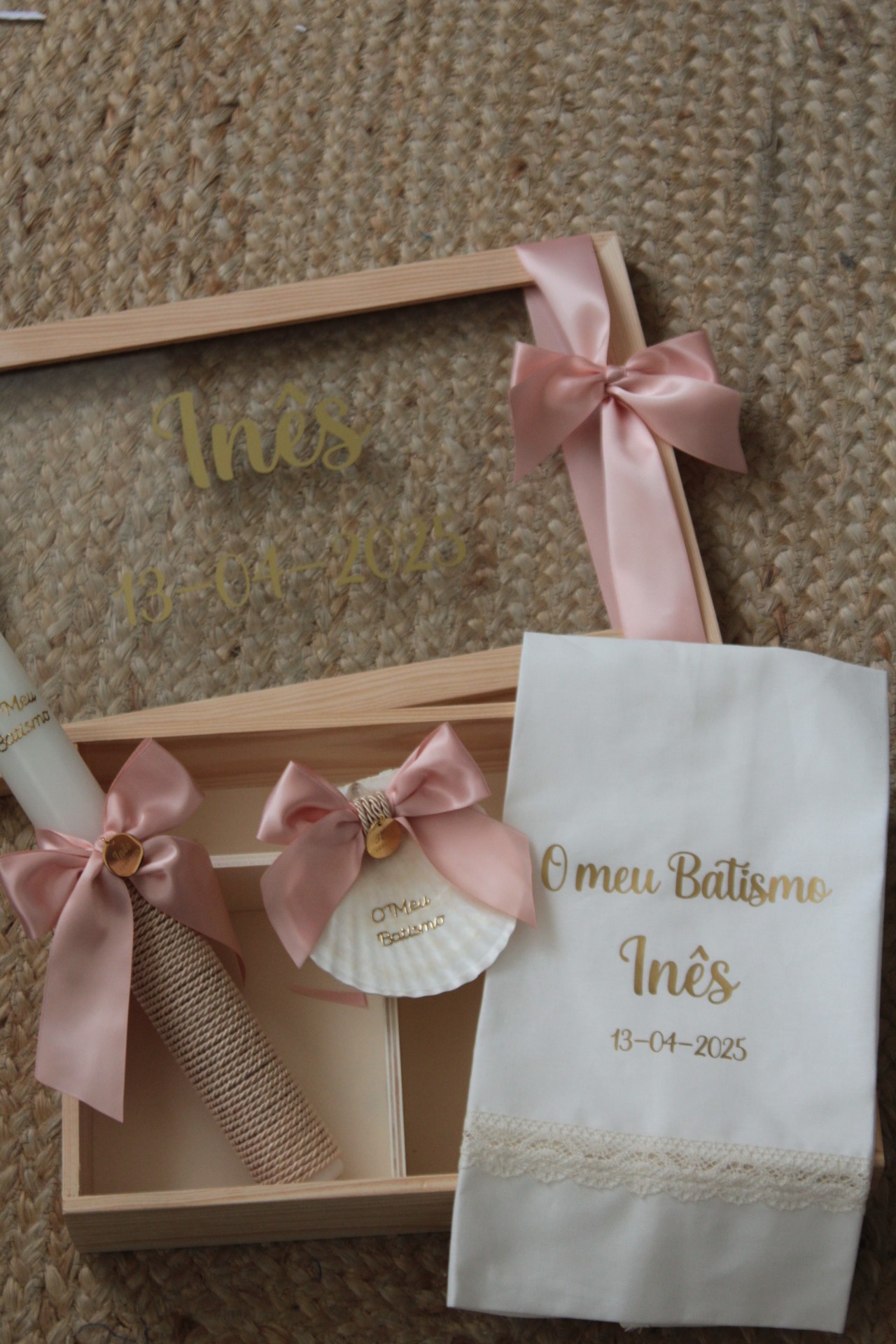 • Caixa de madeira com decoração rosa e texto dourado para batismo