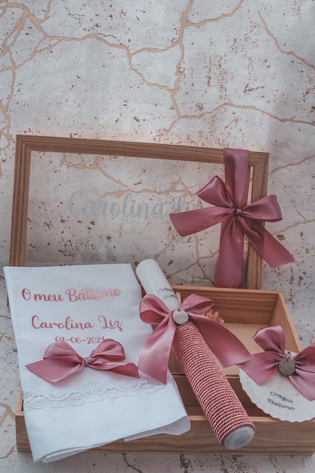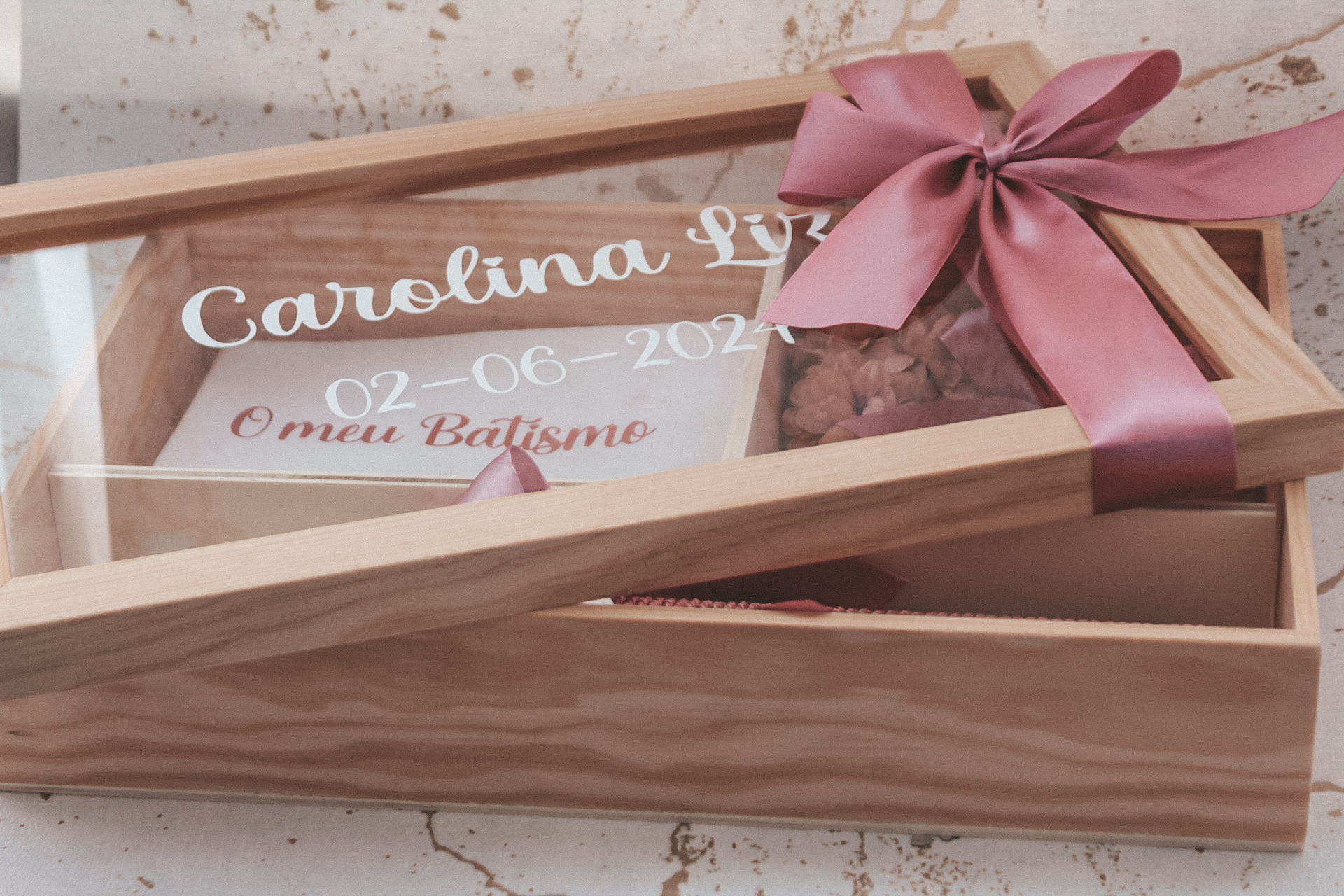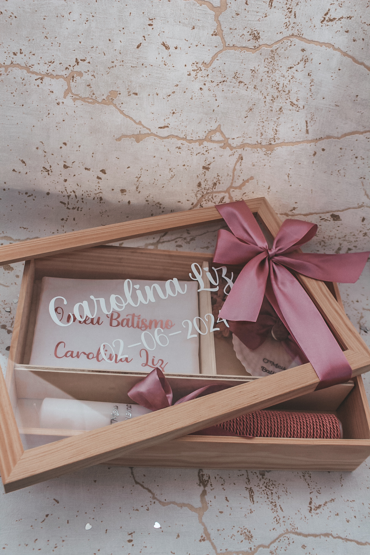 • Caixa de madeira com tampa de vidro e laço rosa com velas, toalha e cartão de batismo
