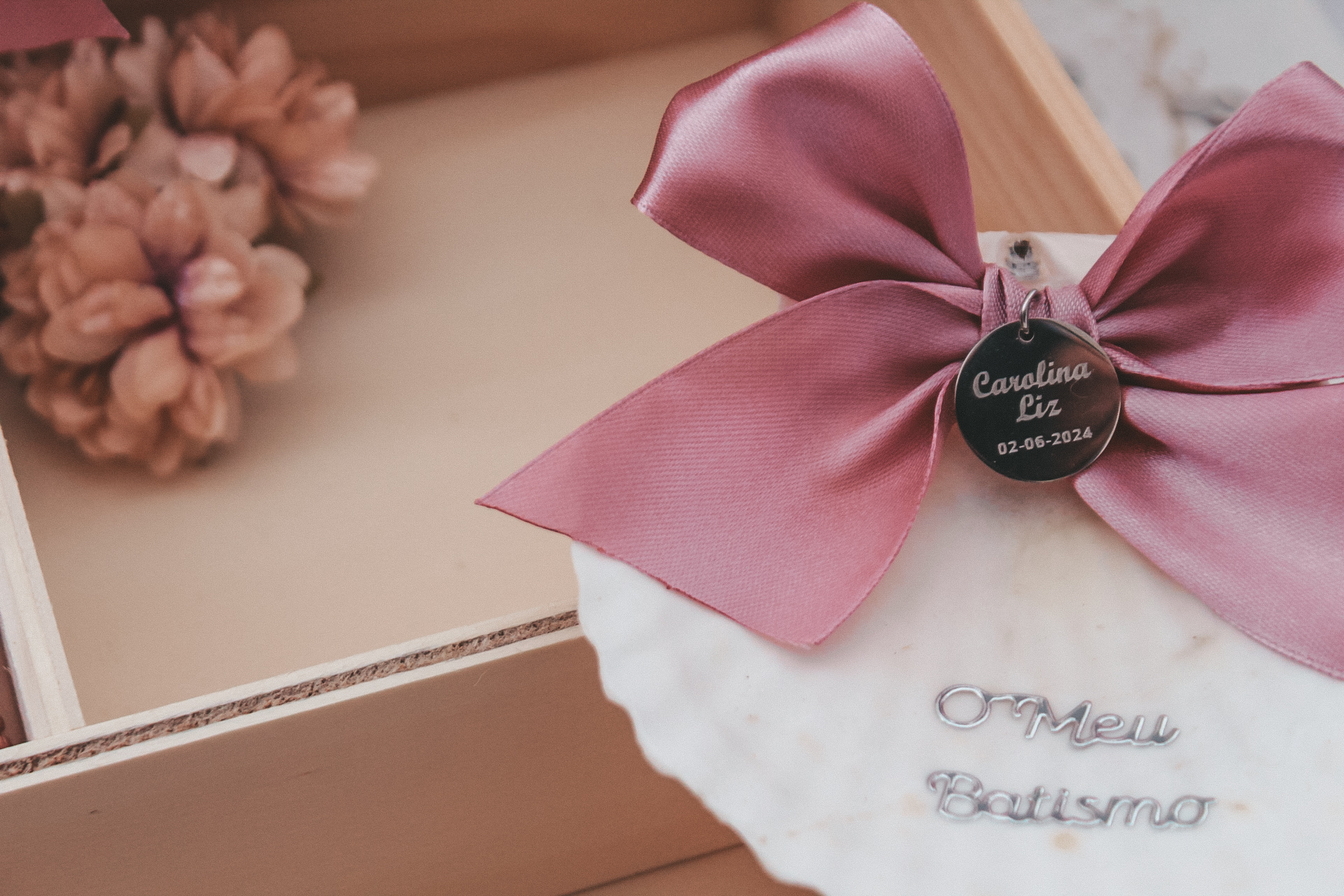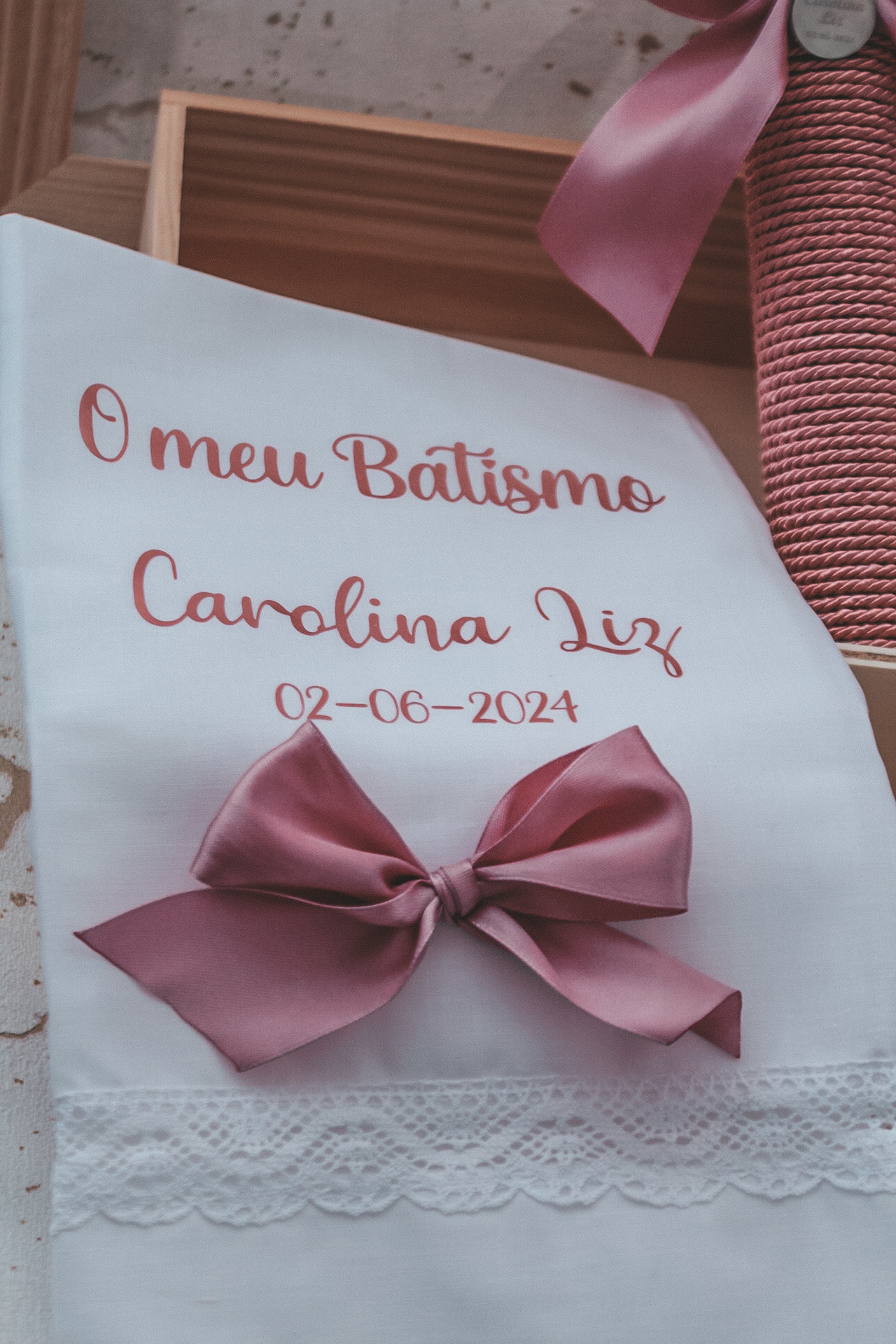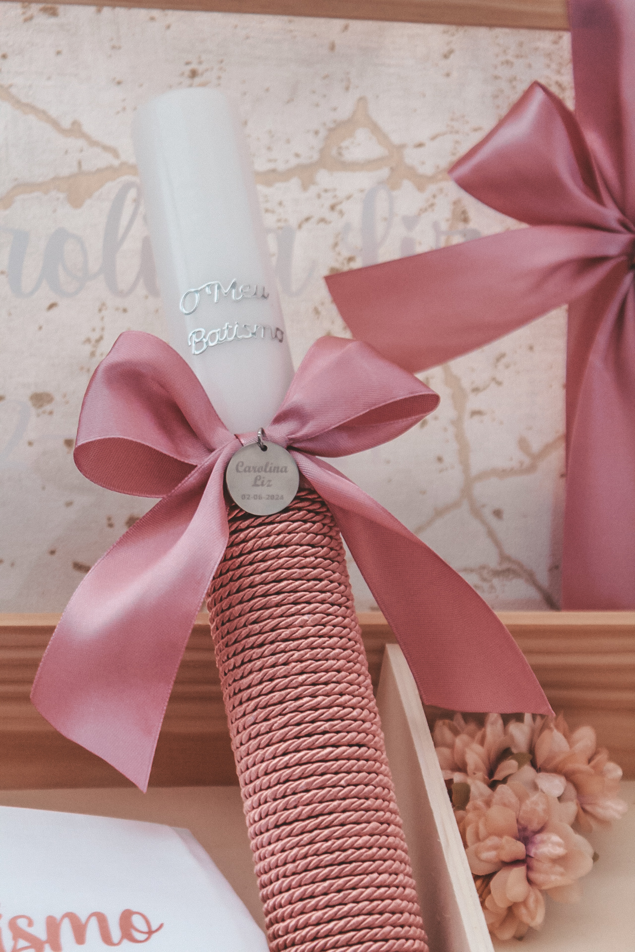 • Caixa de madeira com tampa de vidro e laço rosa com velas, toalha e cartão de batismo