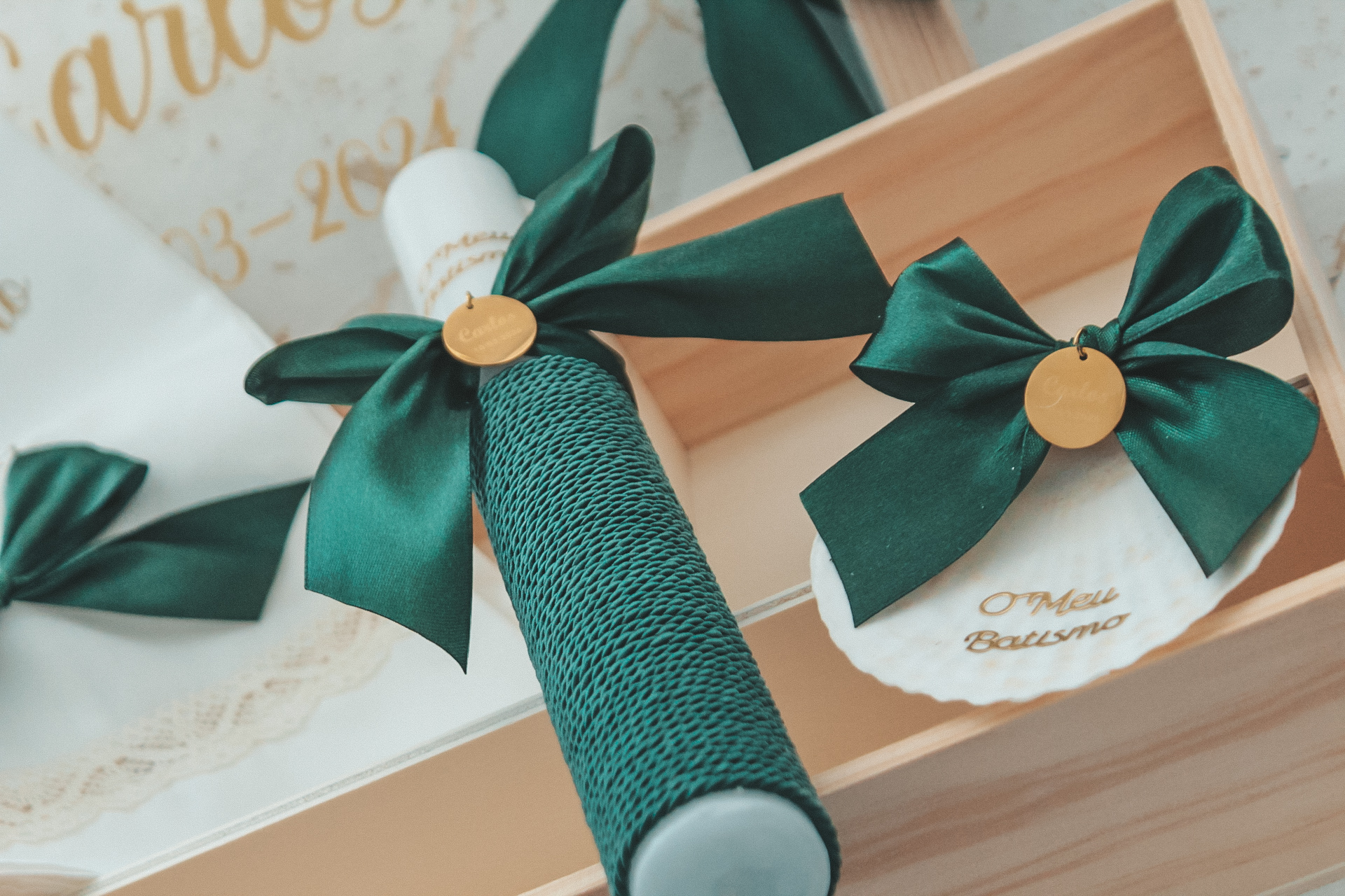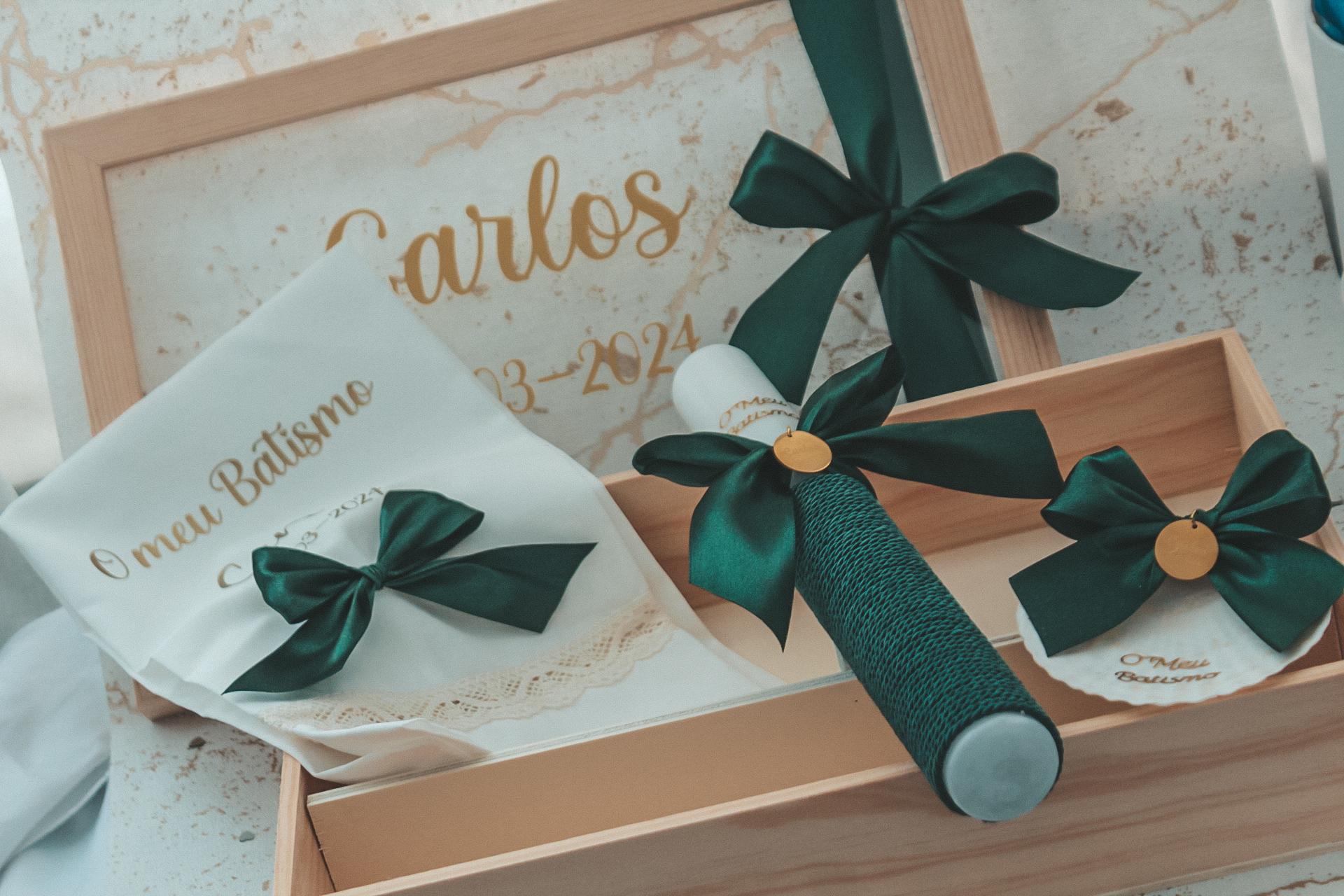 • Itens para batismo com lenço bordado, vela e caixas com laços verdes e fundo com nome Carlos.