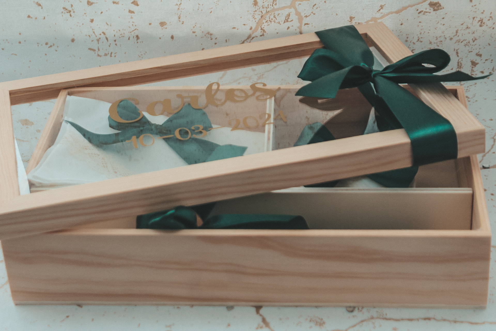 • Caixa presente madeira clara com tampa vidro e fita verde escura
