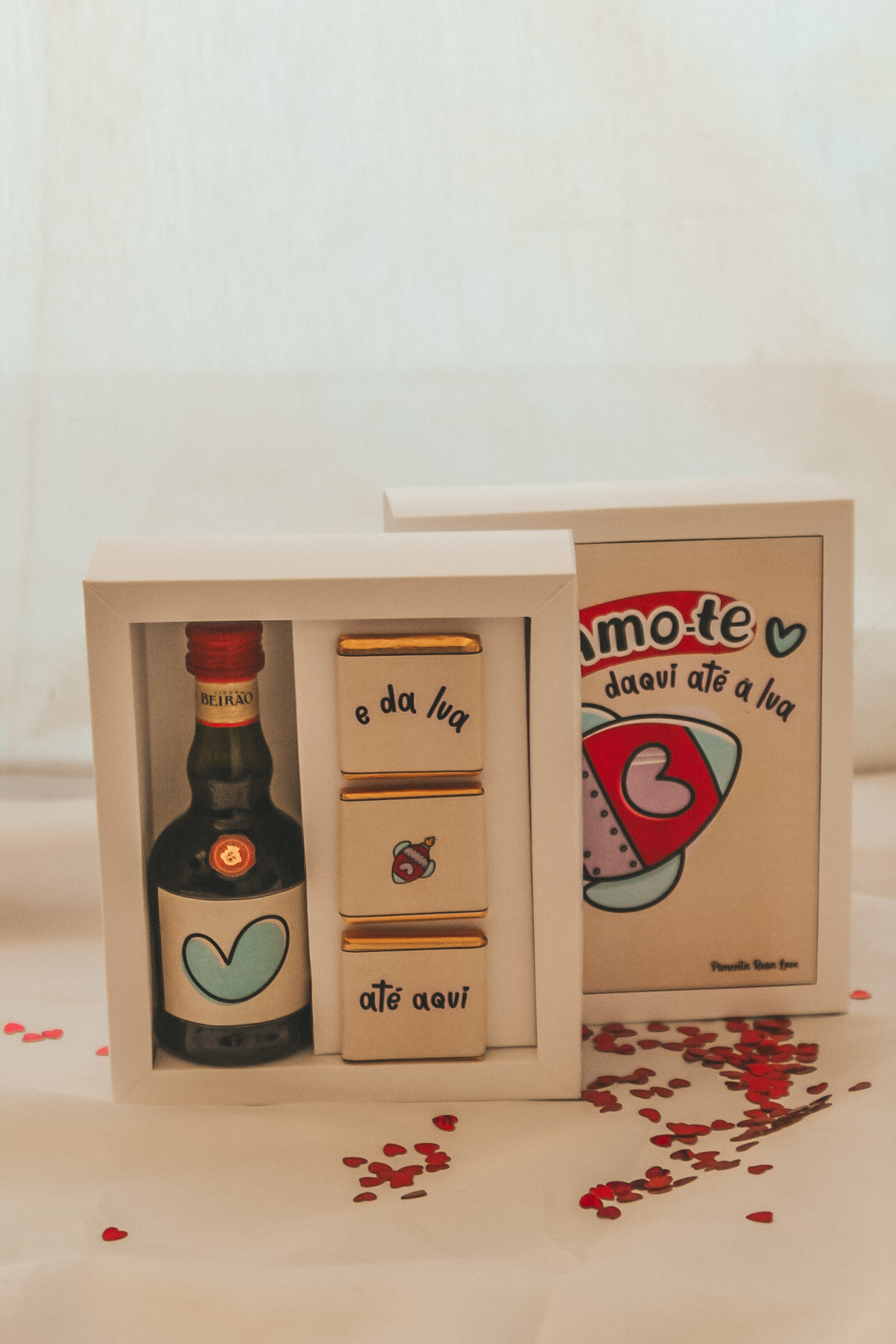 • Conjunto com garrafa, barras de chocolate e caixa ilustrada com texto romântico