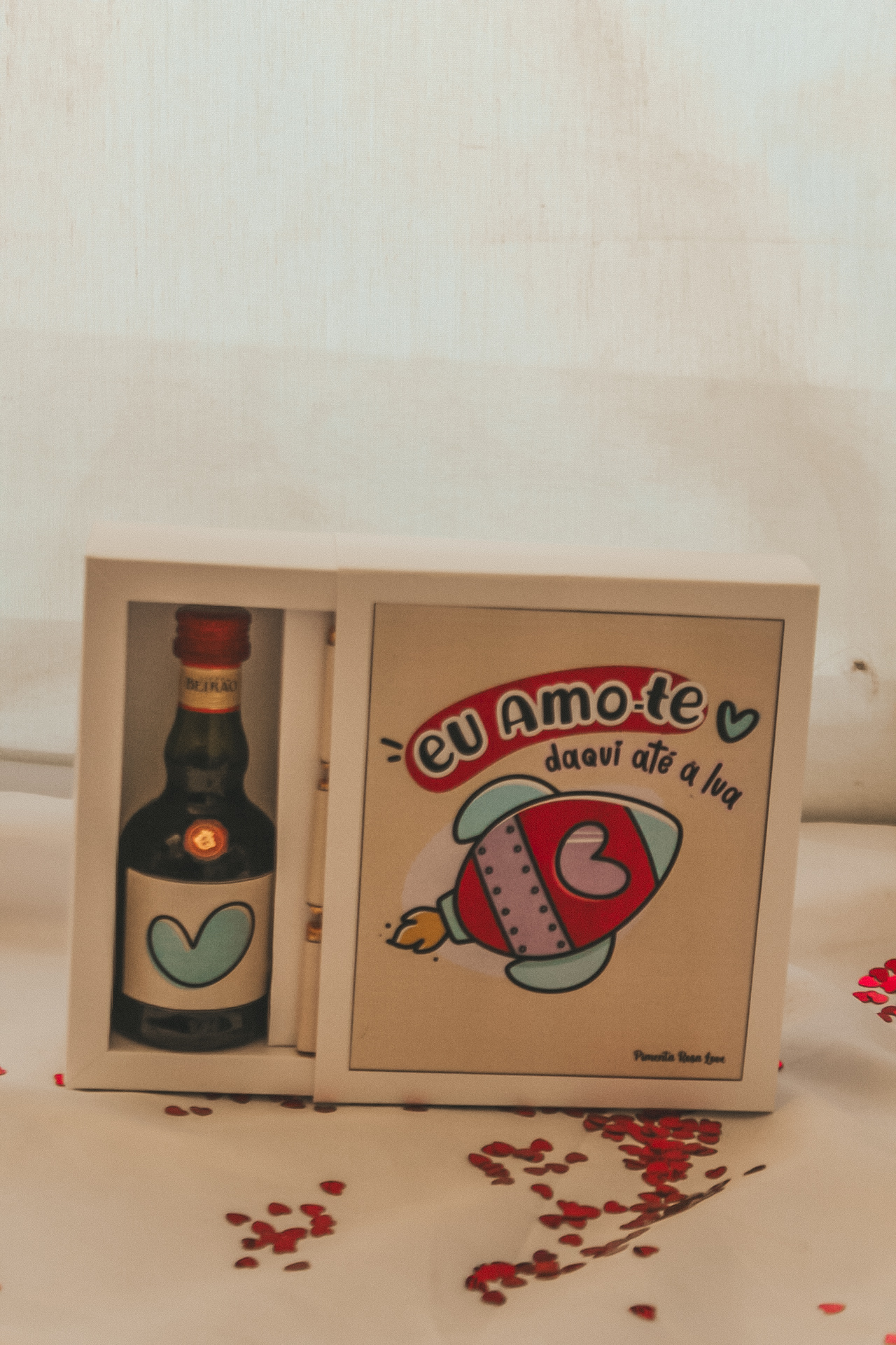 • Caixa com ilustração de foguetinho e texto em português com corações vermelhos