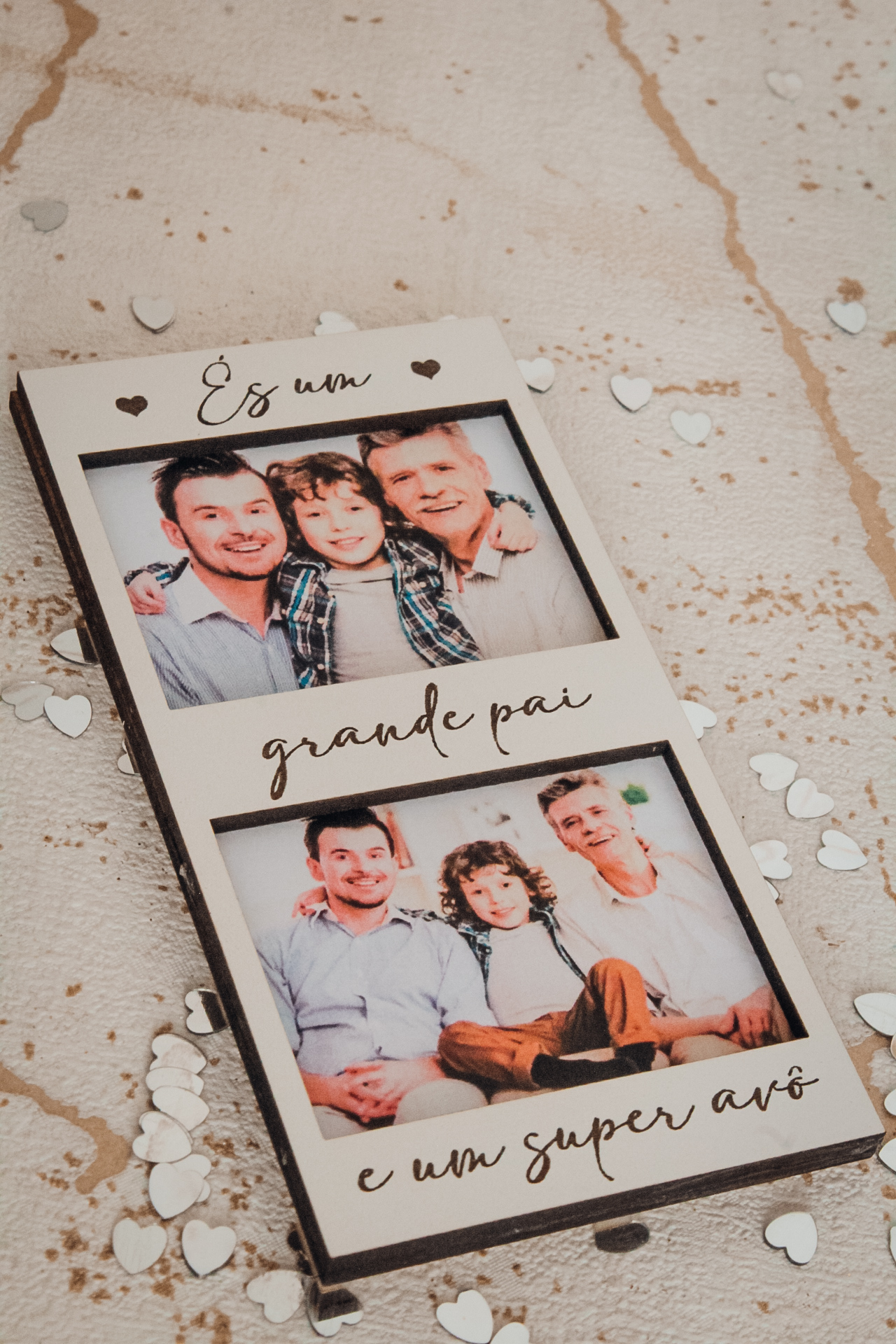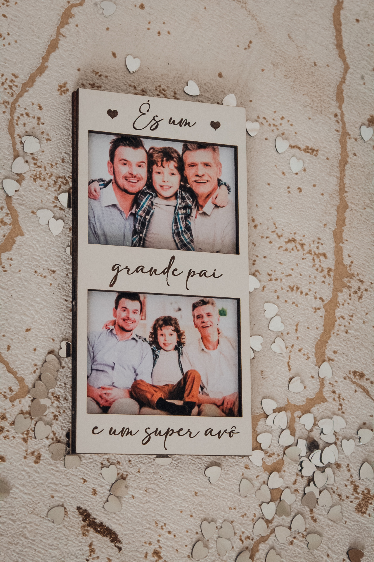 • Placa decorativa com fotos de família e texto em português rodeada de corações brancos