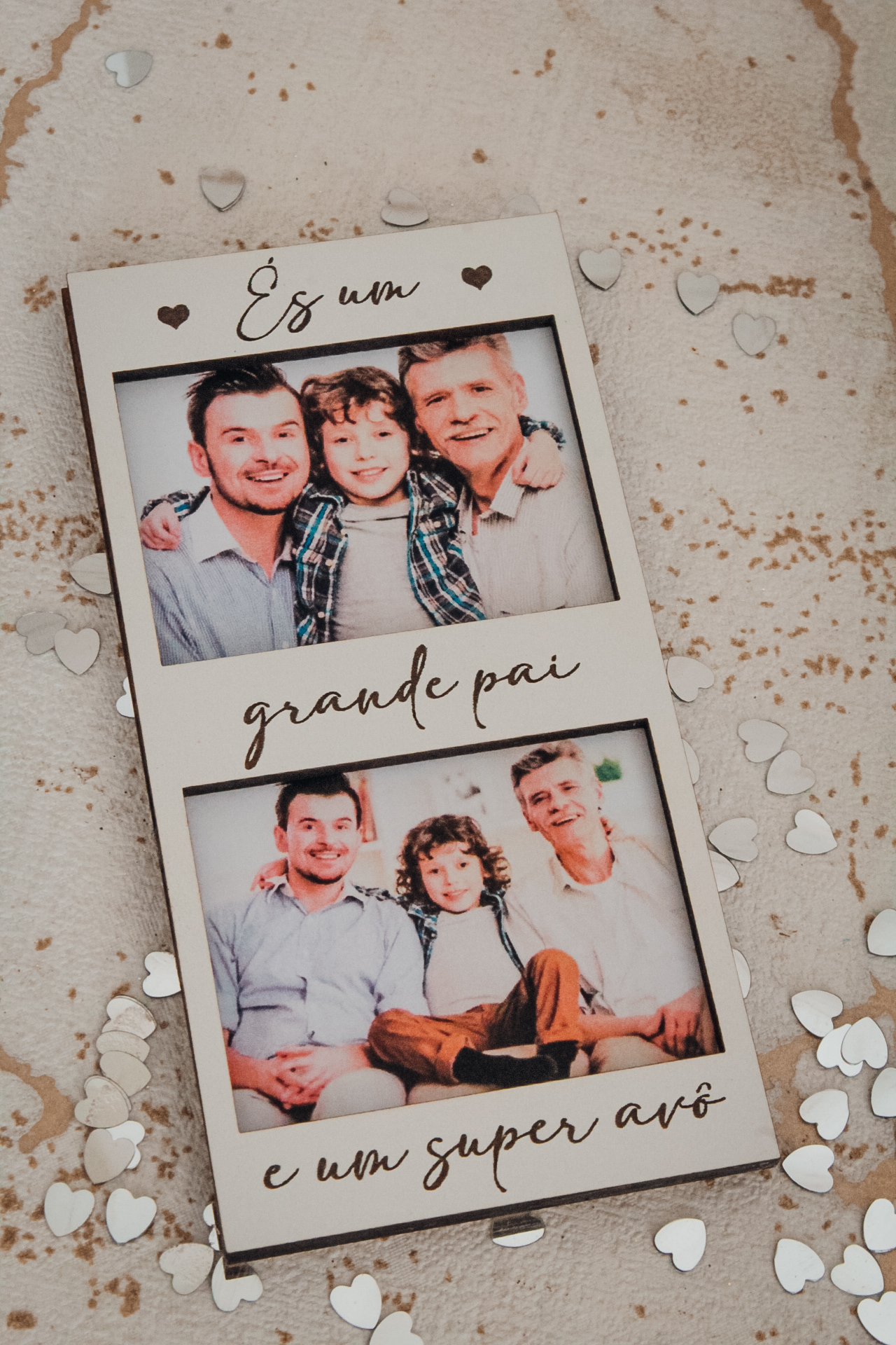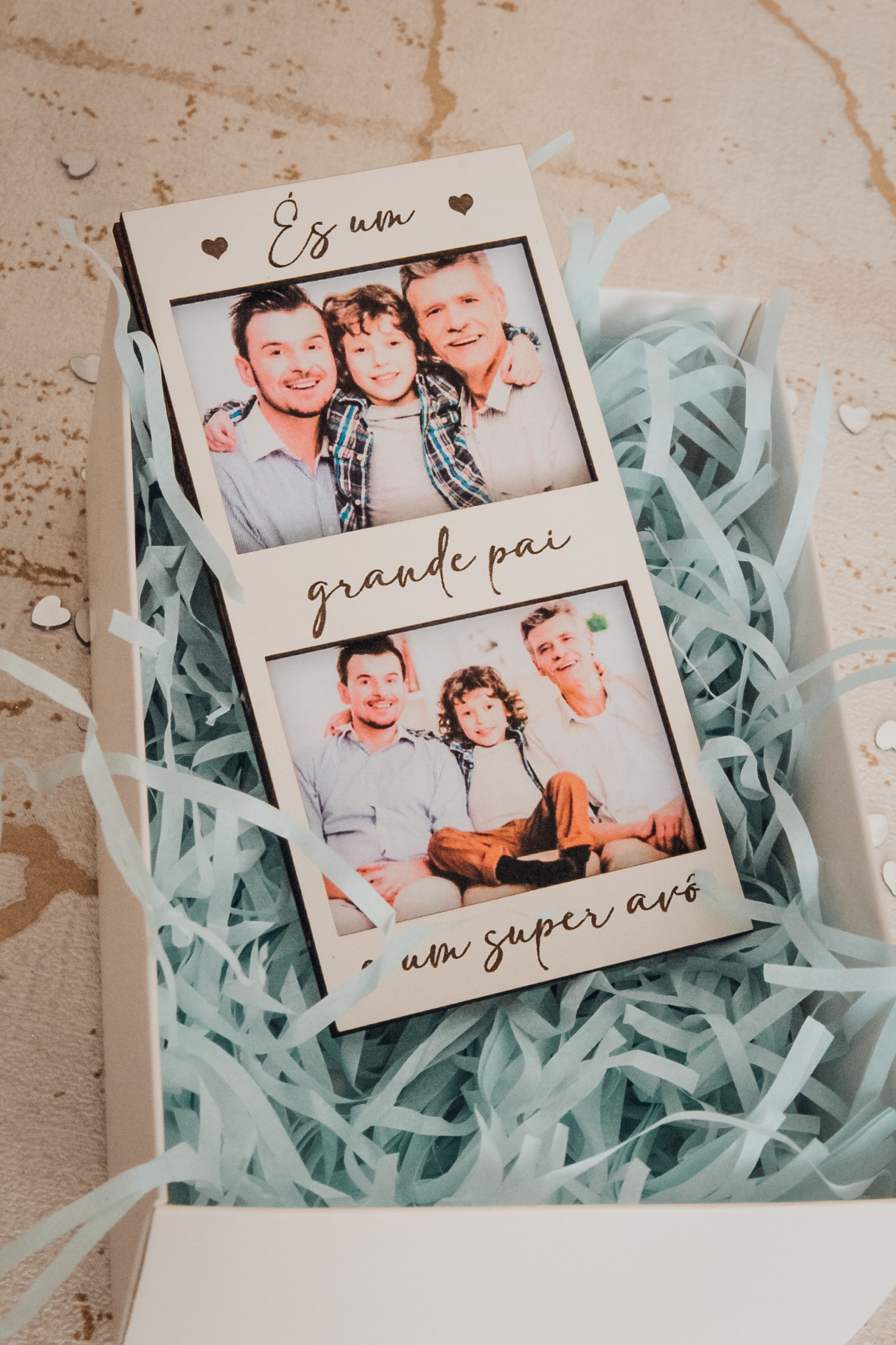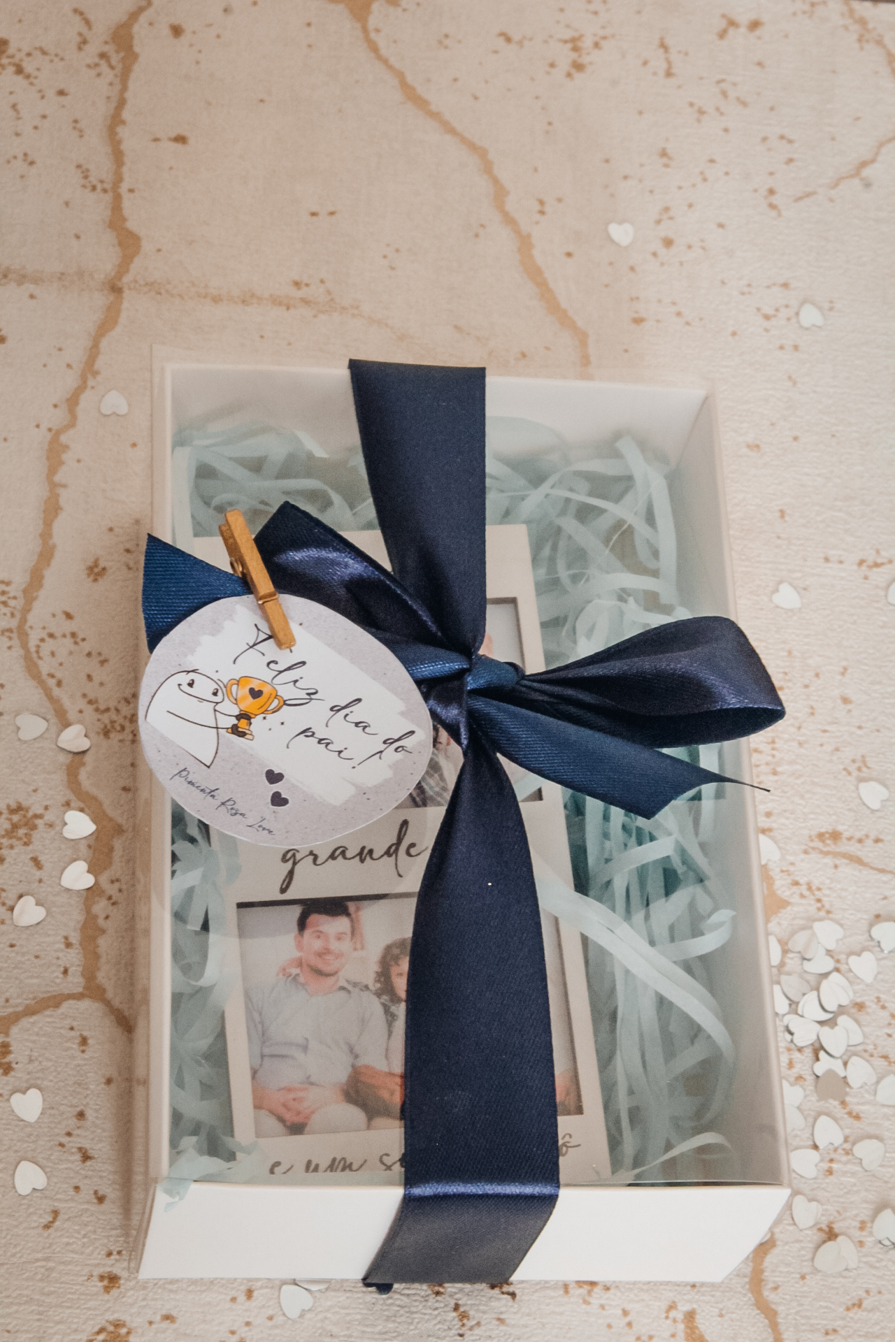 • Caixa branca com fita azul, cartão com texto dia do pai, moldura com foto dentro.